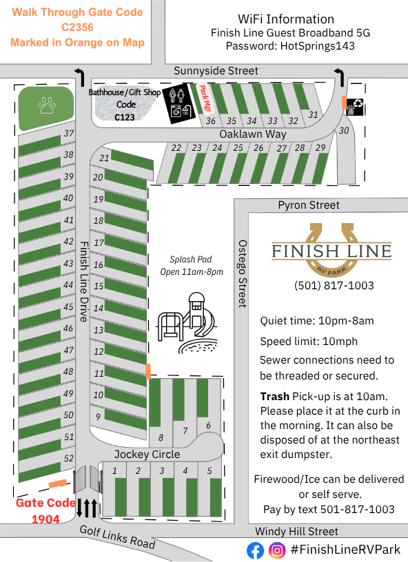 Bike to bathhouse row or the National Park. Walk to Oaklawn Casino or Greenway trail. Gated Park with concrete pads, full hook-ups, free Wi-Fi. Call your friends, leash up the pup, and get ready to enjoy a unique stay in the heart of Hot Springs! At Finish Line RV Park, we offer a premium camping experience with: 🌟 Upscale, Concrete RV Pads šŸ› Immaculate, Spa-Like Bathhouse šŸŽÆ Outdoor Pavilion with Horseshoes & Cornhole šŸ”„ Fire Pits & Picnic Tables at Every Site 🐶 Large Dog Park with Shade & Room to Run šŸ’» Free Wi-Fi 🧺 Modern Laundry Facility Enjoy curbside trash pickup, ice, firewood, and yard games delivered right to your site! šŸ“ Just 1 block from Oaklawn Horse Track & Casino šŸš¶ā€ā™‚ļø Only 2 miles to Bathhouse Row and a 5-minute walk to Greenway Trail šŸ“Œ Close to 3 mines for digging diamonds, crystals, and gems! Please Note: 🚫 No tents or car camping permitted. āœ… RVs must be in good condition šŸ›‘No homemade RV’s OR Schoolies