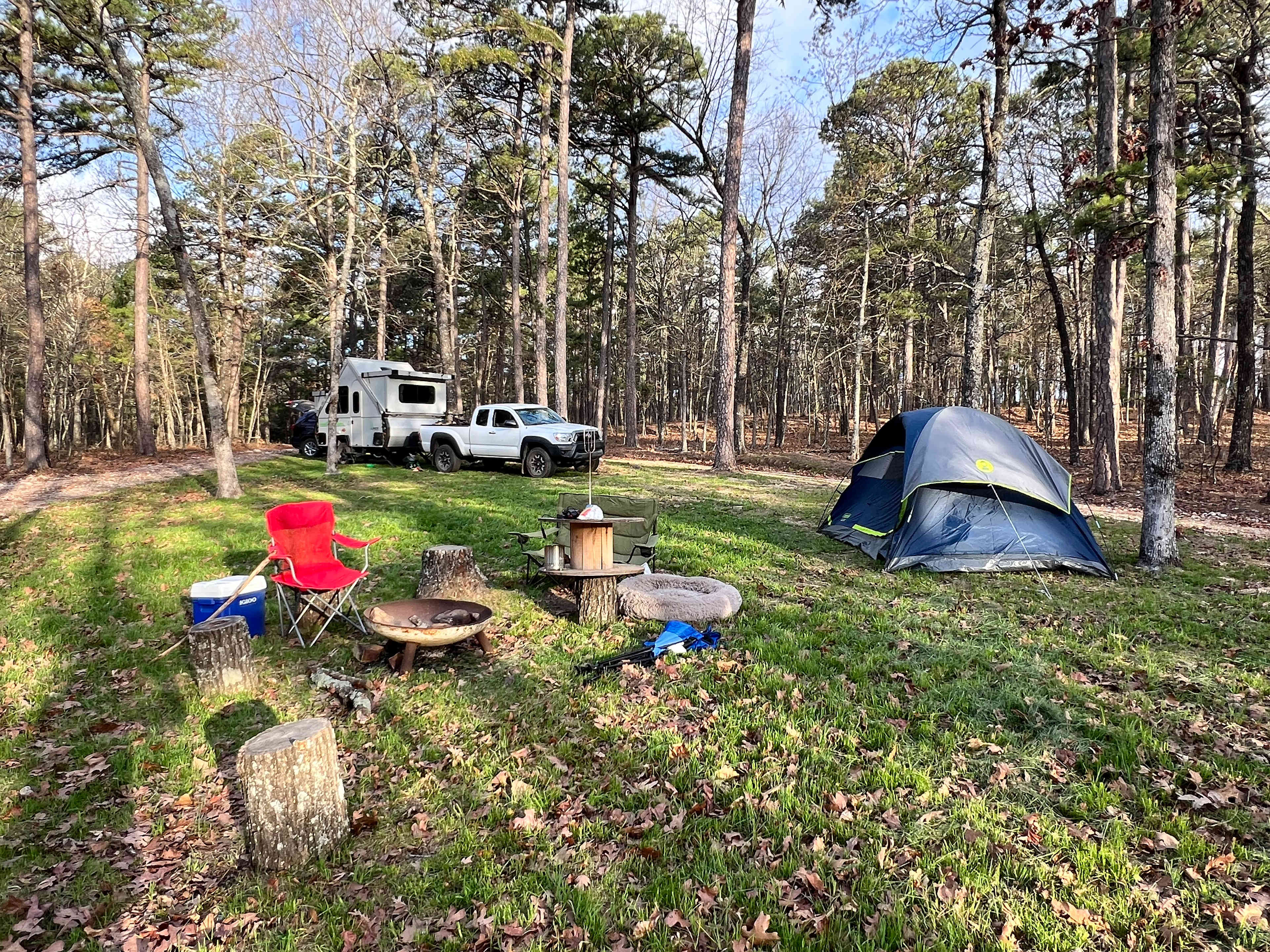 This remote primitive campground is between Compton & Kingston, Arkansas in the Ozark Mountains and region of the Boston Plateau. Its 14 acres of bliss nestled just above a scenic bluff looking south. You can set your tent on our grassy knoll or find a random spot amongst the short leaf pines or hardwoods. There is a back-in space with deck if you have a RV or trailer.