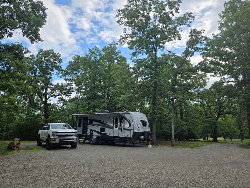 We are located on a peninsula of Norfork Lake. There is a gravel road next to our property that leads 0.8 miles to the lake. We are close to hiking trails, George's Cove Boat Launch, and countless places of interest around Mountain Home and Mountain View, Arkansas. A gravel pad with water and 50-amp service is available, as well as several more rustic locations set farther from the house. We host self-contained RVs only. No tents, cargo trailers, truck toppers, or cars. Your rig must have a working bathroom and be in good condition.The gravel pad has a 50-amp electrical connection and water from our private well. There is ample room to park your tow vehicle or towed vehicle beside your RV. You should be able to connect to our Wi-Fi. If not, many guests have had no trouble getting cellular service. The pad has easy access from our gravel drive with plenty of room. We have hosted 45' 5-th wheels and Class A with no problems.