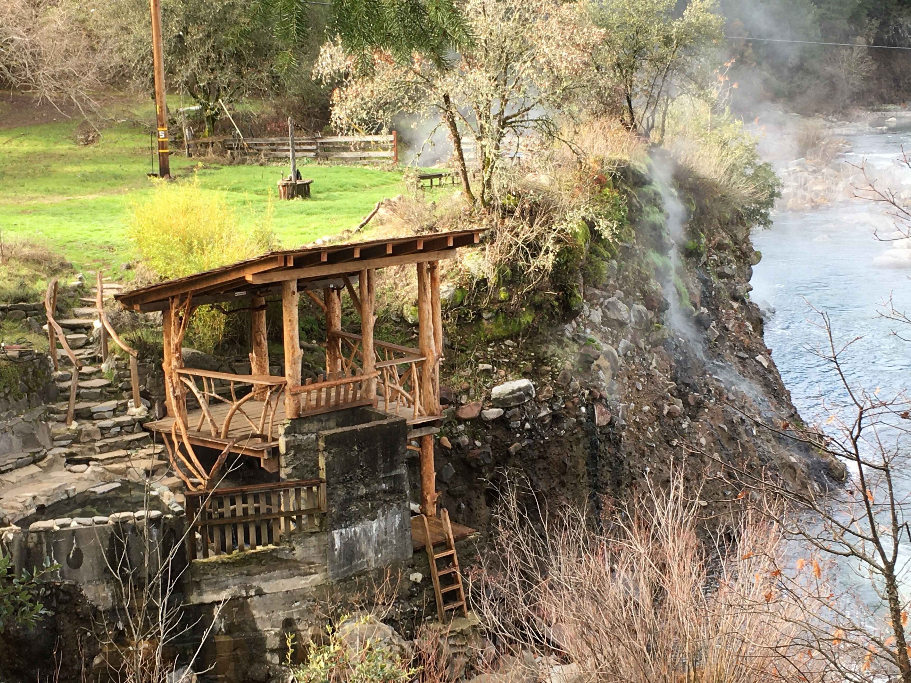 Big Bend Hot Springs is located in Madesi Territory, in the town of Big Bend, in Shasta County, northern California, USA. The site has extraordinary riparian forests & geothermal springs on the banks of Ahjoomah (Pit River), between two Cascade Range volcanoes, Mt. Shasta and Lassen Peak. Important News: Big Bend Hot Springs is currently CLOSED until further notice. We are working hard on the process of completing a huge list of Shasta County-required permits, repairs, and code upgrades. Please send us your ideas. BBHS is in a big transition phase, so please stay tuned and thanks for your patience!