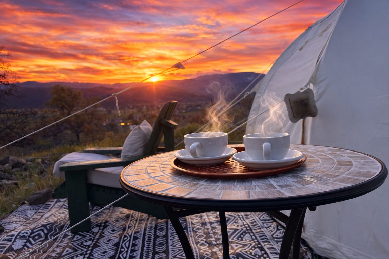 Astral Dome Stargazing Dome Pano View! Woodstove! Tub! Dogs Welcome! Outside soaking tub with on-demand hot water — soak under the galaxy and moon with panoramic View on a Volcanic Mountaintop Farmstay • Near Harbin Hot Springs, Napa Valley. Sleep beneath vast dark skies on a 5-acre organic mountain ranch high above Napa Valley and Lake County wine country. Hidden Knoll sits along the rugged Mayacamas Mountains, surrounded by oak forest and open wilderness. From the top of the stunning volcanic peak, are sunrise and sunset views across the entire mountain range. At night the sky transforms. With almost no light pollution, Milky Way is clear overhead, making this land an exceptional place for stargazing. From the Astral you can see: • Mt. St. Helena • The Mayacamas Mountains • Harbin Mountain • Steam rising from The Geysers, the largest geothermal field on Earth Located just 8 miles from Harbin Hot Springs 16 miles from Napa Valley’s famed wineries, a peaceful mountain retreat close to hot springs, organic farms,, hiking, lakes, and wilderness. Friendly free-range chickens wander the property, and well-behaved dogs are welcome on and off leash. The Astral Dome is a modern glamping dome designed for comfort while still feeling immersed in nature. • 13-foot dome with clear skylight panels • Queen bed with quality linens and heated mattress • Wood stove for winter • Electricity for device charging, in tent WiFi • private picnic area, hammock • stone fire pit, The dome is 150 feet from our farmhouse, offering privacy and quiet. Outdoor Soaking Bath Just steps from the Astral is our guests’ favorite experiences — a cowboy bathtub large enough for two with on-demand hot water heater under stars! The tub sits inside a bamboo enclosure with curtains for privacy or open wide to reveal sweeping mountain views. A hot outdoor shower and organic amenities nearby as well. Shared Amenities • Outdoor kitchen with grill, sink, fridge, and WiFi • Seasonal splash pool (May–October) • Chiminea fire area • Organic garden, eggs, mineral well water, The Experience Mornings begin with coffee in your tent and birdsong. Hawks circle above, the scent of oak and warm earth rises from the hillside, and evenings bring glowing sunsets and the galaxy, and firelight..