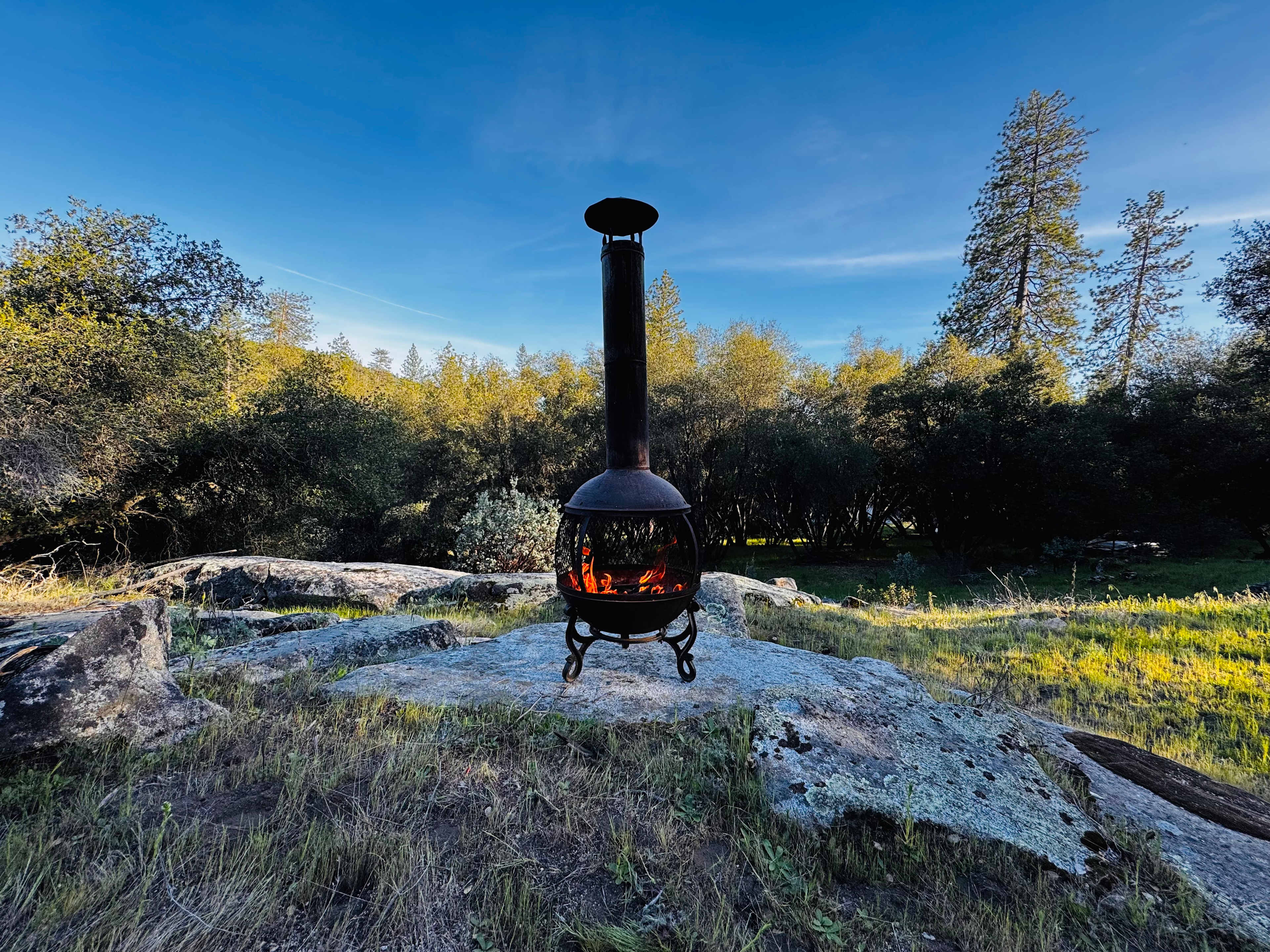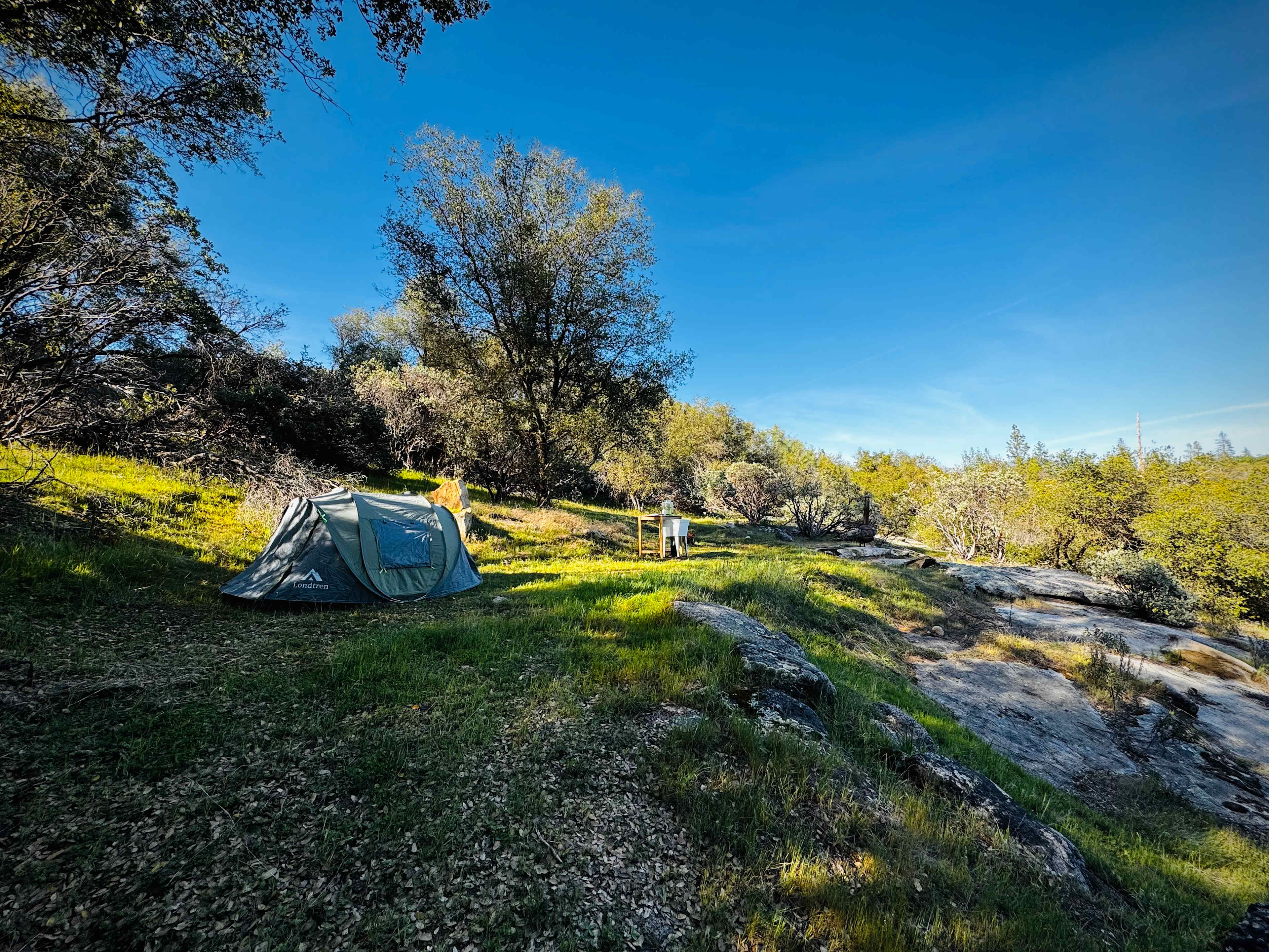 This is a fully private drive-in site. No shared paths, no neighboring tents, no one walking through. Just a granite outcropping with sunrise views, open sky, and endless stars. There is a private trail leading two minutes down to community river filled with hidden swimming holes. Wake to first light warming the stone, spend the day lounging on the granite boulders, and end the night under a genuinely dark Sierra Nevada sky. There is a glass water tank and sink to wash your dishes, a compostable toilet, a picnic table and fire pit. Fires are welcome when the fire ban is not in effect. Yosemite's Hwy 140 entrance is about 45 minutes away. Swimming is best late spring through mid summer. Dogs always welcome!