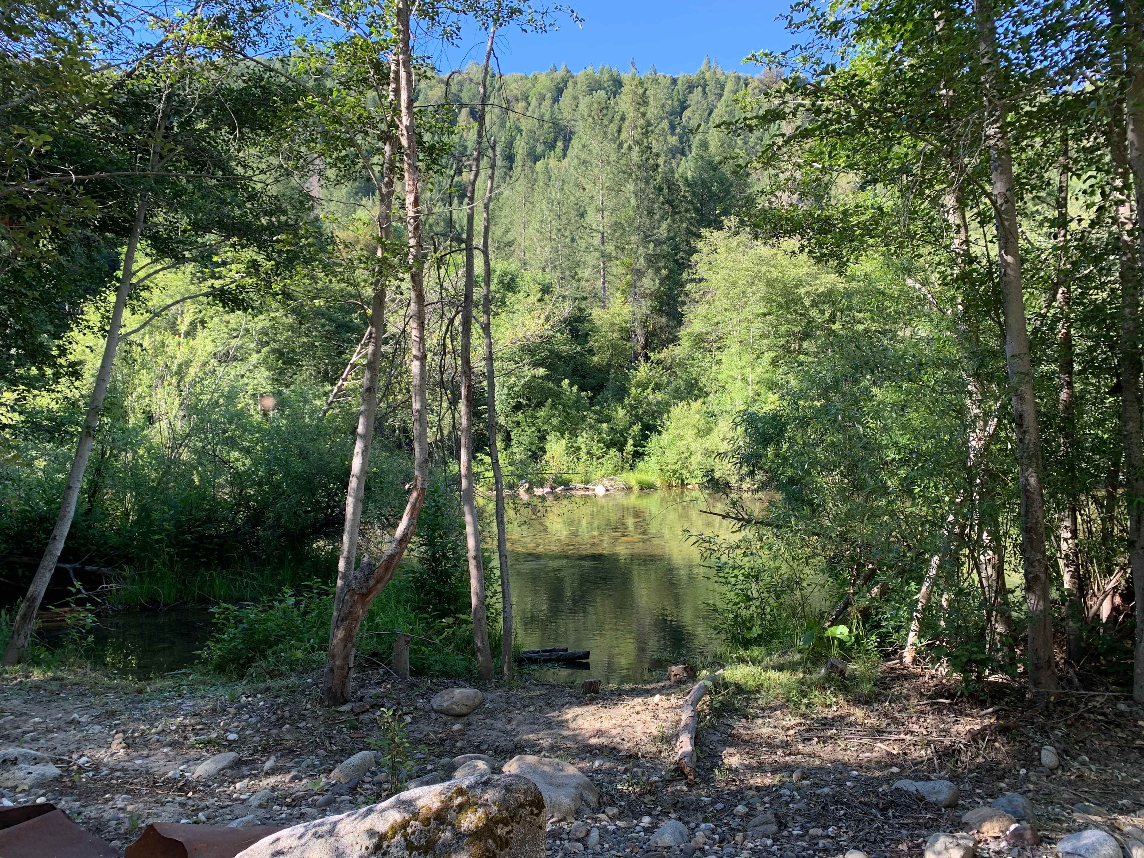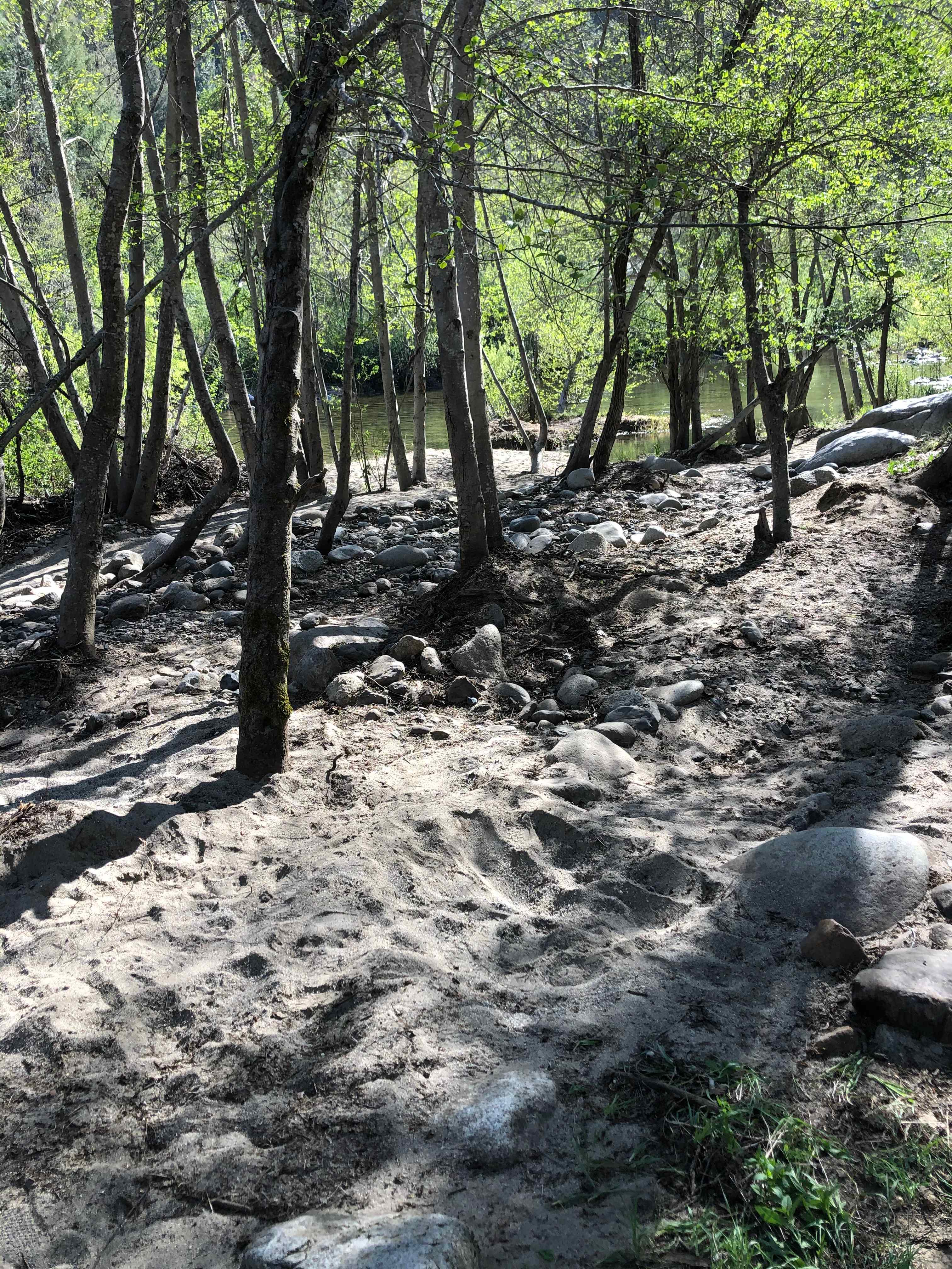 Just what our family needed... The campsite was right off the small road (which didn't seem to be heavily traveled) and had a large pad for parking, the campfire, our six person tent, and a large screen tent for our kitchen. And there was still PLENTY of room. This site would accommodate a larger party and/or multiple families. There was a nice port potty, which was well lit, and came in handy for the kids. Then, there is just a short walk down the path to the private river access. Truly... the river was shallow, approximately 2 feet, and had calm areas and one faster moving area. It was clear that there had been work invested to make a gravel pathway (under the shallow water) out to "rock island".