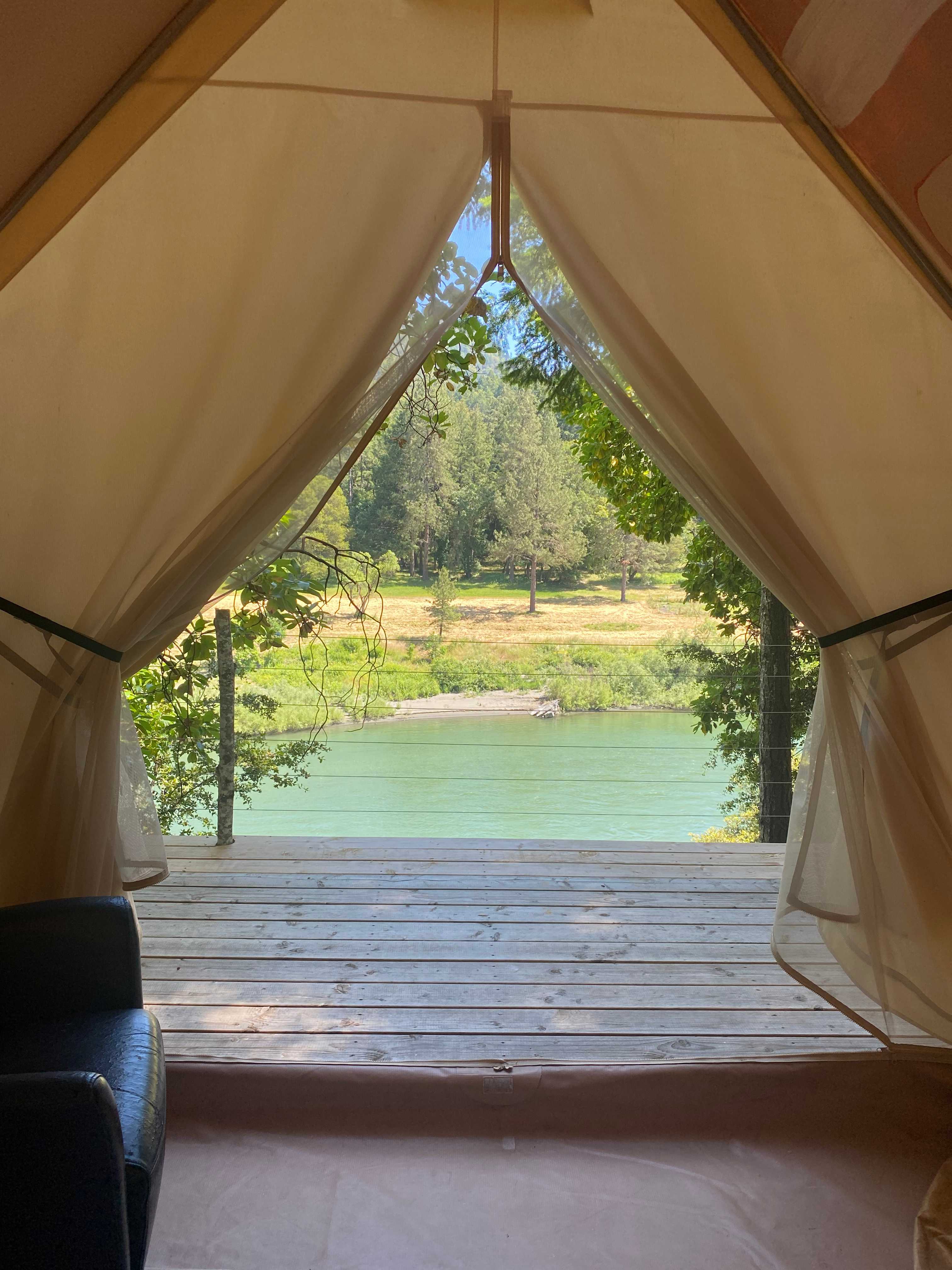 Heated! This tent comes with a heater to keep you nice and toasty in these winter months. Perched above the beautiful Trinity River, you will be the same height as the birds soaring. You can spot eagles and many aviary wonders. The canvas glamping tent is fit with a queen bed and coffee maker. Waking up to the river view is magical. Let the river sounds lull you to sleep.