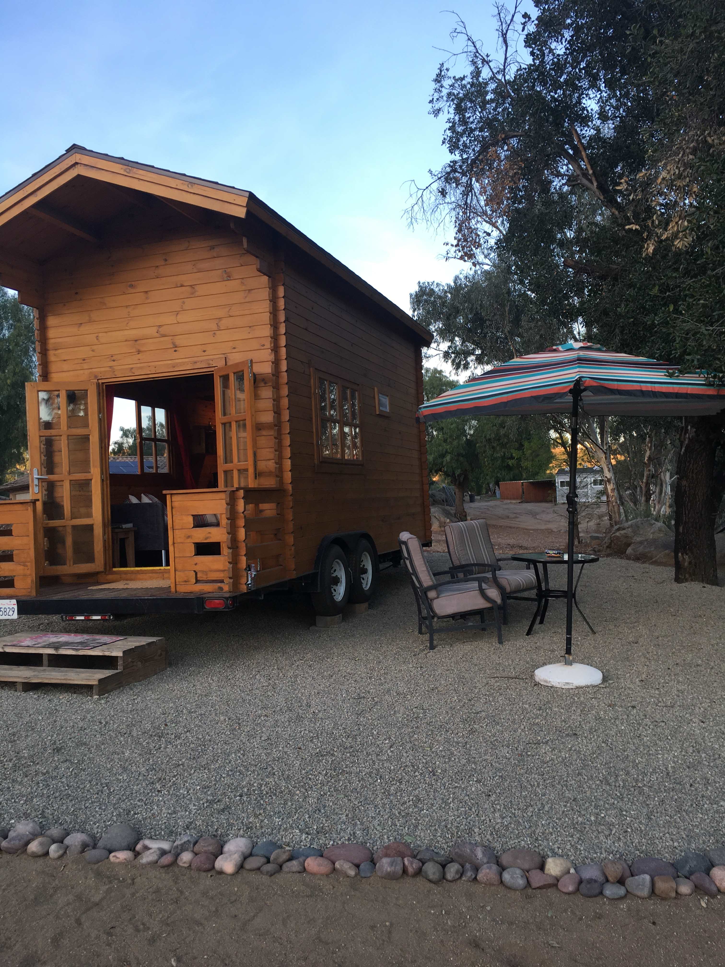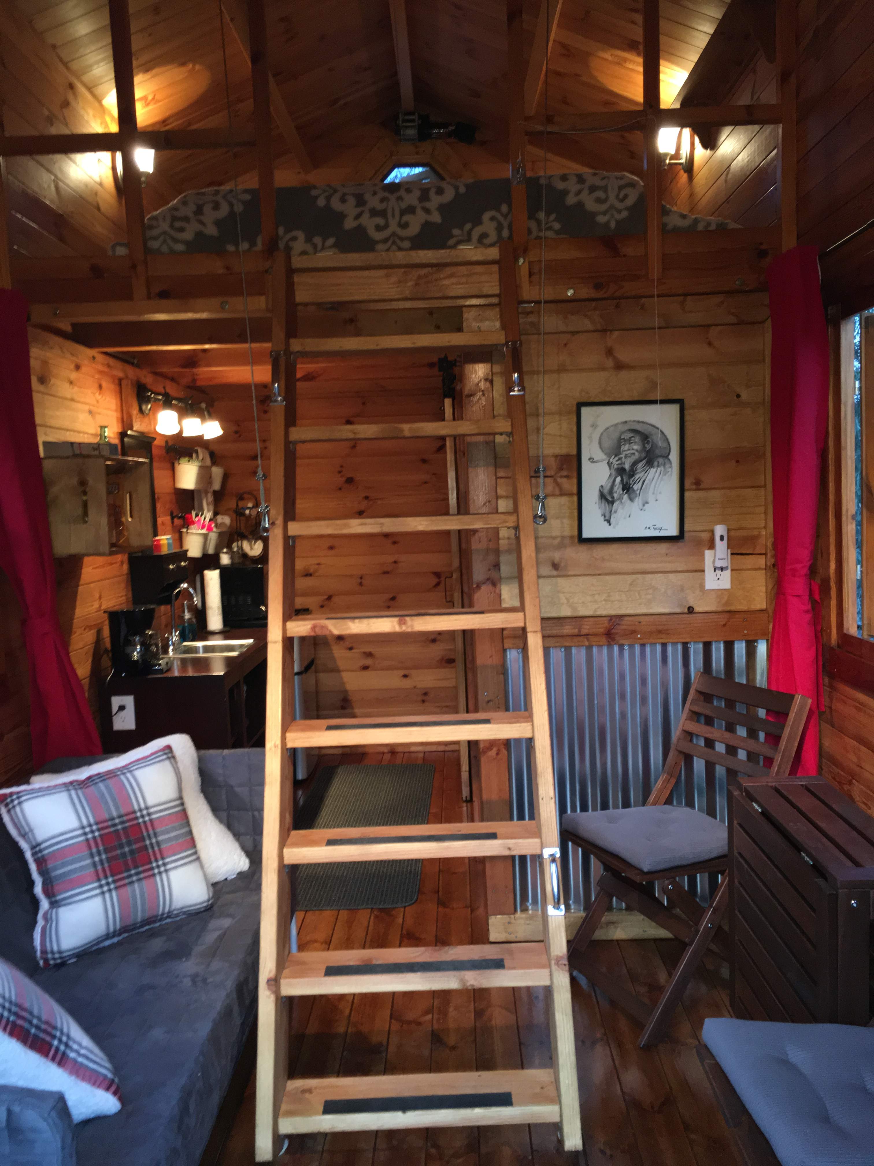 The tiny cabin is cozy and very nicely appointed as long as you are ok going up the sturdy stair-ladder to go to bed. Many things are supplied, so you don’t need to bring every little thing (silverware, paper towels, etc). We brought pool towels and floats but those were also supplied. This place has it all: Linens, bath towels, basic shower supplies, wifi, AC, etc. It has everything mentioned in the listing and more. Bring a propane tank & tongs to use the bbq and/or fire pit, which were in great condition.