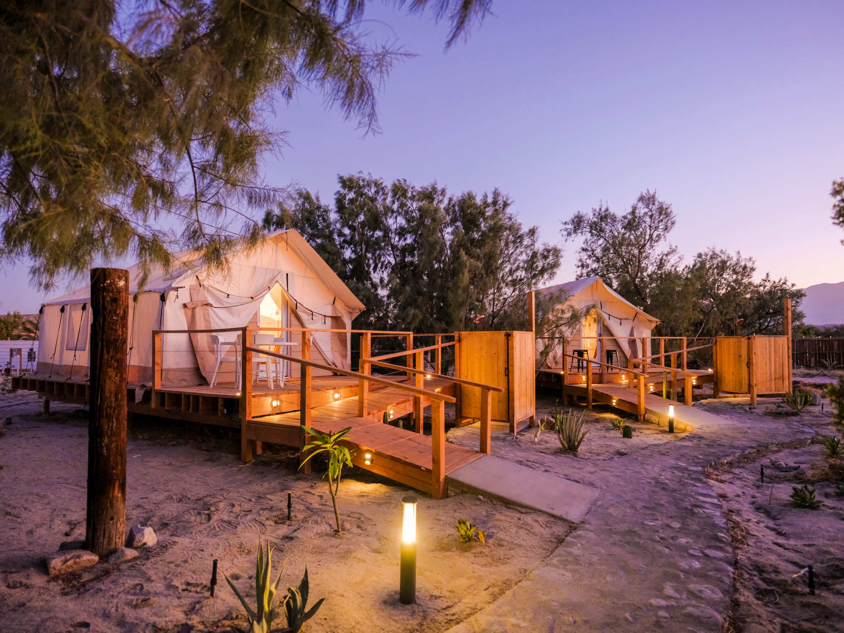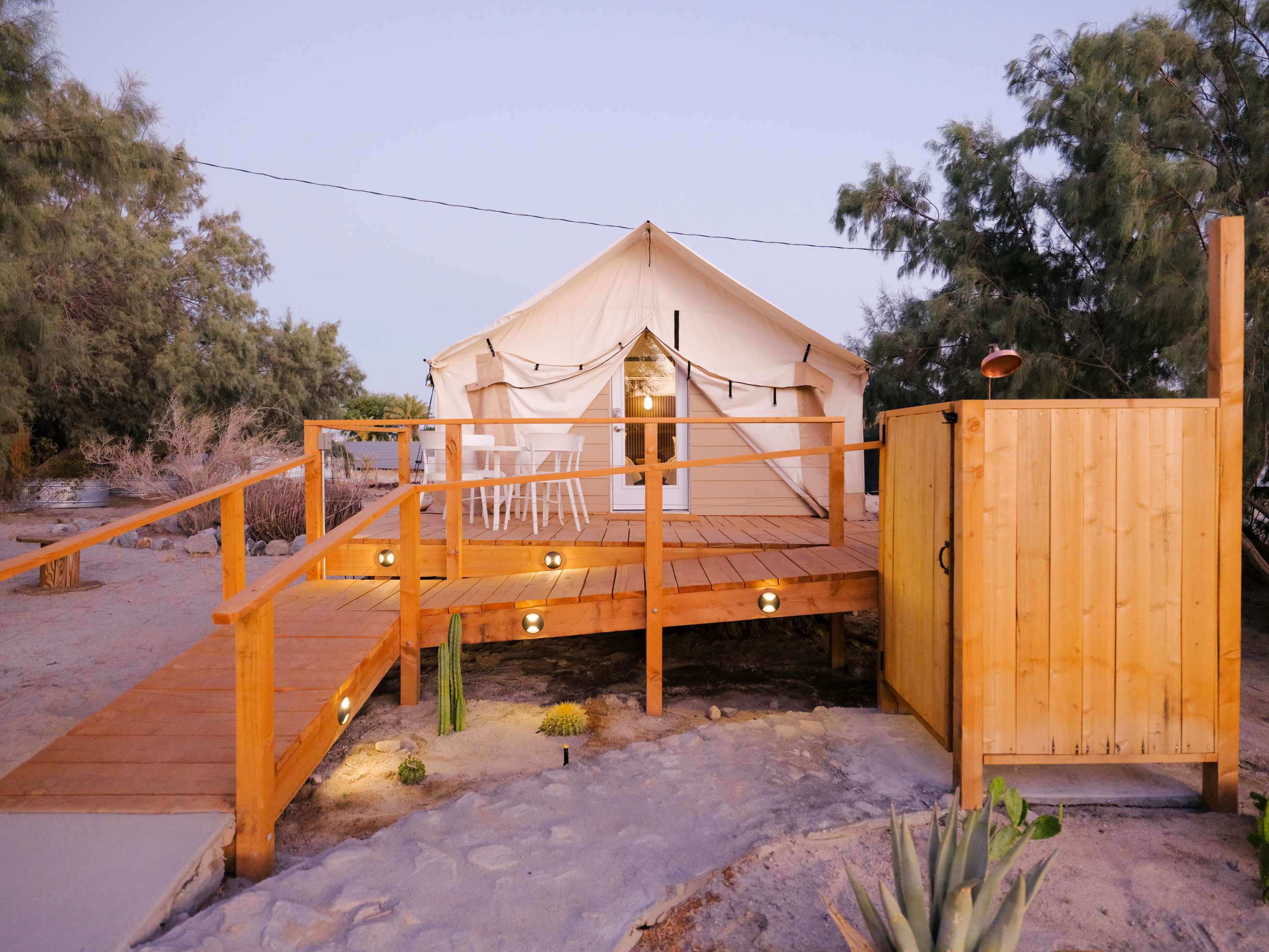 Sky Valley Oasis is a 2.5-acre Oasis located in Desert Hot Spring. Surrounded by farms, orchards, and nurseries, Sky Valley Oasis offers a unique experience for glampers and desert explorers. The Oasis boasts two glamping tents that can accompany up to 6 guests. Each glamping tent has an assigned private bathroom with traditional hot and cold plumbing. There is a communal kitchen that has everything you will need prep and cook your meals. For a more traditional lodging, the Adobe can accommodate up to 4 guests and a cabin that's perfect for 2 each with its own thermosiphon hot tub (wood burning). The property has a lot of cacti, trees, and palms that offer plenty of shade. Mineral water soak tubs and hot spring style dip pool is perfect to cool off. Other amenities include gas BBQ, gas firepit, hammocks and lots of outdoor lounging options .