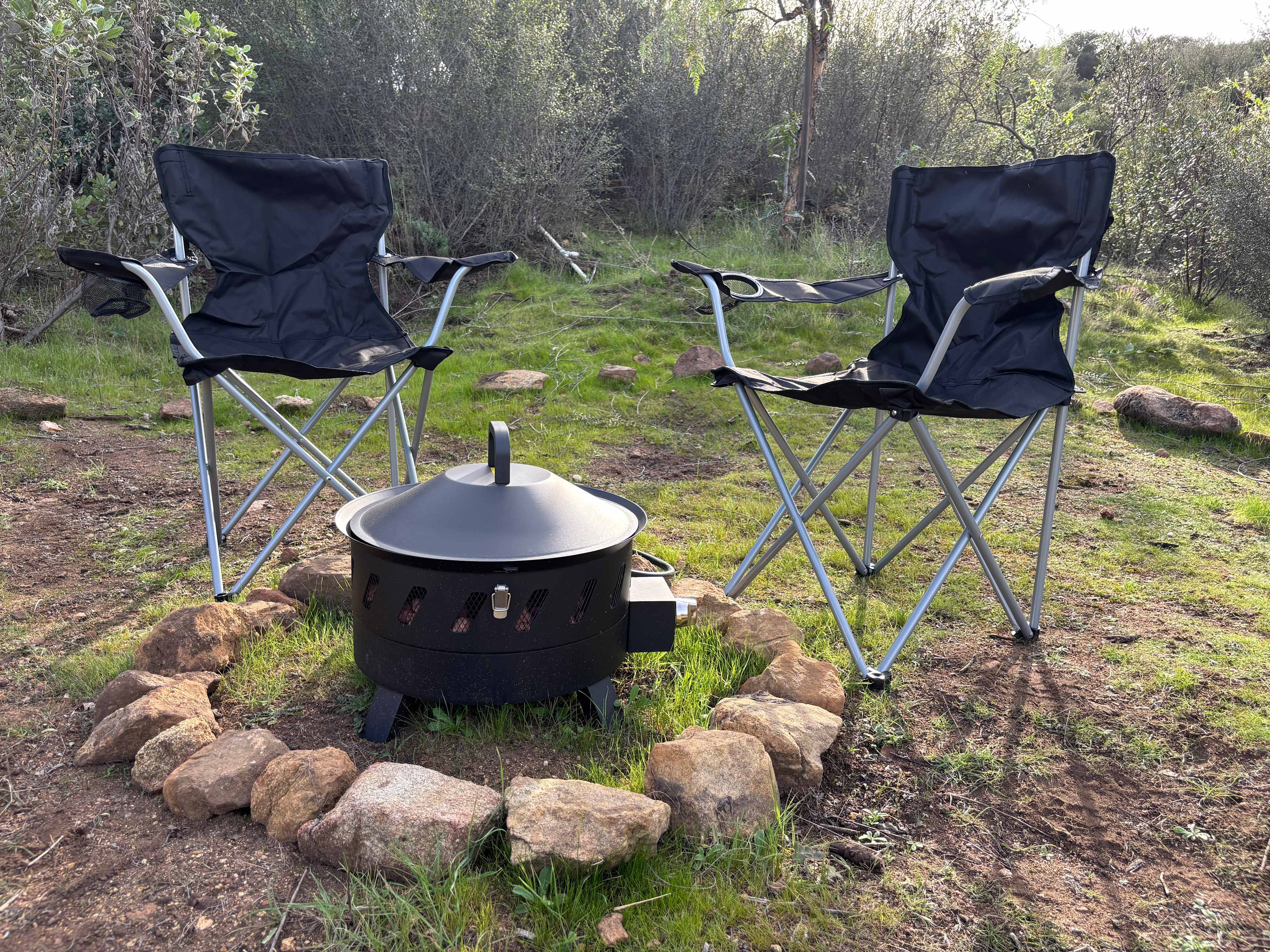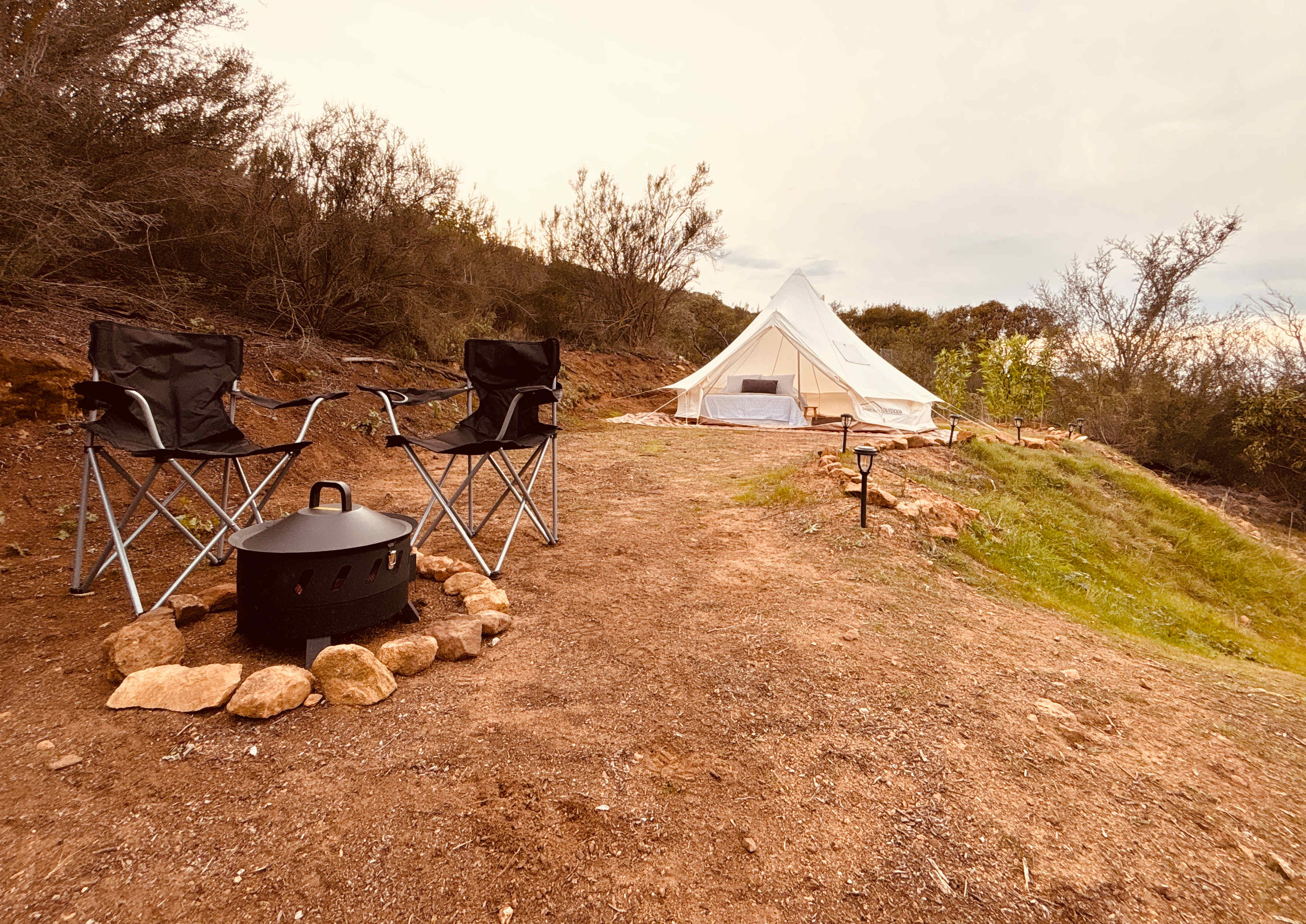 Meadow Site – Comfortable, Fully Equipped Campsite for Couples & Small Families The Meadow Site is a peaceful, thoughtfully set-up campsite on our quiet property in Jamul, offering open space, privacy, and a relaxed, easygoing camping experience. It’s ideal for couples or small families (up to four guests) who want the feel of camping without the stress of packing everything. This site includes a spacious bell tent set on level ground, with room to relax both inside and out. Inside the tent, you’ll find comfortable sleeping arrangements for two adults, with additional fold out full size mattress available for children. Cozy rugs, soft lighting, and simple seating create a warm, welcoming space to unwind at the end of the day. Outside the tent, guests have a private picnic table, a separate prep table for cooking, camp chairs, lanterns, and a fire pit for meals, conversation, and stargazing. The site is well lit in the evenings, creating a warm and comfortable atmosphere after dark. What’s Included This site is fully equipped, so guests typically only need to bring food, clothing, and personal items. We provide: Cooking • Camp stove, grill and cooking equipment • Pots, pans, utensils, cutting board, and basic kitchen tools • Plates, bowls, cups, and silverware • Cooking prep table and picnic table Comfort Camp Setup - Propane heater for cool evenings - Camp chairs - Lanterns and ambient lighting - Clean towels and bedding Extras • Card games for couples and kids Amenities Guests have convenient access to a heated shower shed with sink and hot water, located along the path between the parking area and the campsites. • Enclosed shower space for privacy • Hot water available • Sink with drinkable water • Clean, well-maintained composting toilet nearby From camp, guests can walk to the on-property hiking trail leading to a scenic summit with panoramic views, as well as enjoy nearby hiking, biking, and horseback riding in the surrounding area. The Experience The Meadow Site offers quiet nights, open skies, and a comfortable, low-effort camping experience—perfect for guests who want nature, ease, and a peaceful setting.
