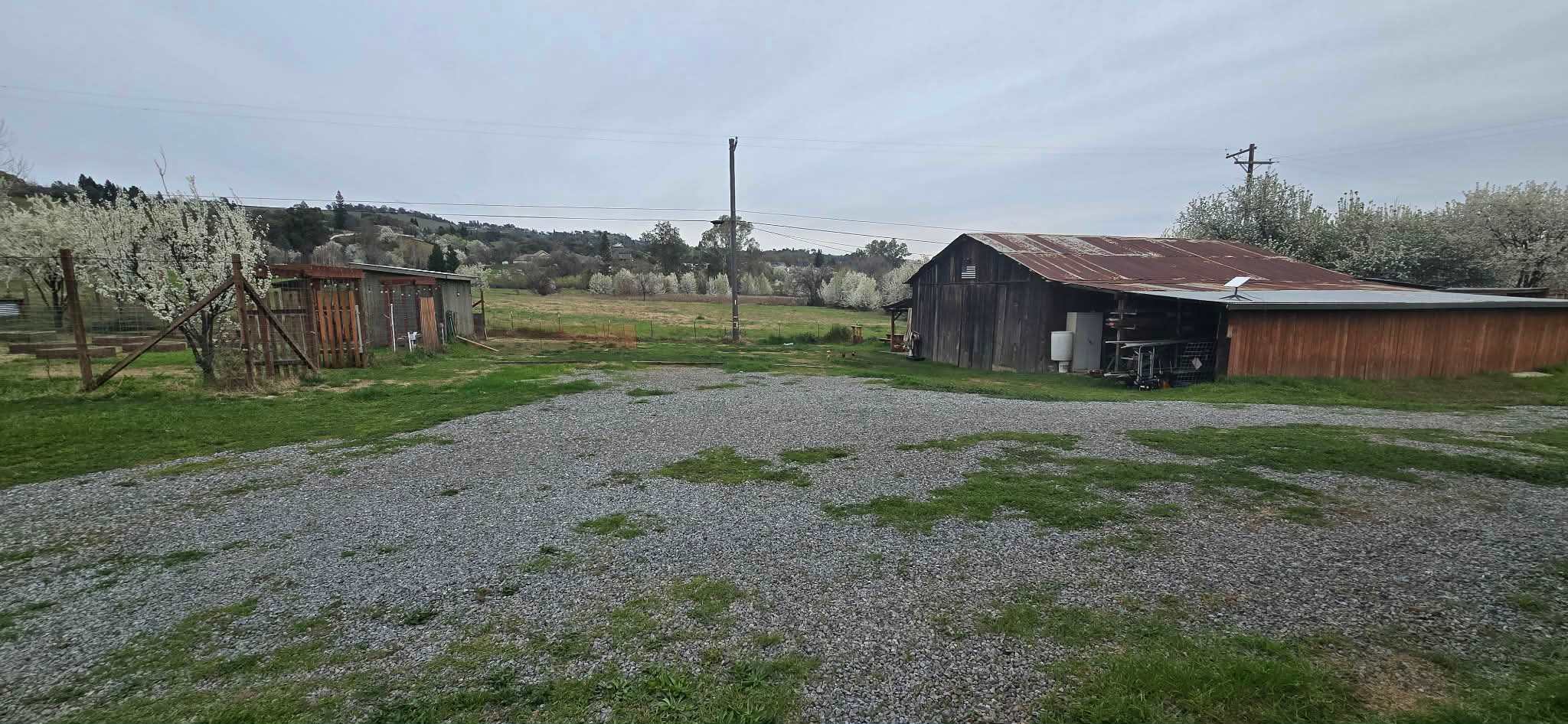 RV pull-through site with water and power (50 amp) available. Site able to fit up to 45 foot rig. Site located along side of large shop, overlooking garden, rustic barn and neighboring farm. Additional parking for extra vehicle near site if needed.