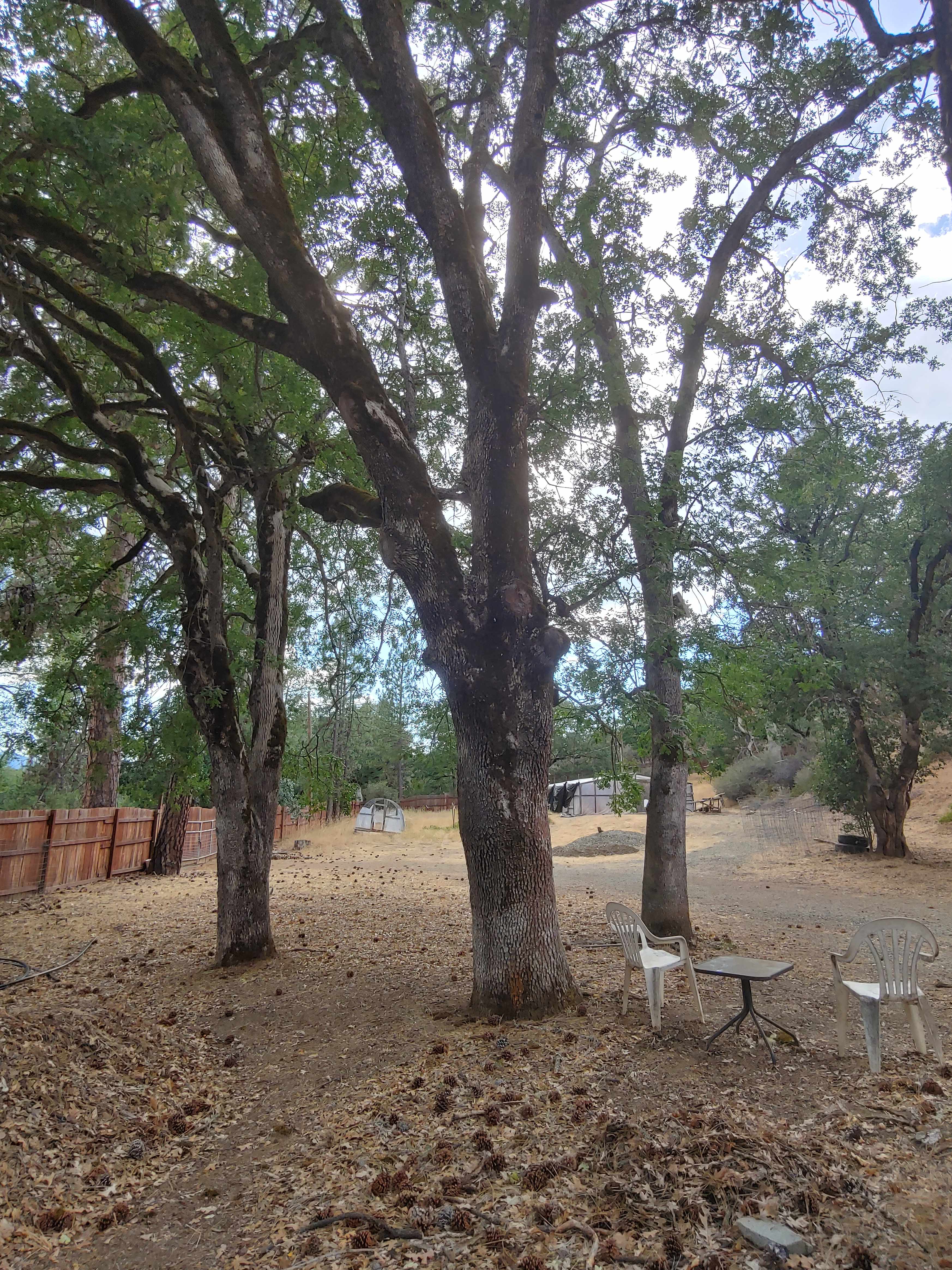 This site is perfect for RVs & Campers as it has easy access to pull through right to the left inside the main campground gate. Please do not hit the no climb fence when pulling in. There is also a pine stump towards the wooden gate. This site has a nice level gravel turn out, but less shade from the trees than the other sites. Its not as ideal for tent camping due to being in the sun. It still has beautiful views of the oak forest, the property's forested mountain and the hayfork valley with its misty mountains and epic skies.
