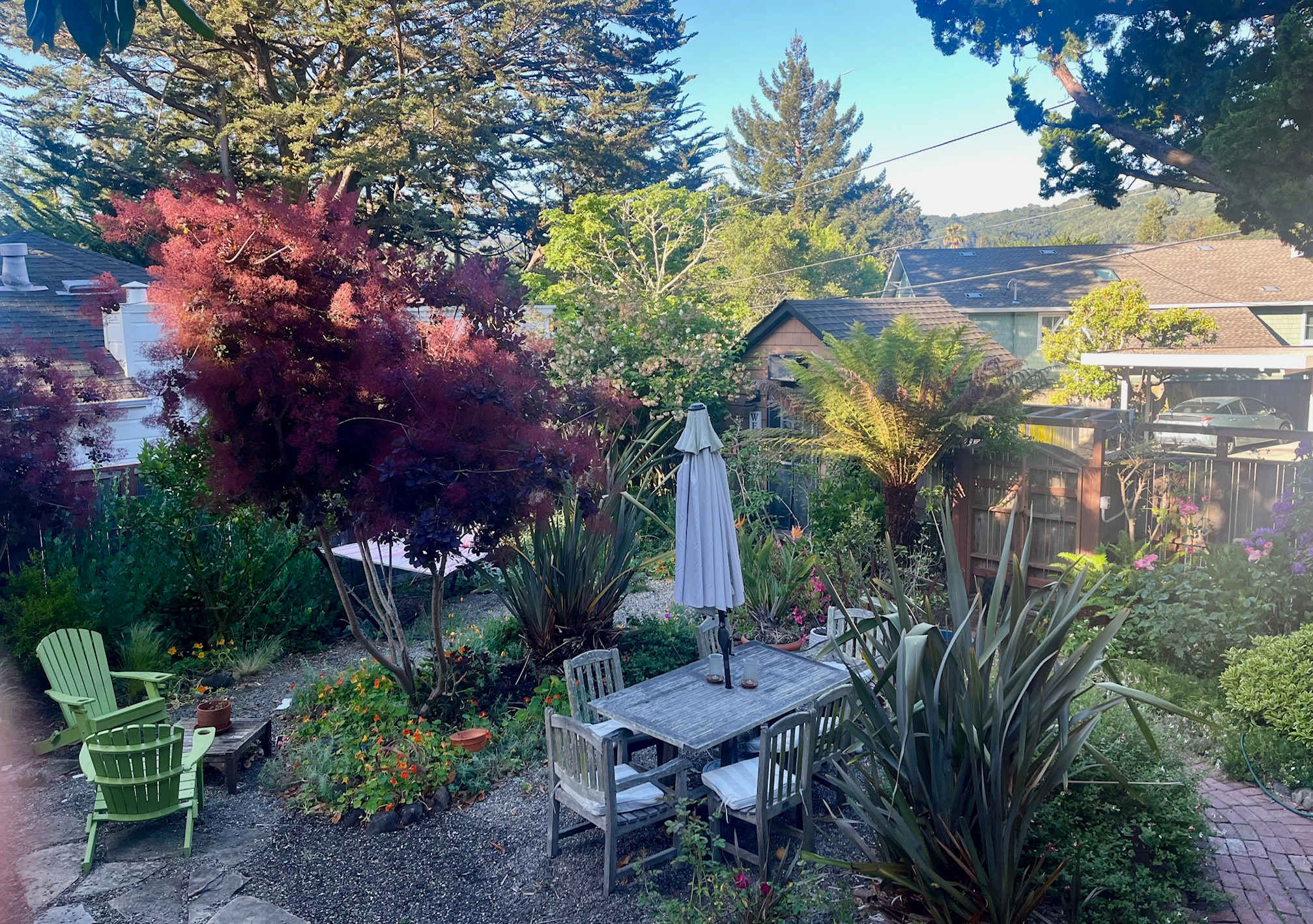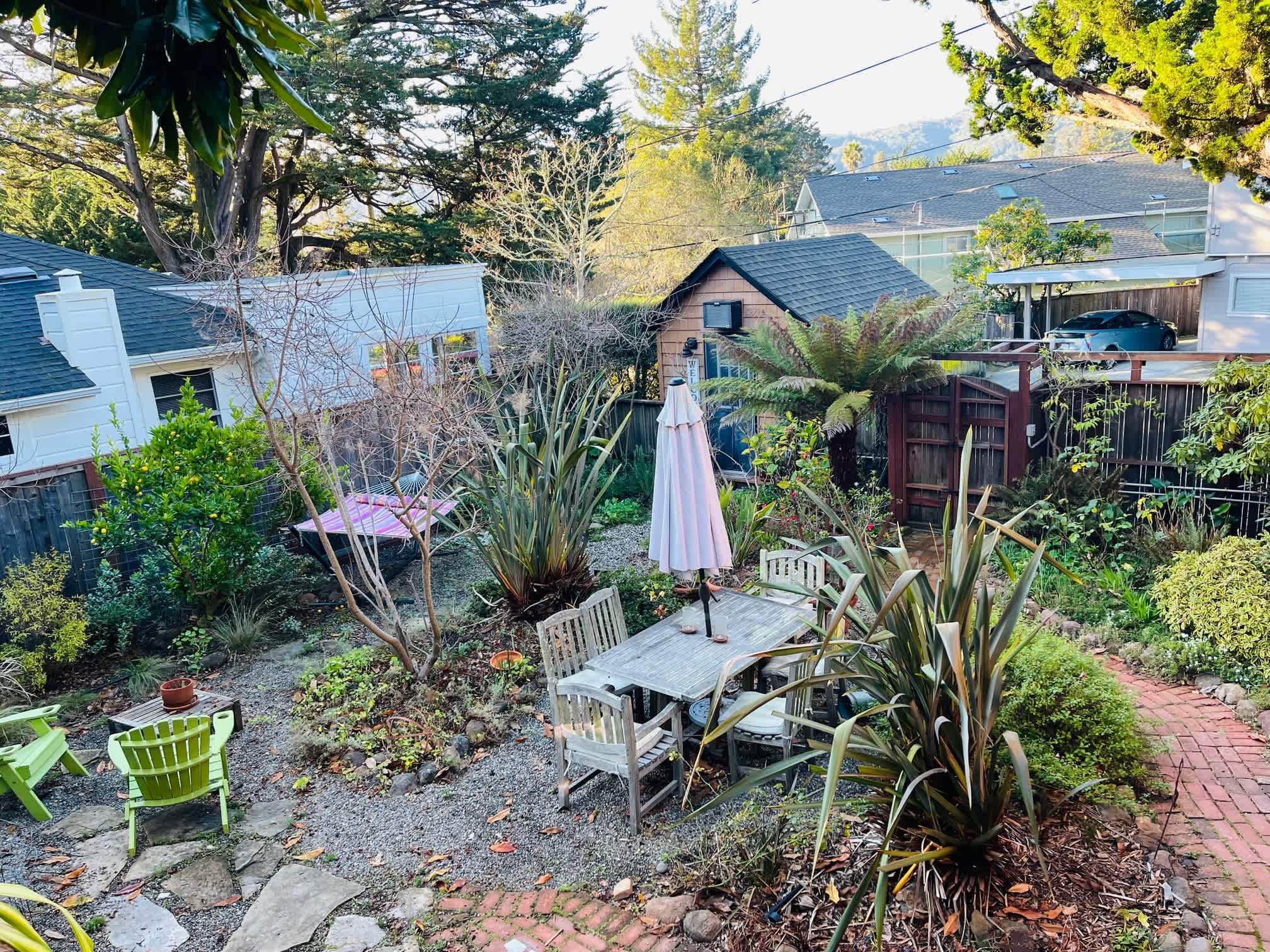 Experience tiny house living in a charming, private eco-friendly tiny house RV with off-street parking, lush shared garden & sleeping loft (accessible by ladder) with a cozy queen bed. Close to downtown Mill Valley, hiking/biking trails, tennis, golf, beaches, Muir Woods, Mt. Tam, the historic Sweetwater Music Hall & SF. The space If you've been curious about tiny house RV living, here's your chance to experience it. "Jenny" (she arrived from Virginia) offers 120 square feet of cozy living space that you enter though a private garden. She's situated in the driveway of a quiet and safe residential block that I have called home for more than three decades. She is 8-by-13 feet, 13 feet high in the kitchen/dining area, 6-foot-9 inches high in the bathroom and living area. You will need to be able to climb a ladder to access the sleeping area, so it is not suitable for anyone with restricted mobility, sorry. Also, the loft is 34 1/2 inches from the peak to the top of the mattress—if you are claustrophobic or plus-sized or both, it might feel tight for you. She features a full-size shower, a dry toilet, a sink, fridge/freezer, microwave, dishes/utensils, AC/heater, and a cozy sitting area with Moroccan poufs. A weather-proof locked storage unit can hold luggage and other items safely to free up space in the tiny house during your stay. Please note that the nightly fee includes the City of Mill Valley's 10 percent transient occupancy tax and 2 percent tourism tax, which means you'll be staying in a unique property in Southern Marin for under $100 a night. Please note this space is NOT safe for children under age 8 as the ladder is steep and there is no railing on the sleeping loft area, and not appropriate for your beloved furry friend. Guest access Make yourself at home in my lush, private lower garden just outside the tiny house (this is a shared space although I generally make myself scarce so my guests can enjoy the garden). Relax on the generously sized hammock and enjoy a meal, cup of coffee/tea or glass of wine around the outside teak dining table or at the Adirondack chairs. The upper garden is private and off limits. (If you are walking up a sloped concrete walkway and stairs, you are in the wrong spot!)