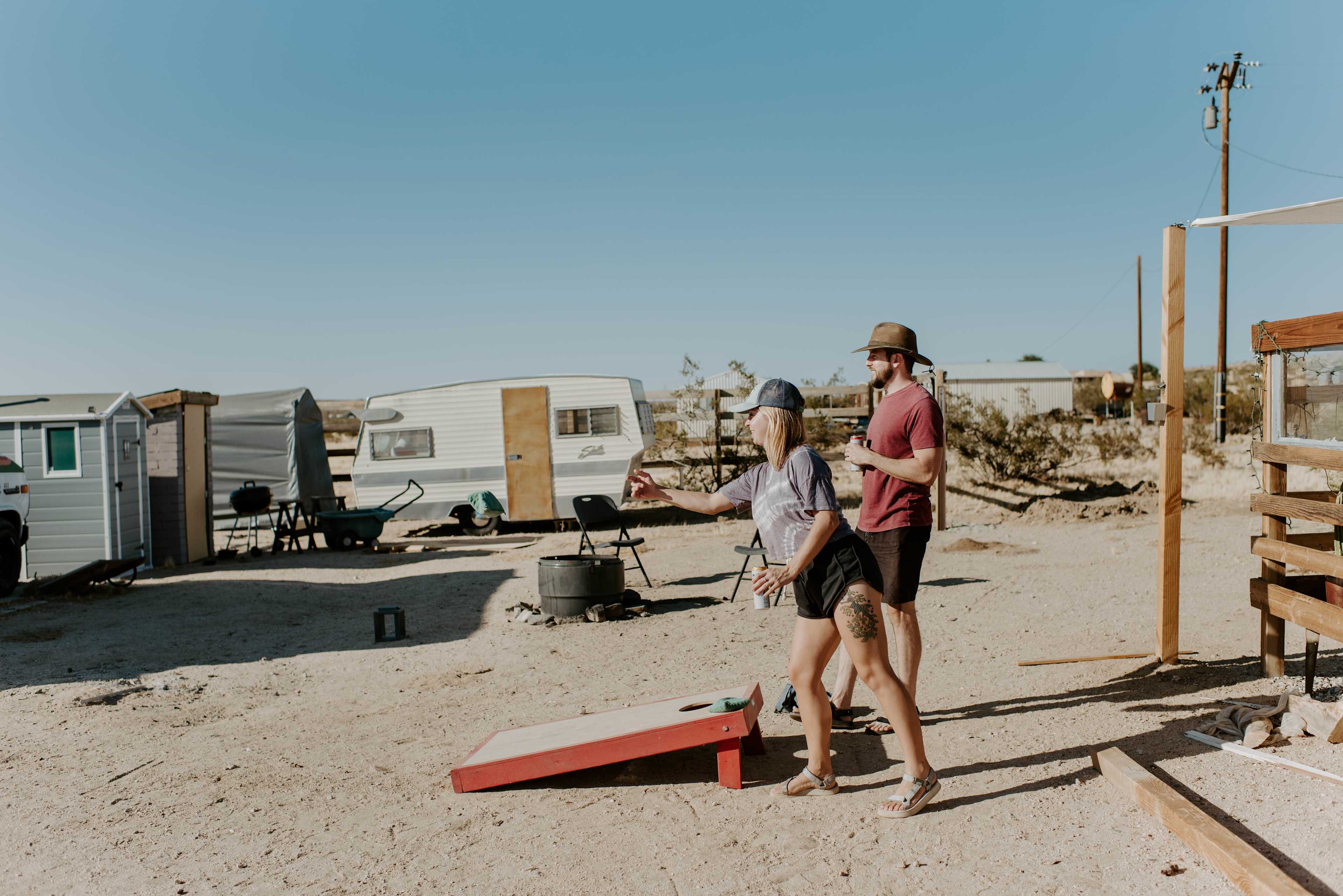 *Note - We do not allow ground tents* A 5 acre hand built desert community for nomads on wheels with beautiful 180 degree views of the national park. Community vibes, co-work spaces, hot outdoor shower, communal kitchen, water fill-ups, mail, shaded patio, games for days, bonfire fire pit & movie nights. 15 minutes from both Joshua tree (West park entrance) and 29 palms (East park entrance). Come hang and share travel stories. Starlink wifi on-site plus 5g cell service for us remote workers. Part of the Van Life Campgrounds network of community oriented camps for nomads on wheels. You can follow us on instagram @vanlifecampgrounds or online at vanlifecampgrounds.com