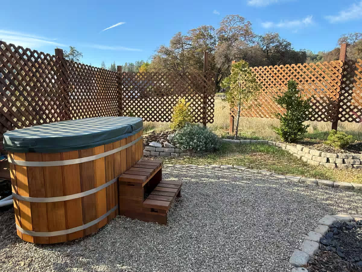 A rare stay in the heart of Murphys: a stylish glamping yurt on the edge of a forest within blocks from shops, wine tasting, and restaurants. After exploring, recharge with a steamy sauna, stargazing in a deep ofuro soak, and sipping wine by the fire pit. Peaceful and made for slow mornings and starry nights. Air-conditioned glamping yurt at the forest edge. Your private yurt has its own outdoor cooking area (with griddle & sink), firepit, and garden area. Just steps away from your yurt, you’ll find a cedar sauna, a Japanese-style ofuro soaking tub, an outdoor shower, and fire pits. Park at the entrance; it’s an easy ~100-ft walk up a dirt lane. Wi-Fi, no TV. Guests have a private key and full private access to their yurt with its own firepit, garden, and outdoor cooking area. The spa area (sauna, ofuro, outdoor shower) is theirs to use at any time. Forest-edge setting with real-deal nature (you may hear coyotes at night). The bathroom is in a separate bathhouse ~20 ft from the yurt (quick outdoor stroll). Parking is at the property entrance with an easy ~100-ft walk up a dirt lane. Wi-Fi included, no TV. The outdoor spa area is a quiet, restful space and is available for use at anytime of day or night. We’ll review sauna/ofuro use at check-in. The yurt sits on the edge of a forest right next to a residential neighborhood. It's a 10-minute stroll to Main Street. The neighborhood comes with typical rural charm - you might hear barking dogs nearby or kids playing down the street. The yurt is a little sanctuary on the cusp of rural life.