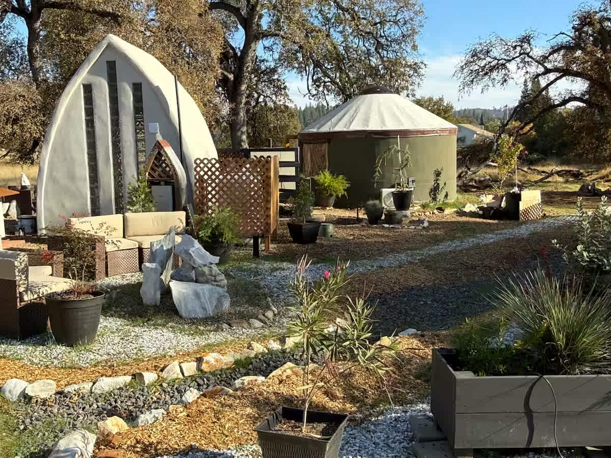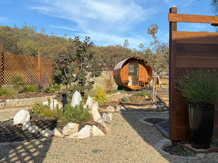 We have a beautiful 45-acre slice of foothill forest-meets-town life to offer, with a glamping experience built around a Japanese bathhouse vibe and a lot of DIY determination. The yurt sits next to a "spa garden" a serene wellness area with a sauna, Japanese soaking tub (ofuro), garden nooks, and a Japanese bathhouse-style setup. Almost everything out here is host-built—even the bricks in the bathhouse were hand-hewn. Soak as long as you like, breathe the pine air, and let your nervous system de-frag. While the yurt and spa garden sit on the edge of a forest, you are still only about a 10-minute walk to Main Street Murphys—a ridiculously cute Gold Country town with tasting rooms, great food, indie shops, and a surprisingly legit live music scene. It's wine country, with small town energy. Maybe what Napa was like in the 60's? Because we sit right on the border of town and forest, you’ll get a real blend of sounds: wind in the trees, coyotes in the field and owl calls at night… plus the sounds of kids playing in the church yard and a dog down the way. It’s not deep-wilderness silent—more “edge-of-town retreat” quiet. For exploring, you can hike straight from the property up our hill—Rocky Hill, as locals know it. It’s a fun, scrambly wander with big views, and it also taps into the area’s Gold Rush history: you’ll find caves and old miner ruins along the way. Come for glamping comfort, backcountry vibes, and town tacos within strolling distance!A rare stay in the heart of Murphys: a stylish glamping yurt on the edge of a forest within blocks from shops, wine tasting, and restaurants. After exploring, recharge with a steamy sauna, stargazing in a deep ofuro soak, and sipping wine by the fire pit. Peaceful and made for slow mornings and starry nights. Air-conditioned glamping yurt at the forest edge. Your private yurt has its own outdoor cooking area (with griddle & sink), firepit, and garden area. Just steps away from your yurt, you’ll find a cedar sauna, a Japanese-style ofuro soaking tub, an outdoor shower, and fire pits. Park at the entrance; it’s an easy ~100-ft walk up a dirt lane. Wi-Fi, no TV. Guests have a private key and full private access to their yurt with its own firepit, garden, and outdoor cooking area. The spa area (sauna, ofuro, outdoor shower) is theirs to use at any time. Forest-edge setting with real-deal nature (you may hear coyotes at night). The bathroom is in a separate bathhouse ~20 ft from the yurt (quick outdoor stroll). Parking is at the property entrance with an easy ~100-ft walk up a dirt lane. Wi-Fi included, no TV. The outdoor spa area is a quiet, restful space and is available for use at anytime of day or night. We’ll review sauna/ofuro use at check-in. The yurt sits on the edge of a forest right next to a residential neighborhood. It's a 10-minute stroll to Main Street. The neighborhood comes with typical rural charm - you might hear barking dogs nearby or kids playing down the street. The yurt is a little sanctuary on the cusp of rural life.