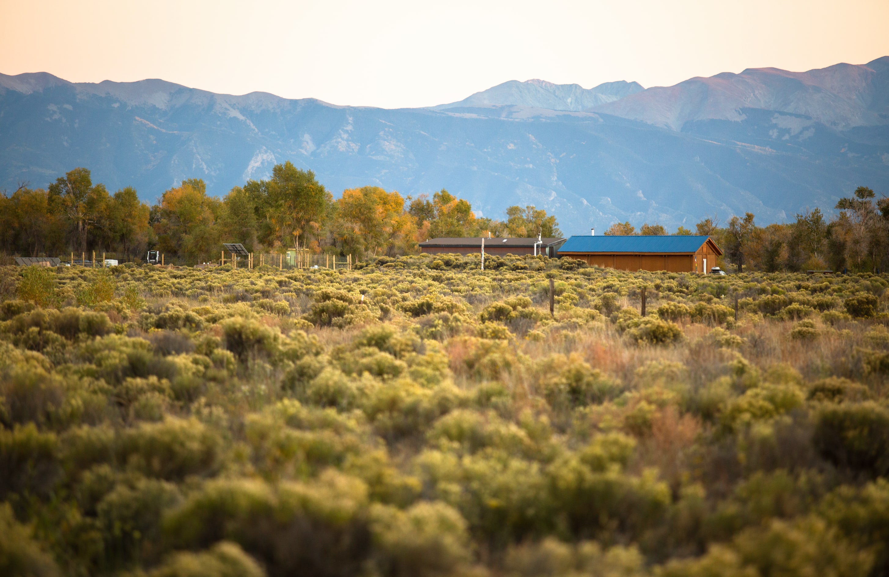 Park near our 1.5 acre permaculture garden, with epic close up views of the Sangre de Cristos.