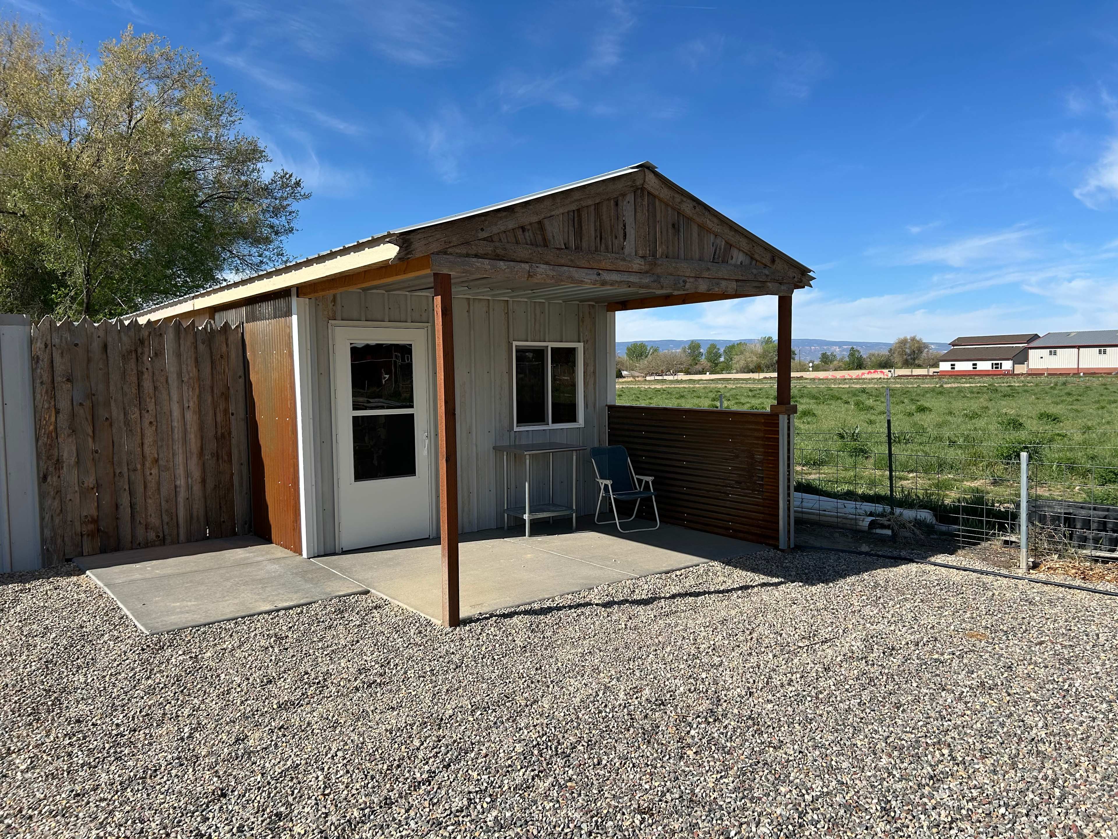 Site #2 – Cabin in the Orchard Electric + Wi-Fi + Water Access This small one-room cabin offers a quiet space to relax among the trees. There is AC in the cabin Features: • One-room cabin (no plumbing) • Electricity & lighting • Wi-Fi access • Potable drinking water nearby • Porta-potty access • Handwashing station • Fire pit & picnic table • Flat gravel parking next to cabin • Pets allowed (leash; clean-up required) • No tents allowed • AC and refrigerator in the cabin Outdoor shower Rate: From $50