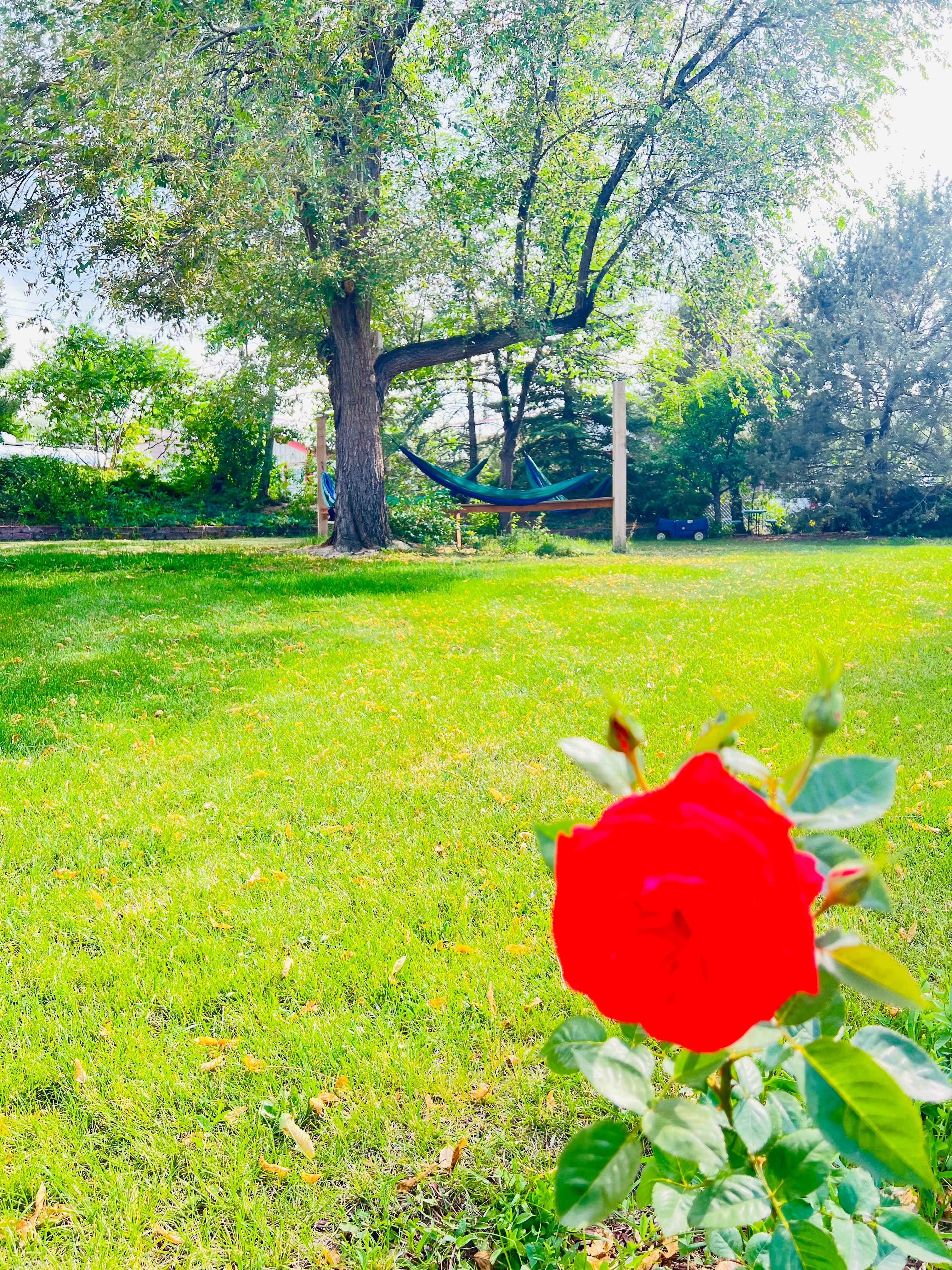 22 ft travel trailer · With pets · They have everything! A peaceful setting in a space shared with two other trailers (vintage, that they rent to glampers) nice outdoor green spaces to enjoy with picnic tables, hammocks and outdoor cooking area. Then they also have indoor space: two flush toilets, shower, dinning table and chairs, microwave and large screen TV. Two nice silly dogs in residence and two very nice, thoughtful, kind and welcoming hosts in Greg and Olivia. We stayed twice this summer and will surely be back when we return to the area. Only negatives: no sewer hookup for our camper (not a huge deal with flush toilet and sinks mere steps away in the flex room described above) Also the space was a challenge for me to pull out of due to tight turns around some fencing. Since I was nervous about taking out these lovely host’s fence with our 21 ft. Travel trailer, Greg very kindly backed out for us to save me the stress. While the location is excellent and the property lovely and well cared for, it is sometimes a little loud as it is across the street from Niwot high school football and sports fields. Some mornings and Friday nights the practices and games were quite easily heard from their tranquil backyard space. But that was a small trade off for a place that was very peaceful most of the rest of the time.