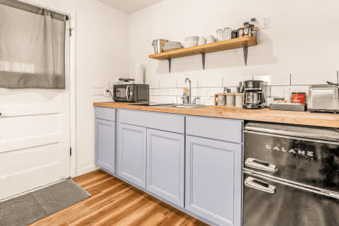 Our cabins offer a peaceful retreat, combining rustic charm with modern comforts for a relaxing stay and a good night’s sleep. This cozy cabin features 1 queen bed and a set of twin bunk beds, perfect for families or small groups. The fully equipped kitchenette includes a mini fridge, microwave, toaster, coffee pot, 2-burner cooktop, dishes, pots & pans, silverware, and glasses. Enjoy a 50" Smart TV, WiFi, and all linens and towels, plus shampoo, conditioner, and body wash. A propane BBQ grill is outside. Non-smoking. Dogs are welcome for a one-time, non-refundable cleaning fee for up to two pets.