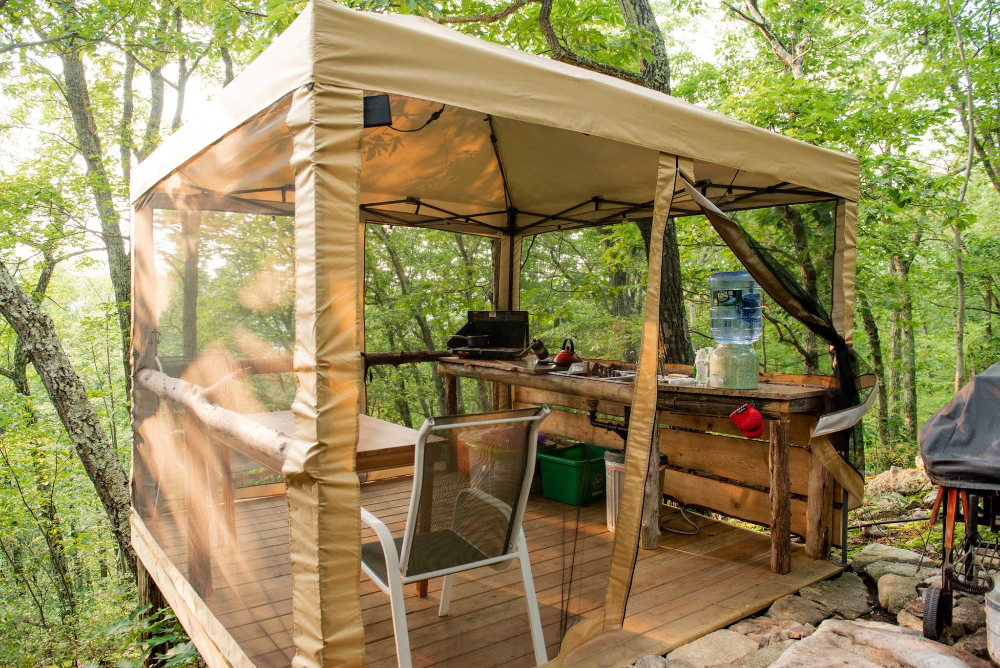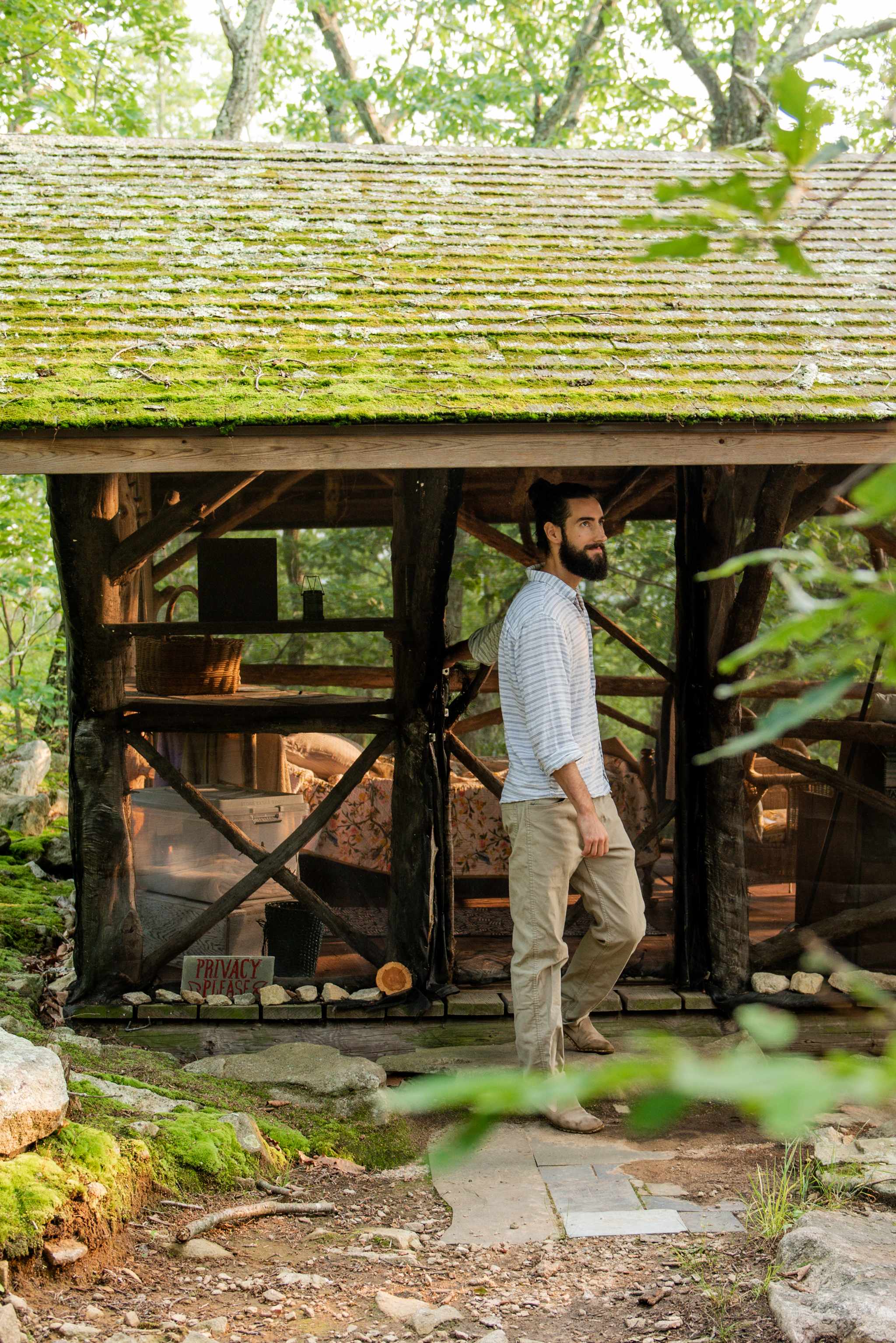 The property had much to explore: expansive views from comfortable lodging, hiking trails, ponds, rock sculptures, and even a meditative labyrinth. Sticks and Stones Farm was beautiful and unique with fantastic amenities that any camper would appreciate. The outdoor shower built within hulking, massive boulders was refreshing after a day of play on the property. The screened-in, outdoor kitchen was both convenient and essentially supplied to cook a great meal. Watching the sunset while dining al fresco was certainly a highlight during our two night stay. Our lodging was clean, comfortable, and forest-immersive. After spending many days in the city, this time in the woods was invaluable.