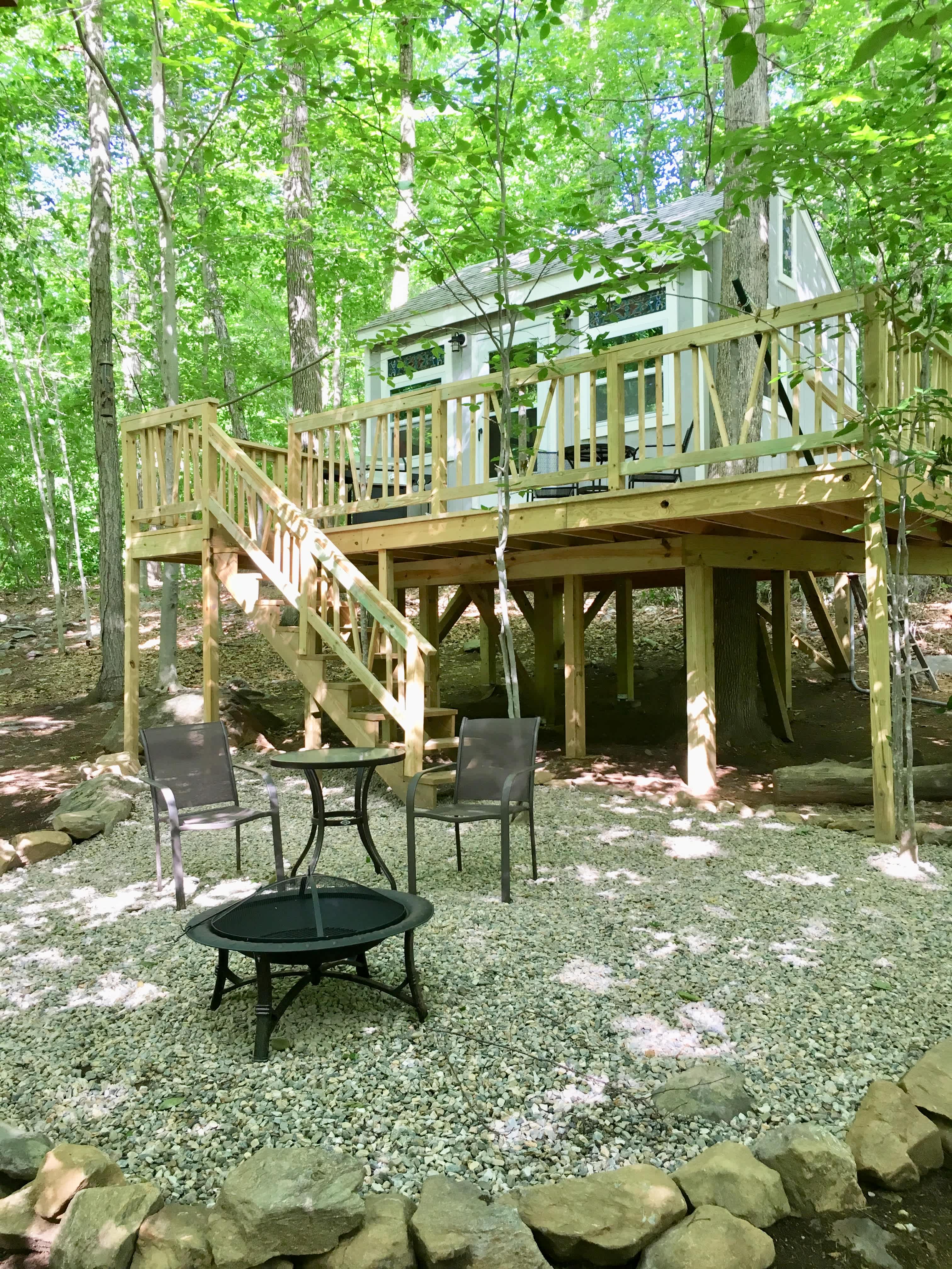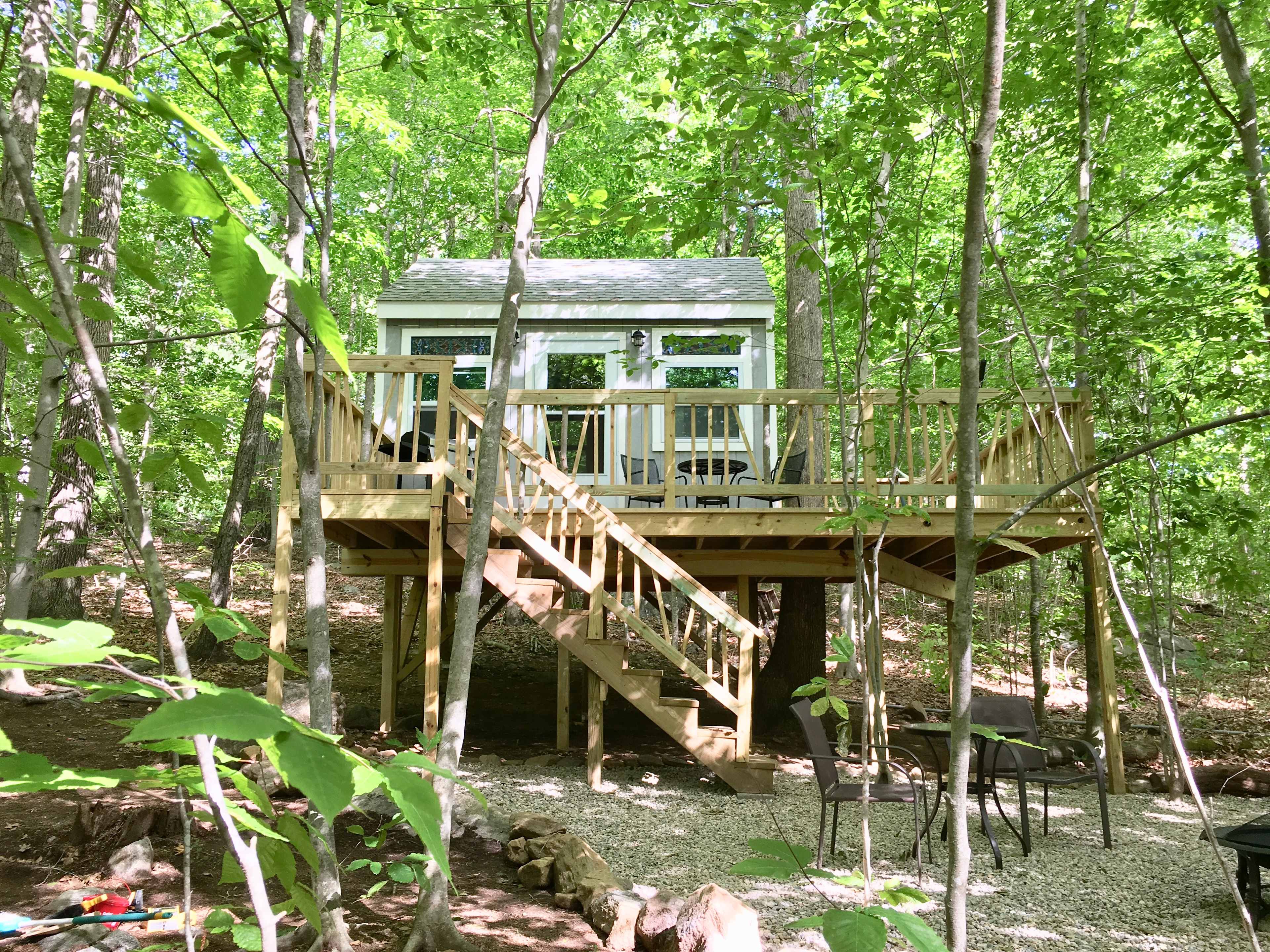 Water forest retreat treehouse is a 168 square-foot private heated and electrified tiny home surrounding an oak tree nestled in 56 acres of forest. There is a queen size bed, end tables, cabinet and a table with two chairs. There are 2 1/2 miles of hiking trails with a brook, waterfall and marsh. There is a composting toilet and water is provided. There is no running water at the tiny home, but there is a sink under the deck of the house next to the shower. It is a five minute walk to a springfed pond where you can fish and swim. We supply all camping equipment including a propane grill and a two burner propane camp stove so all you need to bring are your clothes, personal toiletries, food and drinks. A beautiful place to enjoy the forest and rejuvenate. Dogs welcome.