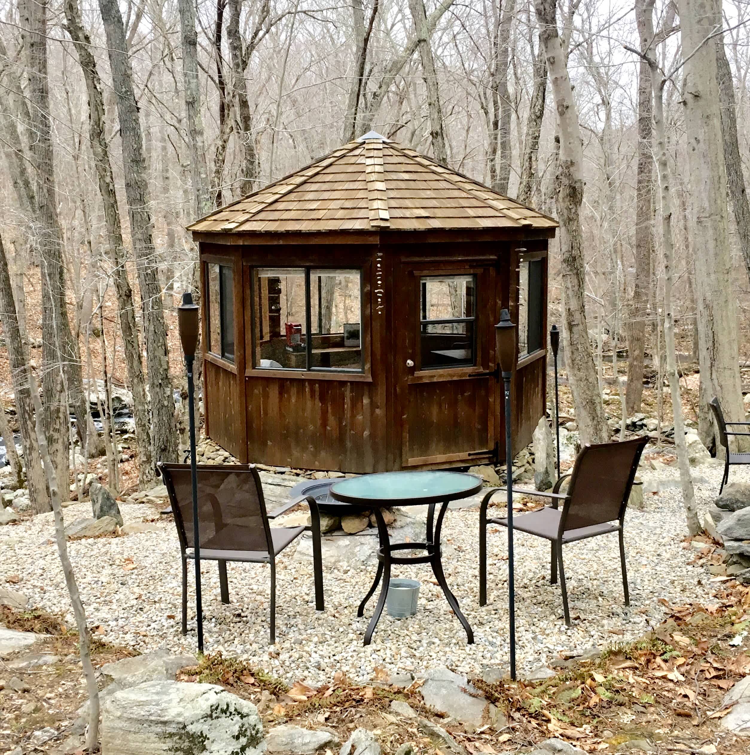 This property has been in my family for three generations. It is classic Connecticut with hills and streams and stone walls. The octagon is a private 122 ft.² that is electrified and heated. It has a full size bed, cabinet and table with chairs. It sits next to a brook on 56 acres of forest with a pond, small waterfall, marsh and 2 1/2 miles of hiking trails. There is a fire pit and outdoor dining area next to the octagon. We also have a propane outdoor grill and propane two burner camp stove. Out house with composting toilet close to octagon is heated. A great place to rejuvenate in the forest! Dogs welcome.