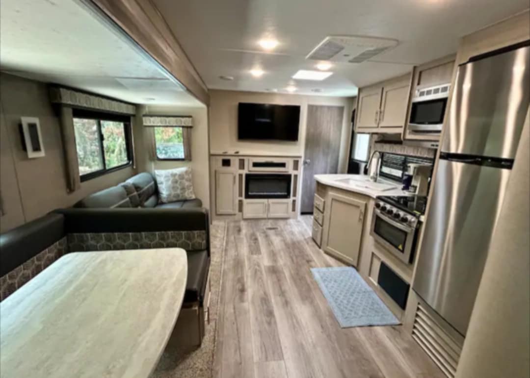 34 ft camper located in the Amelia River Campground in Fort Clinch State Park. Fort Clinch is in Fernandina Beach on beautiful Amelia Island. The campsite features water, power, and sewage. A picnic table, chairs, firepit, and clothing line are provided as well. This spacious camper offers a private queen, 3 bunks, and a u-shaped dinette and loveseat that convert to beds. It has a fully stocked kitchen, full bathroom, and more.Amelia River Retreat is within walking distance to the Amelia River coastline where you can spend endless hours shelling, hunting sharkteeth, fishing, watching local wildlife and coastal birds, explore historic Fort Clinch, hike, bike, enjoy some of the best sunsets, and more.