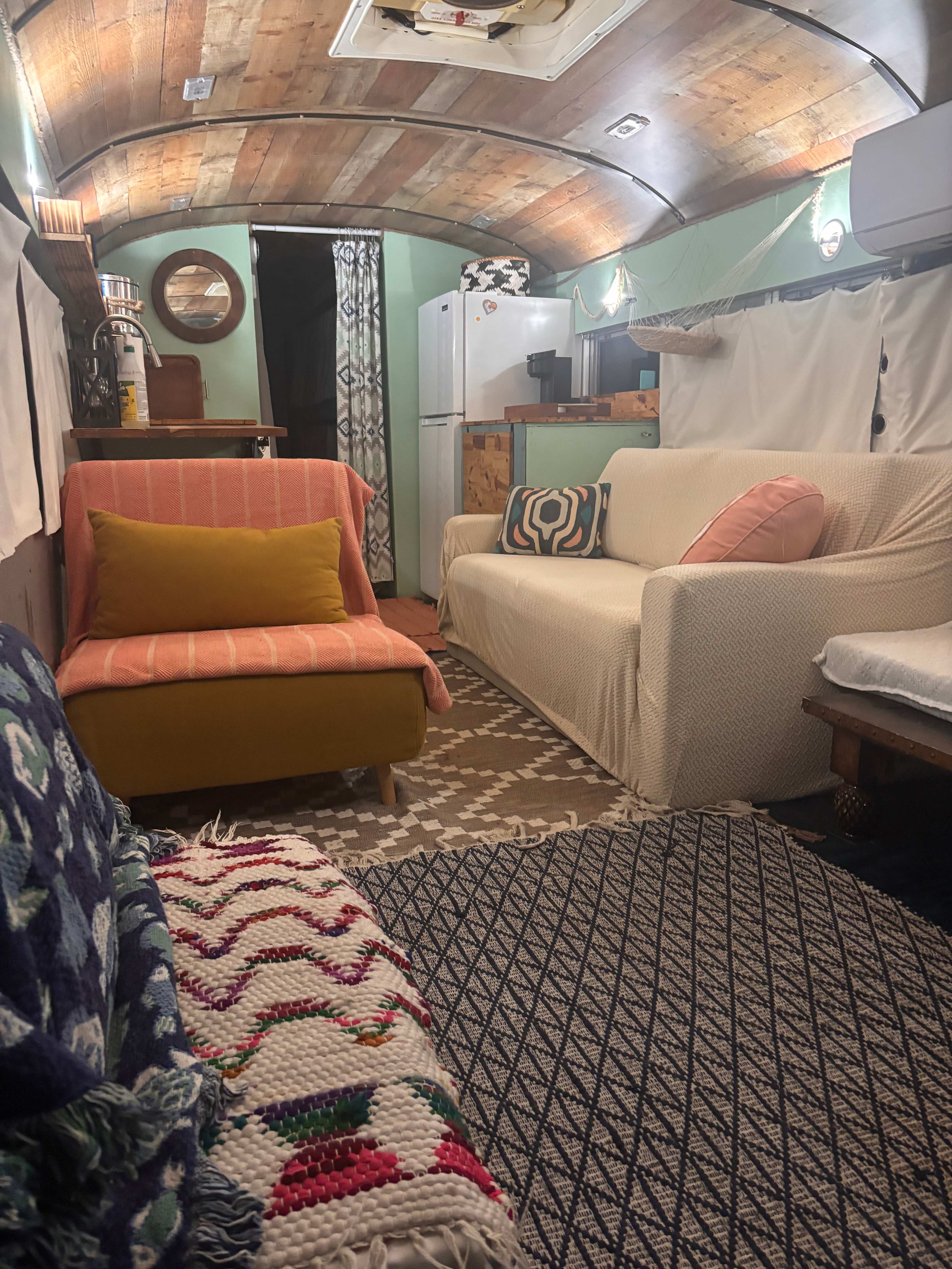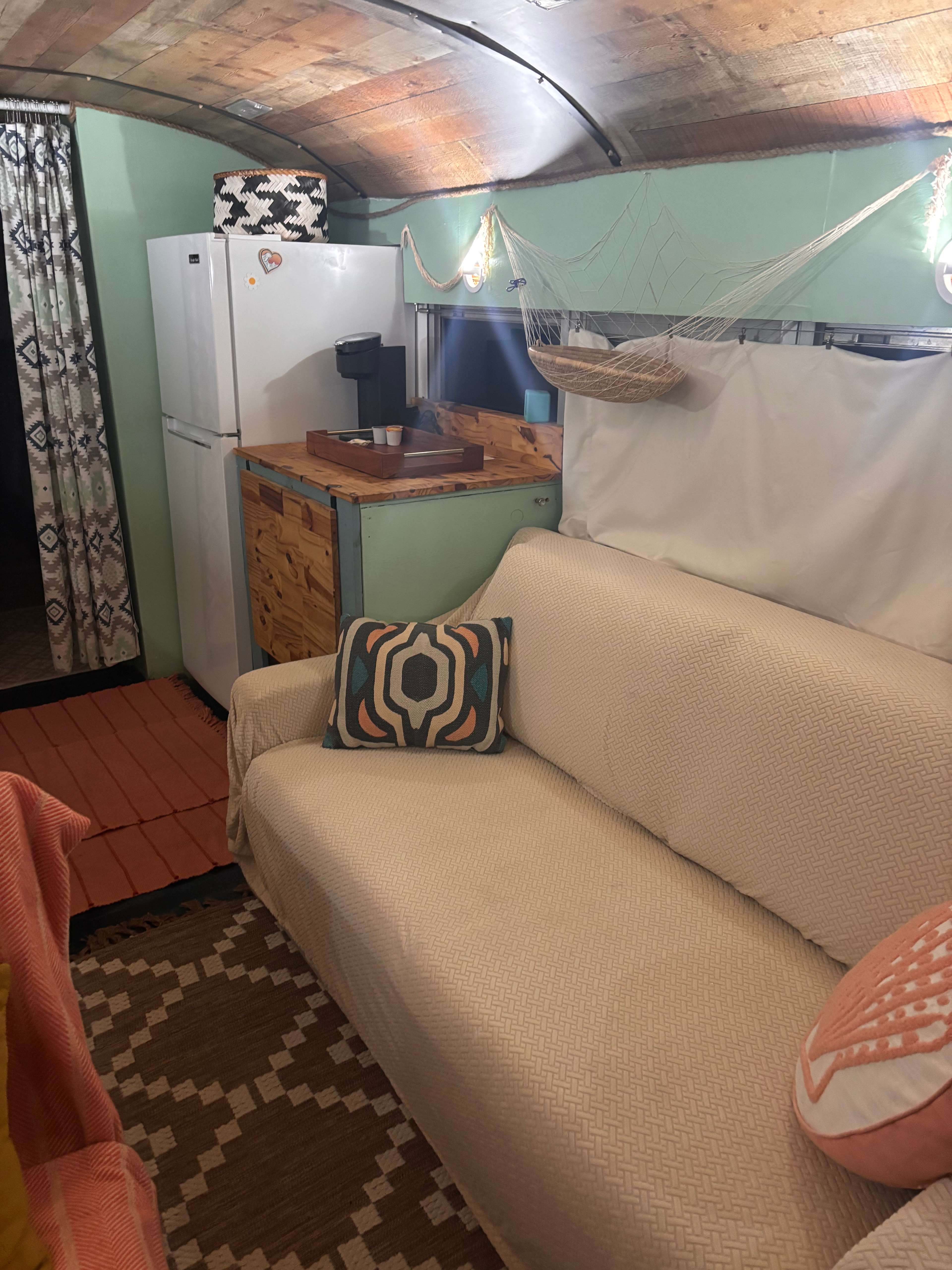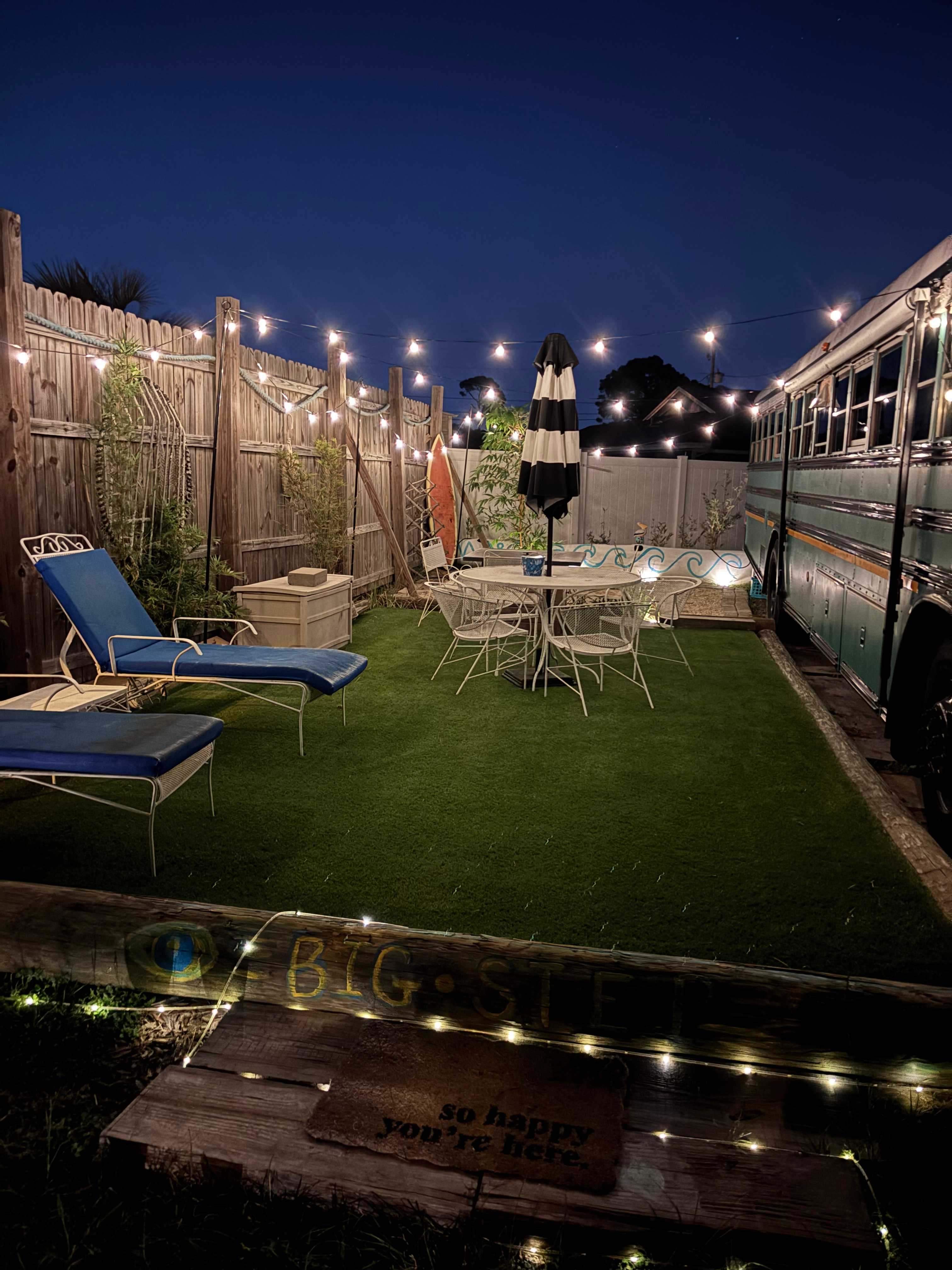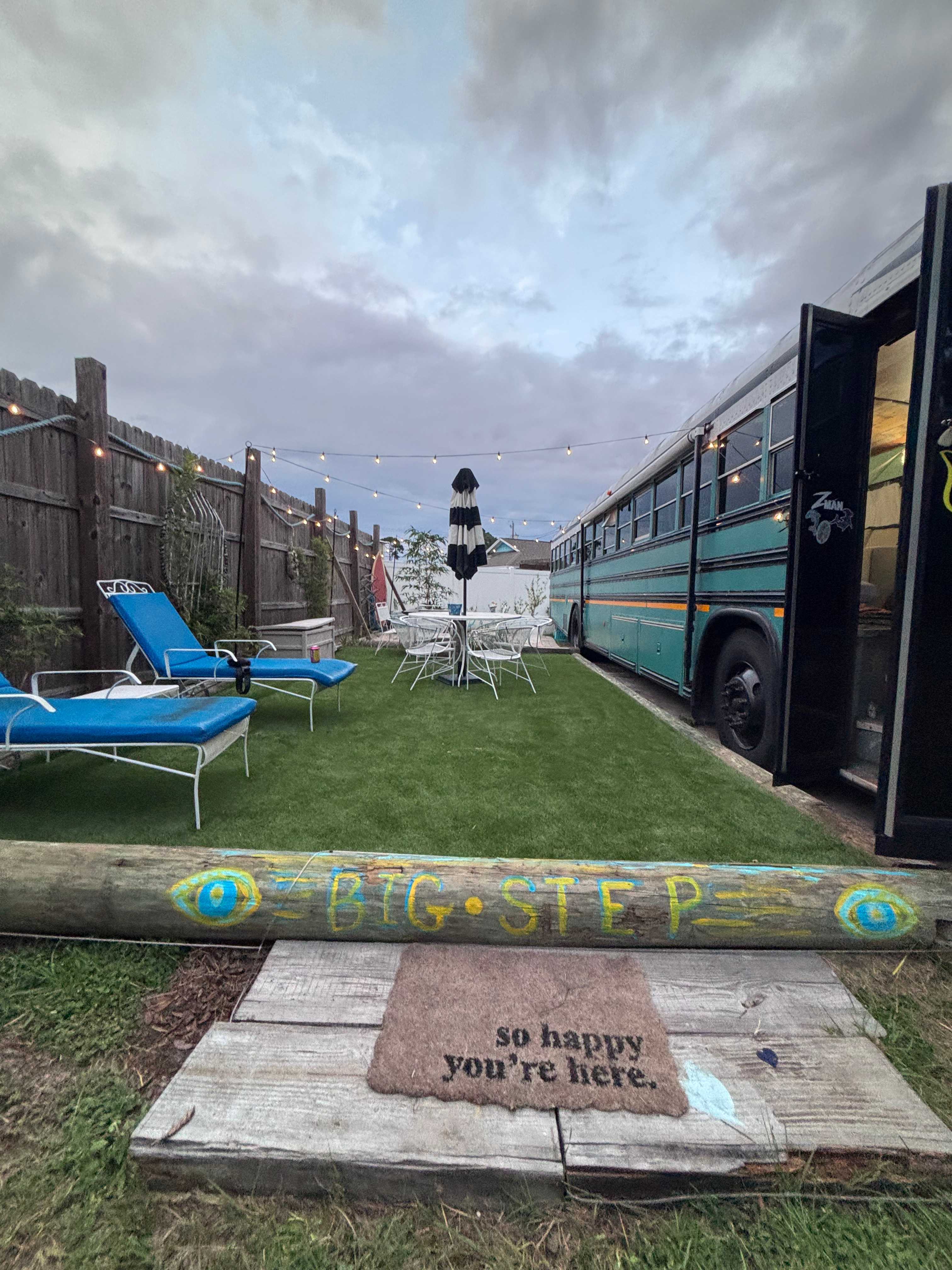 The Emerald Express Oasis — a one-of-a-kind Florida glamping stay in a vintage teal skoolie near Panama City Beach. Relax in your private fenced oasis with turf lawn, string lights, and a retro coastal vibe. Sip coffee while watching bunnies at sunrise, then unwind under glowing lights at dusk. A peaceful, family-crafted retreat full of charm and care. No pets please — our family uses the bus in the off-season and treat it as our own getaway. 🌊✨ No pets, please — our son has severe allergies, so we kindly ask guests to respect this rule.