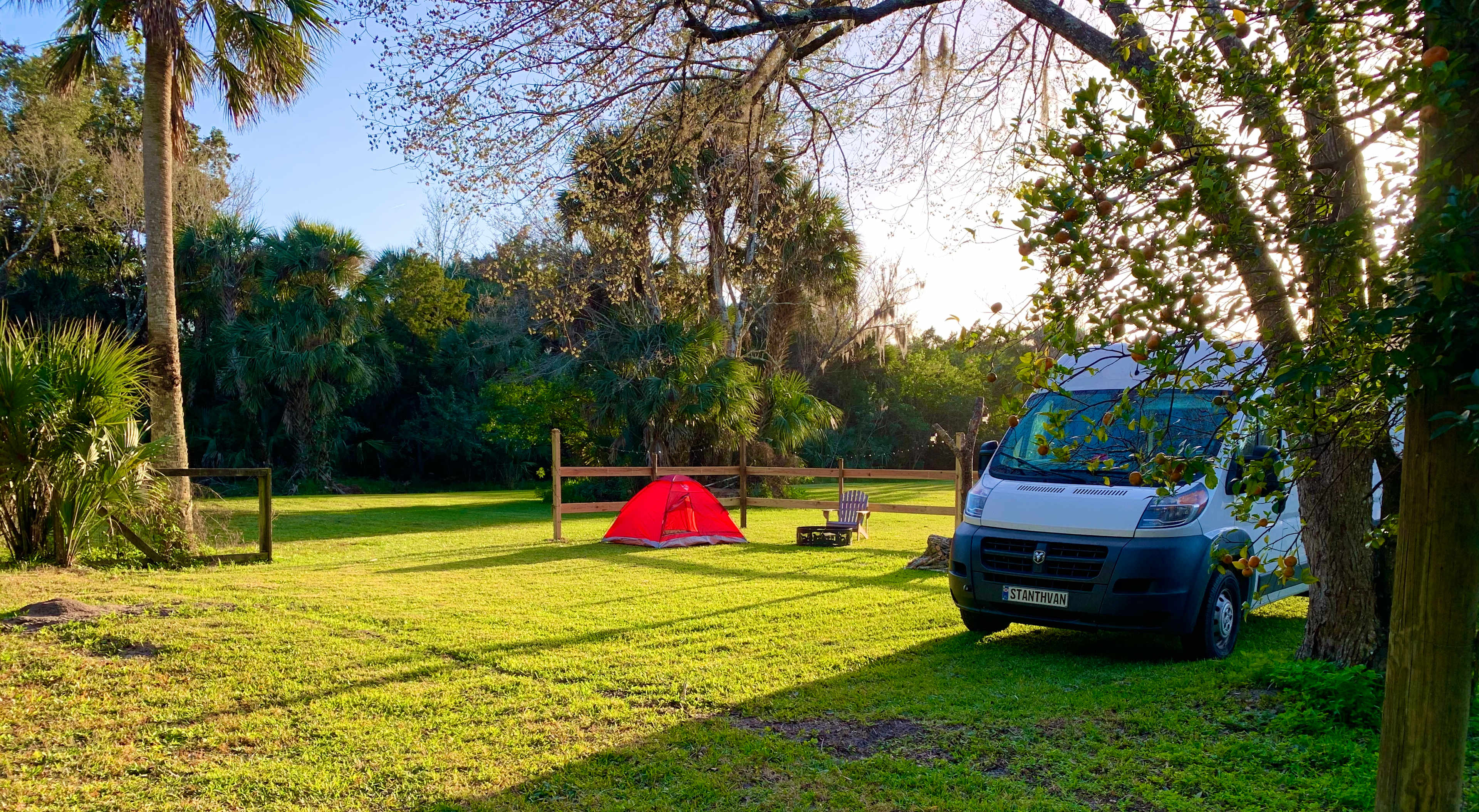 (Not a commercial campground.) Park your van or small RV, or pitch your tent on our rural homestead conveniently located 1000 ft off of US Hwy 1. Nearest I-95 exit/3 miles away. Watch rocket launches, visit nearby beaches, attend NASCAR races, see local communities of New Smyrna Beach or Titusville, relax at Canaveral National Seashore, birdwatch at Merritt Island National Wildlife Refuge, fish Mosquito Lagoon, or visit the amusement parks of Orlando, we are a safe and quiet location to stage your adventures from! We have a nice level, grassy campsite, complete with a fire ring, picnic table, and firewood. Nothing fancy, but we are clean, secure, private and gated. You can come and go as you please, and day-trip all over beautiful Central Florida!