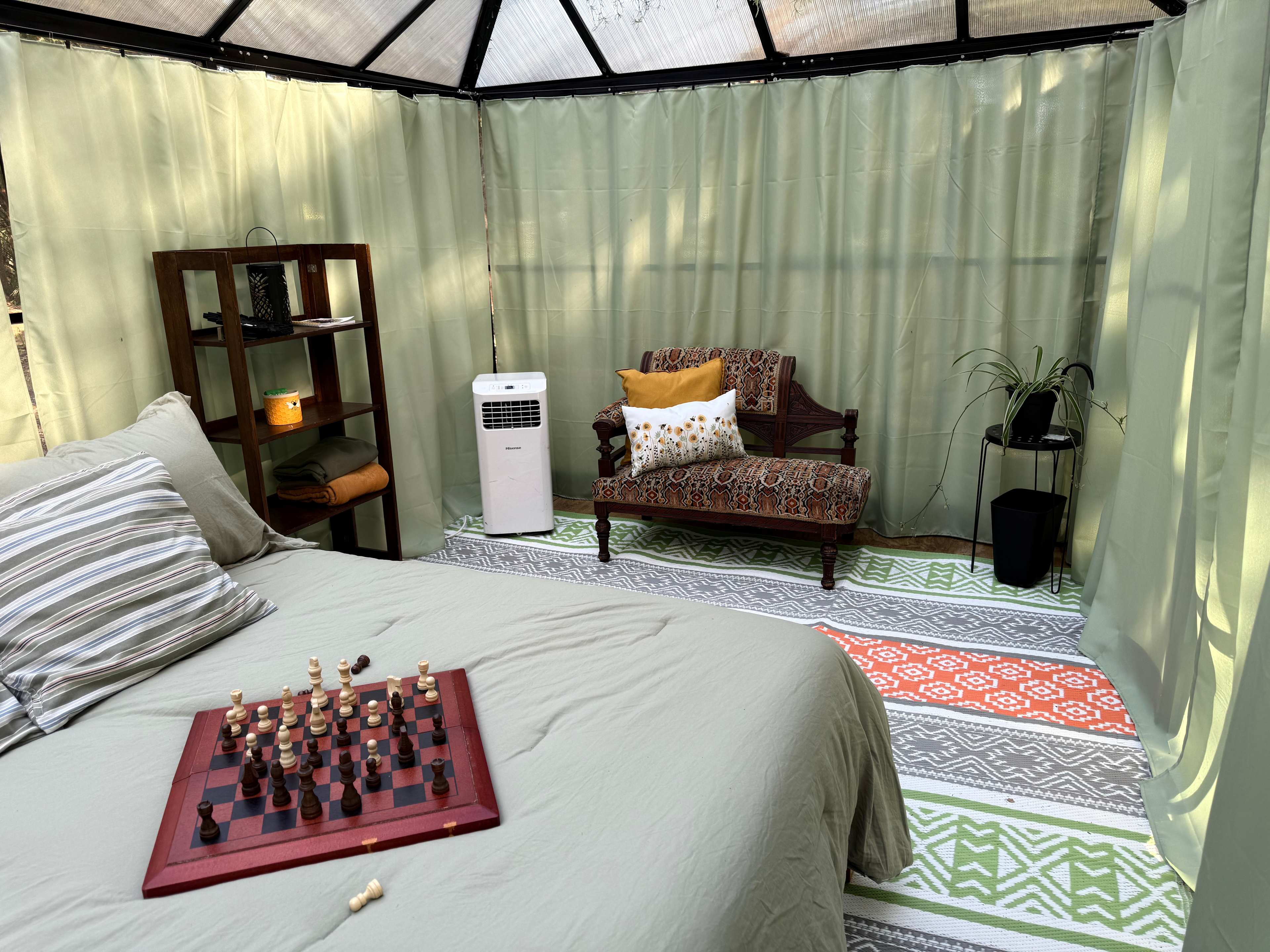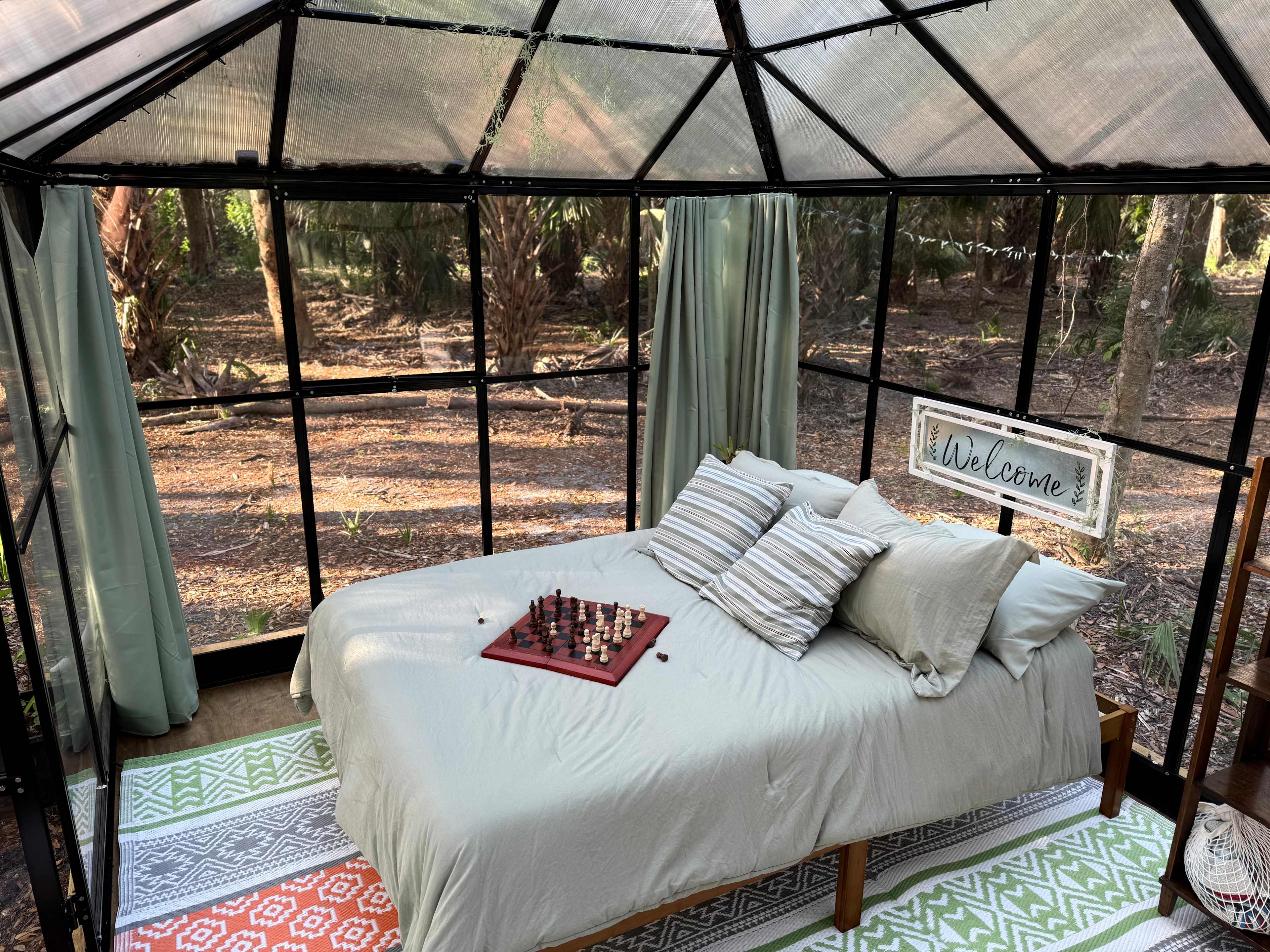 Escape to Nature in Camp Shiloh's Glamping Greenhouse! Tucked away in a peaceful, wooded haven, our Glamping Greenhouse offers a quiet retreat for two, blending the charm of camping with some minimalist modern comforts. Step inside this hidden hideaway and discover a thoughtfully designed space featuring a comfortable, air-conditioned room where 360° clear walls surround a luxuriously comfortable full-sized bed, and a unique seating area. If more privacy is desired, the curtains can be closed to cover every window and hide you discreetly inside. Outside, you can relax in the Adirondack chairs or sway gently in a hammock as you unwind with a nap, a book, or just in quiet conversation. As afternoon fades, enjoy your dinner at the picnic table beneath a canopy of sun-filtered trees. When night falls, light up the fire ring for some toasted marshmallows, savor a glass of wine, search the sky for constellations, or perhaps even catch a SpaceX rocket launch! A lighted woodland path leads to a rustic privy/pit toilet, maintaining the off-grid experience while ensuring convenience. With parking for two vehicles, this retreat is easy to access while remaining secluded and serene—perfect for couples looking to escape the noise of everyday life and reconnect with nature or each other. Experience the serenity of the forest, where comfort meets camping in a setting designed for quiet relaxation. Your simple glamping getaway awaits! Water is not available at any campsite in Camp Shiloh. Campers must provide their own water for drinking, cooking, cleaning, or other needs. Please plan to bring sufficient water for all your needs, for the duration of your stay. Provided: Electricity is available in the Glamping Greenhouse for your charging and lighting needs.. Fresh bed linens are provided. The privy has toilet paper and hand sanitizer supplied. Firewood is available onsite free of charge. Not provided: Campers must furnish utensils and other dining needs. Candles, cooking, and smoking are prohibited indoors. Water is not available.