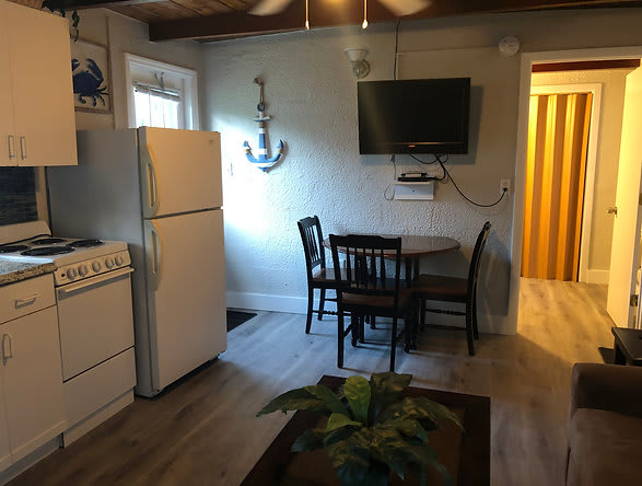 Cabin #4 is a two bedroom with a king size bed and a full size bed. A cute sailboat and palm tree motif helps create a cozy and clean environment for your relaxation. Full kitchen and bathroom and leather sofa in living area. Awesome shaded patio with table and chairs for your relaxation time.