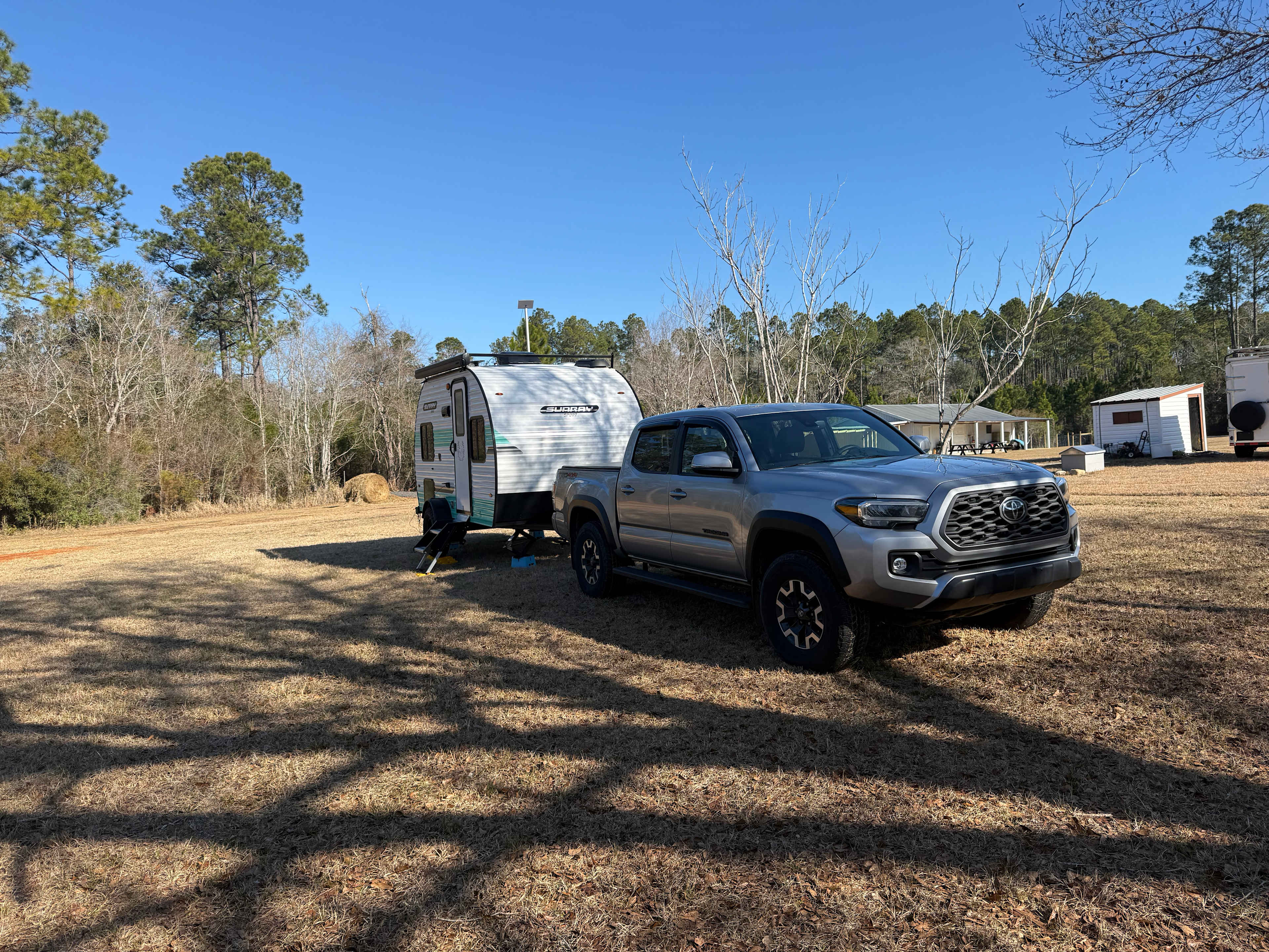 Site accommodates up to a 38-foot unit. 50-amp service and water available. 50-to-30-amp adapter required for 30 Amp service. Property is located on private dead-end road. It's 30 minutes from Pensacola Beach, 45 minutes from Gulf Shores and Orange Beach. Convenient to restaurants and Shopping.Site 10 is situated on 4-acre private wooded lot. Lot is level and semi-private.