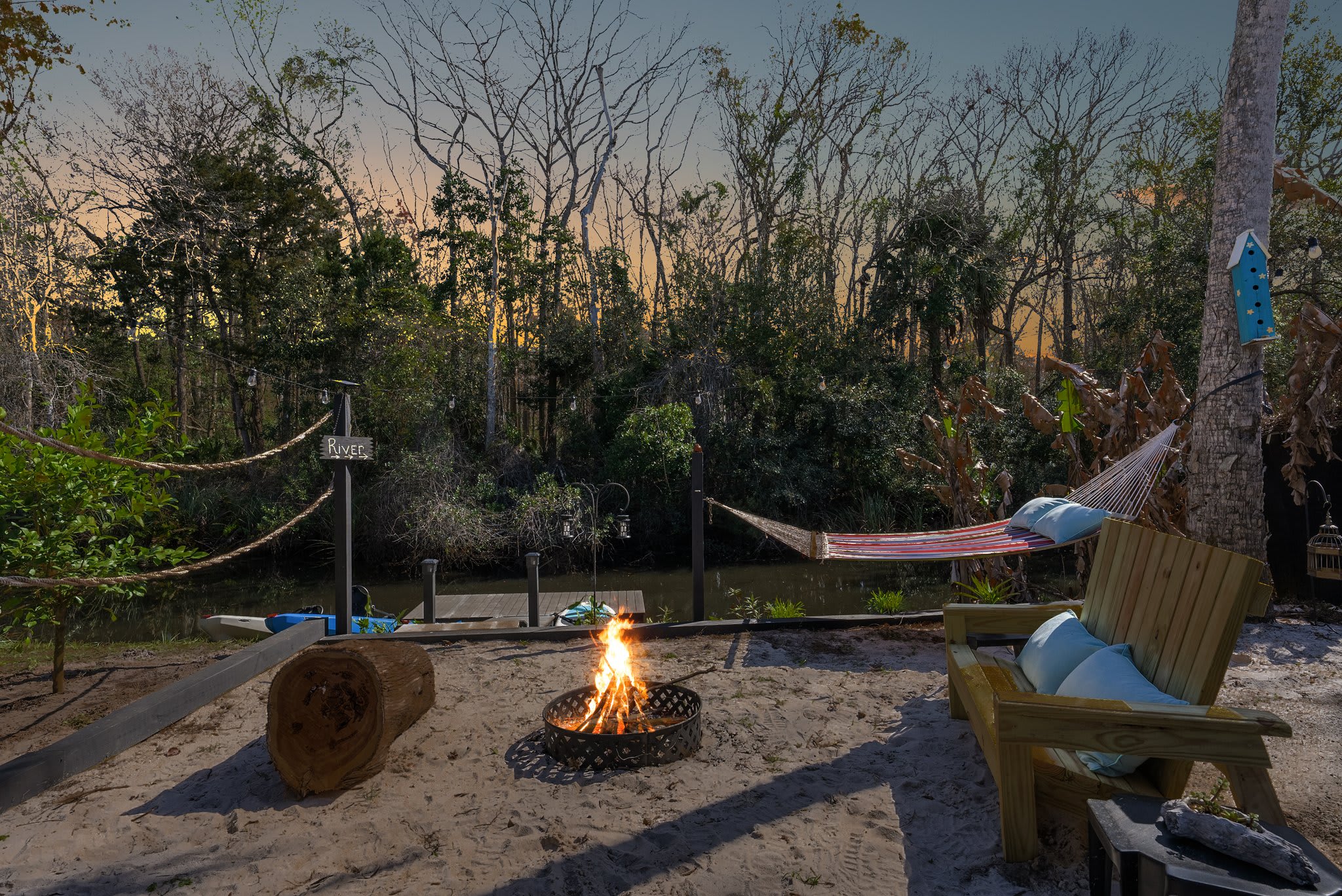 This property is a gorgeous corner canal front lot situated right next to conservation land which allows for fantastic wildlife watching (river otters, birds, manatee, fish, crab, raccoons, etc). Property is located in a small, quiet neighborhood with access to the Weeki Wachee River. There is a single-family house on lot and you would be renting the RV Driveway & Glamping area. The glamping area includes use of the floating dock (for easy vessel launch or yoga), beach area with fire pit, & covered patio & dining set. The paddle down the canal is magical, surrounded by so much nature, and in about 20 mins you’ll reach the pristine waters of the Weeki Wachee River. Make left onto river and you’ll be paddling upstream towards The Weeki Wachee State Park (which features mermaid shows) or make a right and cruise downstream toward Hospital Hole, Rogers Park Beach, and Upper Deck Café. This is a great spot to reach for easy water access and to feel surrounded by nature.