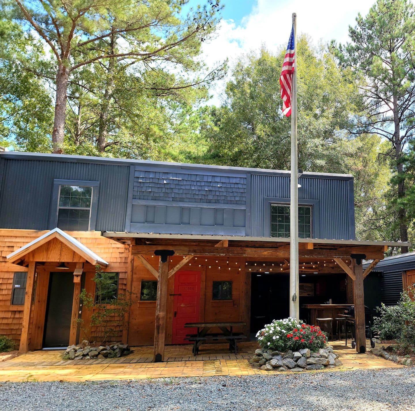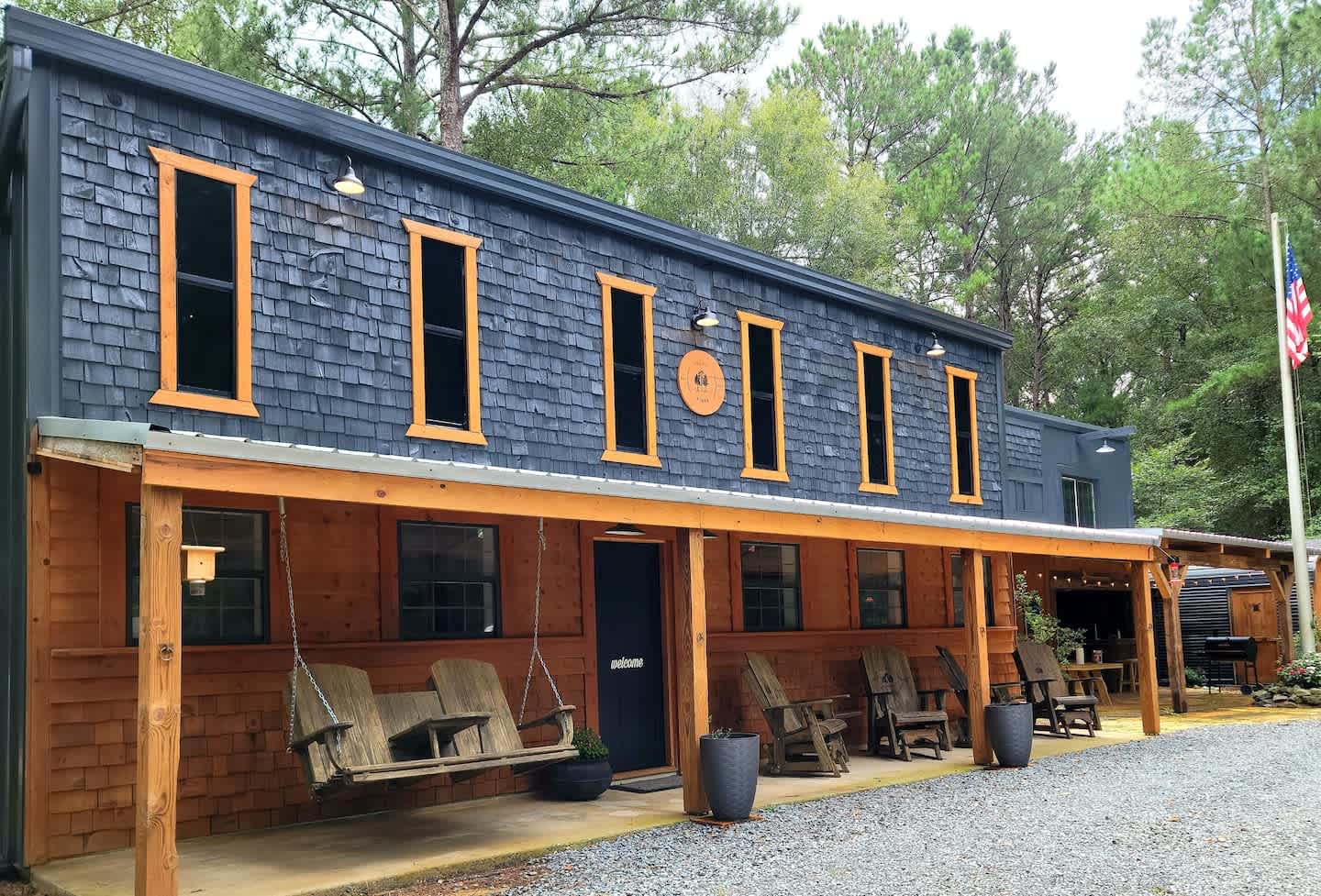 Welcome to our Barndominium at Rustic Pines! We (Matt & Elaine) have been married since 1994. We have 3 sons who work with us at our business (Wooden Masterpieces). Elaine is also the chef at a local hunting plantation where she works in the Fall. We bought this neighboring property in 2021 and renovated it ourselves with the help of our family and friends. The outdoor furniture, shelving, countertops and kitchen bar were all built by Matt. We love this 'barndo" and hope you do as well! Enjoy your stay, Learn more about this land: Welcome to our "barndo" at Rustic Pines!- We purchased this barndo and completely renovated it in 2021- It is surrounded by woods, sits on 5 acres and is located 10 minutes from I-75 and the Georgia National Fairgrounds in Perry.- It has 1250 sq ft of living space, and plenty of outdoor space-We have high speed internet, smart TV's and Dish Network in every room- There is 1 accessible queen bedroom and bathroom downstairs, and a queen bed , queen sofa bed and bathroom upstairs. -We have a fully stocked kitchen with a coffee maker, Keurig, French press, pour over , coffee grinder and tea kettle. We have a starter supply of teas and coffee.- There is a "mudroom" to store your boots, hunting gear, horse tack etc- The "Cook Shack" has a charcoal grill, fridge, sink, ring toss games and TV. Important things to know before you book: - You will need to provide Airbnb with your government ID before booking your stay, for your protection as well as ours. - Children are welcome , but please be aware that our place may not be suitable for young children. - You must be 25 years of age or older to book this property. - We do not allow any events or parties. -For your safety and ours, we have 3 security cameras. They are located on the front porch, garage and 1 directed at the driveway. - Although the barndo is in the country , it is located on GA-224 and you will hear cars going by. -Cell service is very spotty, but we have excellent WIFI. - The barndo is surrounded by woods, so keep an eye out for insects, snakes and lizards.- Bugs are not associated with cleanliness issues and occasionally come in from the outside. We do routine pest control. As long as you keep all the doors and windows shut, it will be more difficult for them to get inside. We are unable to offer any guarantee against or refunds for an occasional bug in the house.#countryliving -We are not responsible for any lost or stolen items, but will do our best to reunite forgotten items with our guests. - We have used a lot of reclaimed wood so be aware that some of the wood isn't smooth and you will get splinters if you "rub" it. We want you to enjoy every minute of your stay and hope you feel the love that we have poured into this place. There is a 1 car garage that you are welcome to use.