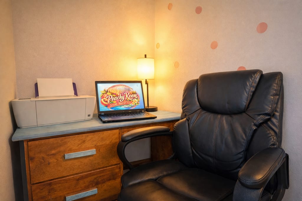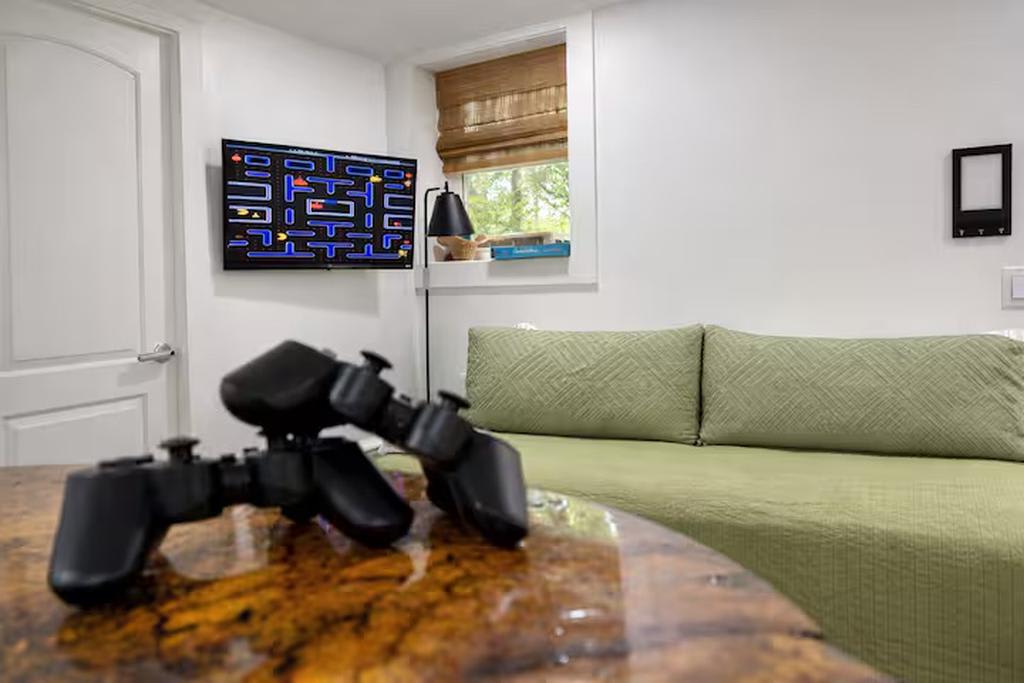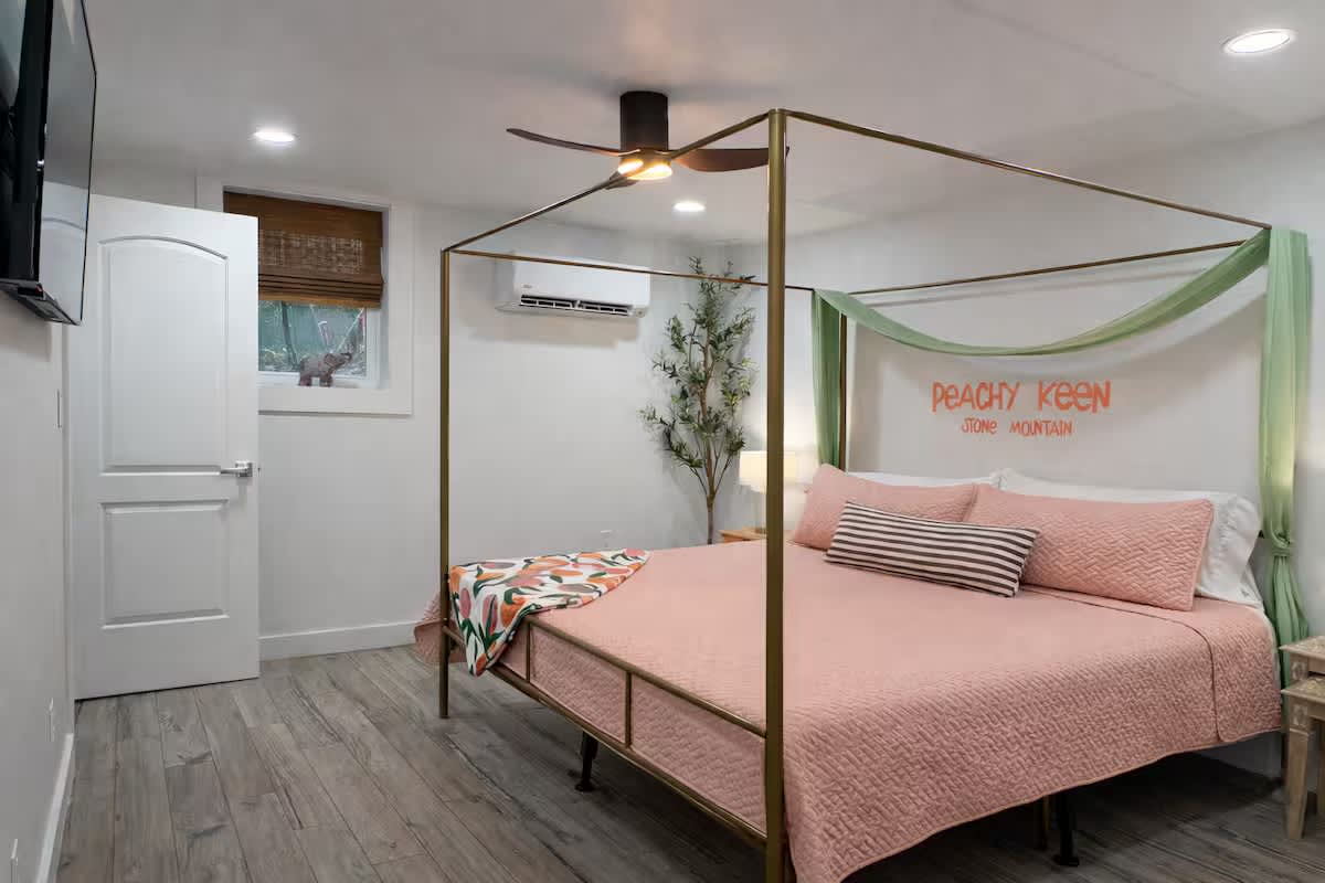Welcome to Peachy Keen – Stone Mountain, a basement apartment ideal for families! This garden suite features designated parking, a private entrance, two king beds, and two twin beds. Stay entertained with arcade and board games, a take-one-leave-one library, and a Wii. The primary bedroom includes a dual-sink vanity and a soaker tub, while the second suite offers an office desk with a printer and laptop. Both rooms have 55" smart TVs and full ensuite bathrooms. A variety of pet- and kid-friendly amenities make traveling a breeze. Please note: Myself, my husband, and our infant live upstairs. Explore Nearby • Walk (~1 mi) → Downtown Stone Mountain: locally owned brewery, bookstore, coffee shop, restaurants, and more • Walk (1 block) → McCurdy Park: outdoor gym, playground, swings, picnic tables, baseball fields, and walking trail • Walk or drive (~1.5 mi) → Stone Mountain Park: hiking, lake access, and numerous events (FREE parking pass included — $20/day value!) • Located in the quiet, historic district of Stone Mountain Village • 30 mins to Downtown Atlanta → Georgia Aquarium, SkyView Ferris Wheel, World of Coca-Cola, National Center for Civil & Human Rights, and more • 30 mins to ATL International AirportWELCOMING ENTRY - ChargePoint Level 2 EV charger (FREE) - Detailed, step by step check-in directions - Designated, off-street parking for 2 cars - Lighted parking and pathway with covered entry - Smart locks for convenient & secure access - Custom guidebook with local recommendations SPACIOUS ENSUITES PRIMARY BEDROOM 1 - Canopy-style king bed with memory foam mattress - Side tables and lamps with USB ports for convenience - 55” smart TV with streaming channels - Walk-in closet - Mini-split AC/heat with independent room control - PRIMARY BATHROOM 1: soaker tub, shower panel with extendable wand, double-sink vanity, and separate water closet PRIMARY BEDROOM 2 - King bed with hybrid mattress - Side tables and lamps with USB ports and outlets for convenience - 55” Smart TV with streaming channels - Mini-split AC/heat with independent room control - Dedicated office desk with: color printer, rolling office chair, and Windows laptop - PRIMARY BATHROOM 2: walk-in shower with shower panel and extendable wand ENTERTAIN THE WHOLE FAMILY GAME ROOM - Twin daybed and a twin trundle bed - Custom bar-height table with seating for 2 - 32" Smart TV with streaming channels - Retro game console with 2 wireless controllers, includes 20,000+ built-in games & 18 emulators - Take-One-Leave-One wall library - Giant Checkers, chess, and tic-tac-toe - Board and card games LIVING ROOM - Leather sectional - 60” Smart TV with streaming channels - Nintendo Wii game console with: 4 controllers, 4 nunchucks, Super Mario Bros, Jenny Craig workout, & WiiPlay STOCKED KITCHEN/DINING/LAUNDRY - Cooking and dining essentials - Stainless steel appliances, including: a flat-top range, dishwasher, ice maker, microwave, air fryer, toaster, and toaster oven - Butler's pantry with a coffee bar, featuring a dual K-cup and drip coffee maker - Granite countertops - Dining table with seating for 4 - Kids dining table & 2 small chairs - Full sized washer and gas dryer IDEAL FOR TRAVELING PROFESSIONALS - Office space inside of Master Bedroom 2: desk, rolling office chair, color printer and Windows laptop - Highspeed WiFi - Iron & ironing board FAMILY & PET FRIENDLY