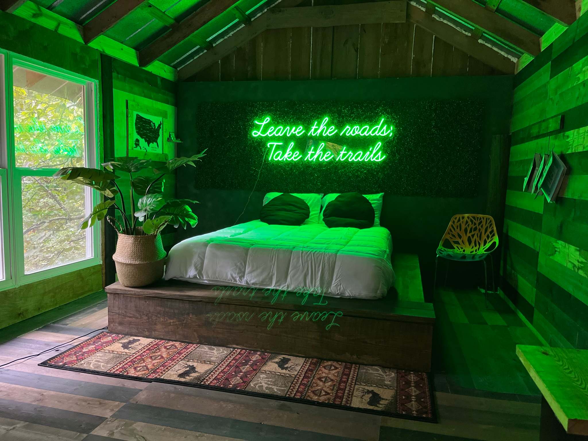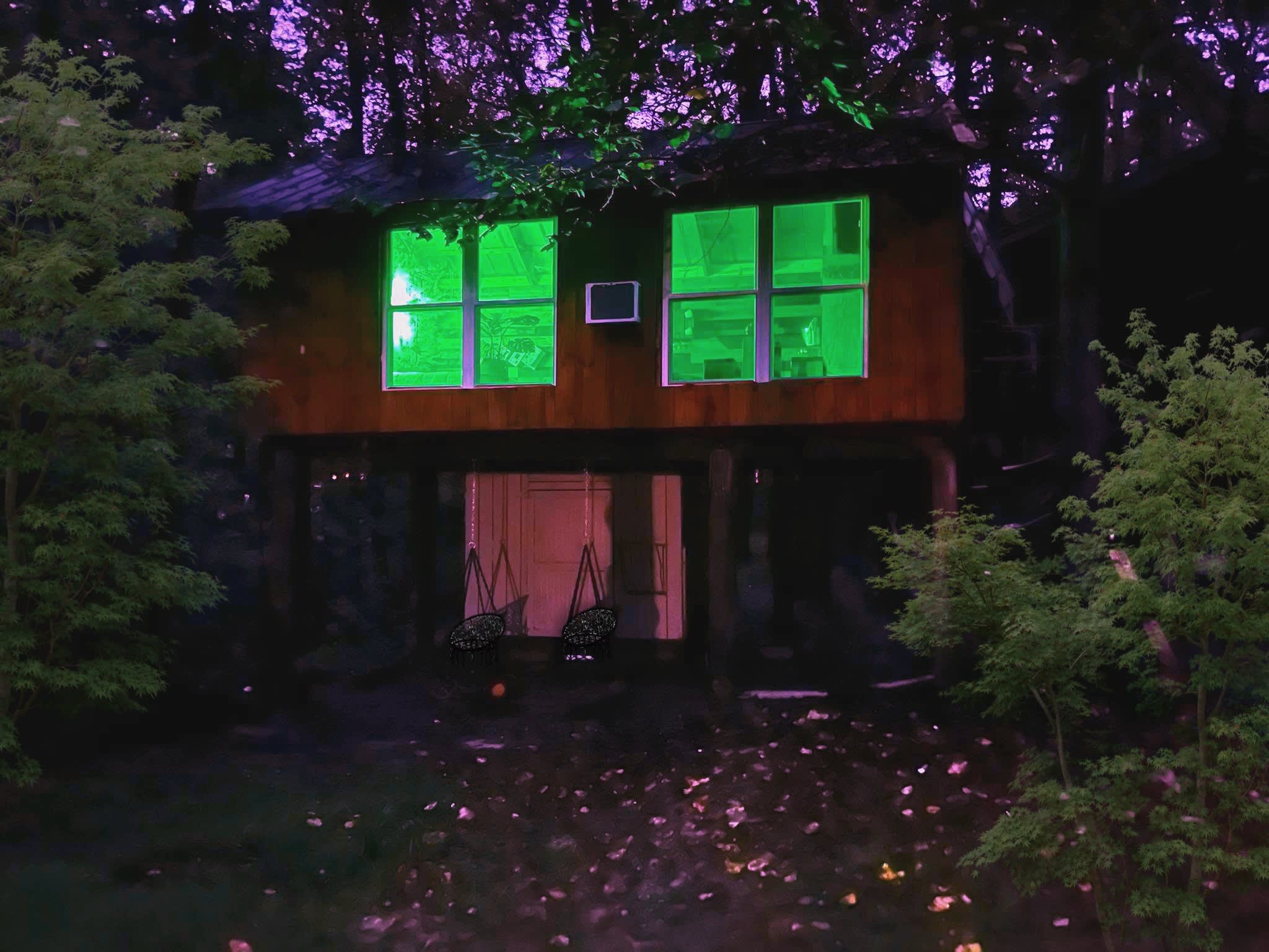This treehouse was architecturally designed by the owner Karee as well as interior designed. Every wood piece of art and furniture throughout the treehouse was built by hand at the estate i.e bed frame down to the paper towel holder. Her design concept was a Treasure Chest, inspired by her 3 boys. A Treasure Chest because they are typically made from wood with metal brackets keeping everything together, normally when shown in movies they have a glowing neon light emitting from the inside. The treehouse lights up like a Treasure chest at night. Imagine a large wooden box sitting 15ft above the grounds with a metal roof keeping everything together. The treasure inside being YOU, & whatever memories you choose to create while you stay at the Estate.  Three comfortable adjacent hammocks, 2 bowl macrame swings, shaded by lush greenery for relaxing conversation, reading or rest. A fire pit area, waterproof indoor/outdoor electric candles and twinkling string lights to set a relaxing ambiance, coupled with the sound frogs, cicadas, crickets, grasshoppers, and katydids to ensure a peaceful nights rest. Learn more about this land: There is not a safer place than in the middle of our private woods! The Treasure chest Treehouse is one of the most unique stays in Georgia. We are a 8 acre agriculture farm estate we raise chickens, monarchs, bees, frogs & ducks. Have private trails, swings, hammocks, creek & swinging picnic table