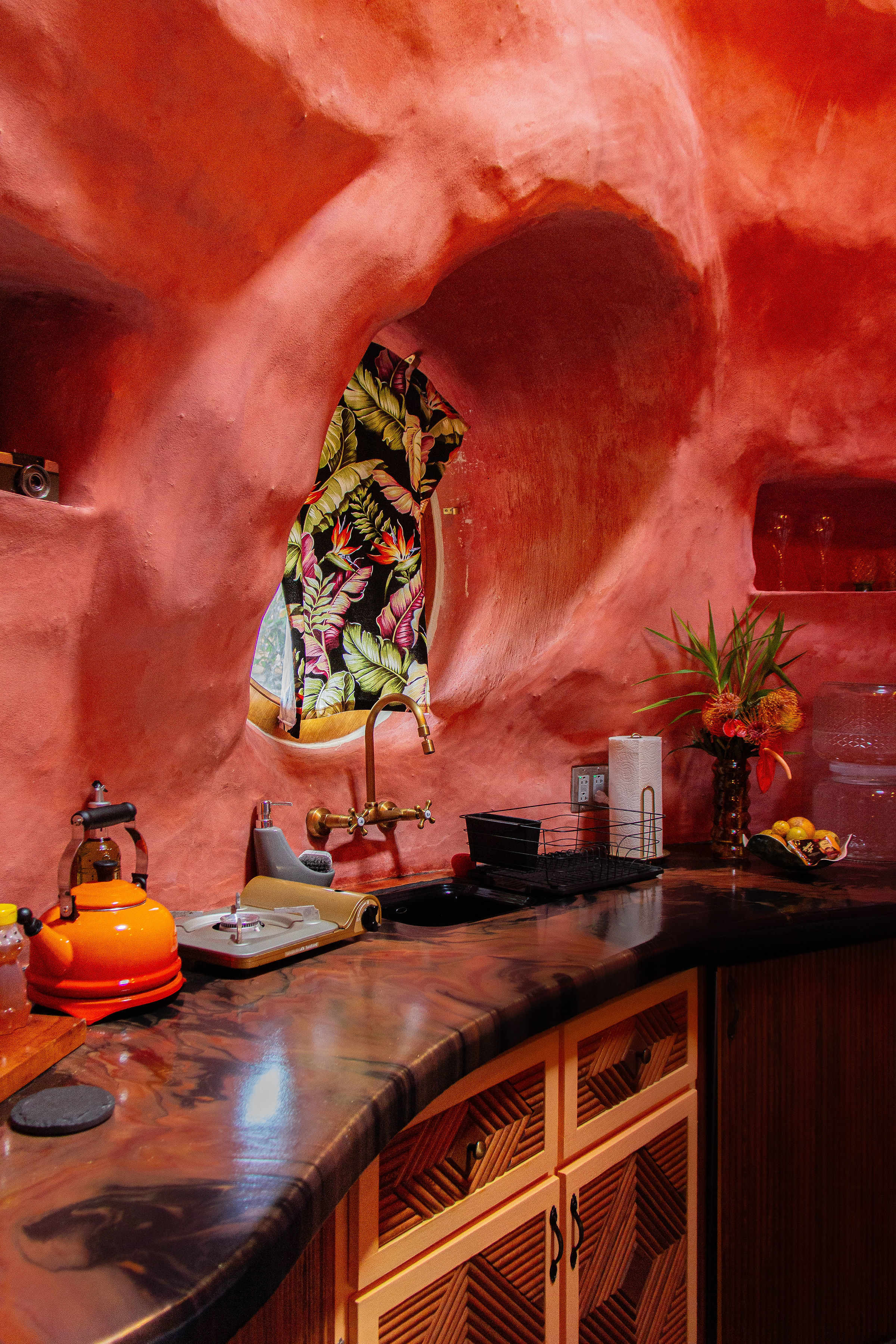 Stay in a volcano, on a volcano... Don't let your adventure stop at the national park! Come experience living in a luxurious volcano dome home where you will live in synergy with the natural exquisite surroundings. The cinder we used to build the whole dome comes from the local query produced from big island's natural volcanic features. We promise you'll lava it! Location and Amenities: Strategically located- •19 miles (25 minutes) from Hilo •23 miles (35 minutes) from Pahoa •12 miles (15 minutes) from Keaau •10 minutes from Volcano Town 2 hours from Kona, we recommend flying into Hilo if you book the same day of your flight! A SUV or jeep is an ideal choice when staying here as the last 500 feet (1 minute of drive time) of the drive is off-road and quite rocky. You will transverse your private entrance passing the Cassandra's (the host's) tiny house. When you arrive you will be greeted by the serene beauty of the jungle. While is isn't 100% private as the host lives next door, we can still promise a peaceful escape from the everyday world. We recommend stopping for snacks in Hilo or Keaau on the way up as those towns have more options than the sleepy Volcano Village. Important Considerations Before Booking: As luxurious and adventurous as Inn a Volcano is, staying in an off-grid volcano dome home in the Hawaiian jungle comes with expected 'challenges.' My goal is to give you an experience that combines Tarzan's hideout with a 5-star experience so lets get you prepped! 1. Water Source •The tap water comes from rain catchment. It is not potable (not for drinking.) We will provide drinking water. 2. Electricity •We're solar-powered, so please conserve energy. High voltage items like hair dryers or irons are not provided. If you bring these and use them there is a chance that the power will shut off. Please shut off lights when you leave. The windows and a skylight allows ample natural light during the day. 3. Weather •We are located on the rainy side of the Big Island so be prepared for wet weather. Enjoy the pitter patter of rain like a playlist. Let it relax you, and don't let it dampen your plans. 4. Wildlife •Since we are in the jungle, don't be shocked if you see bugs and insects such as moths, fruit flies, and mosquitoes.Don't let your adventure stop at the national park! Come experience living in a luxurious volcano dome home where you will live in synergy with the natural exquisite surroundings. The cinder we used to build the whole dome comes from the local query produced from big island's natural volcanic features. We promise you'll lava it! The space **Please read the full listing before booking*** Welcome to Inn a Volcano! Enter through the archway and be transported into a Volcano. With 25+ feet high ceilings and a skylight at the cherry top, the sunlight shines onto floor that is... lava. Looking hot, right? No worries because the 16 inch thick cindercrete walls keep things cool and regulated. And guess what? The dome doubles as a sound studio. Stand in the middle of the dome and hear the deep echo created by the cindercone shaped room. Cue the music! Waking up from snuggling the softest sheets in the cozy circle bed, you can brew your morning coffee or pick some hibiscus from the garden and make fresh tea. The bedroom was designed with relaxation and comfort in mind. This is a perfect place to unwind after a long day. Lava lamp niches set the mood at night and the coqui frogs will sing you to sleep as you stargaze through the skylight. The bathroom is a blissful calm contrast from the firey red walls and lava floor in the main room. Open the circle window and breath the fresh rainforest air above the custom made hand polished limestone bathtub. Light a candle and take a bath or use the rainfall shower head. Admire the jungle flora just outside of the bathroom window, full of vibrant colors and life. This property is fully off-the-grid with the electricity being powered by the sun and the rainwater being harvested from the house next door. We love to let people experience a luxury version of off-grid life, flushing toilet included. Everything in this volcano is custom-made. We spent the better part of 8 months trying to create the best luxury eco experience possible for all guests. We hope that you see the beauty in each detail we thought of just for you.
