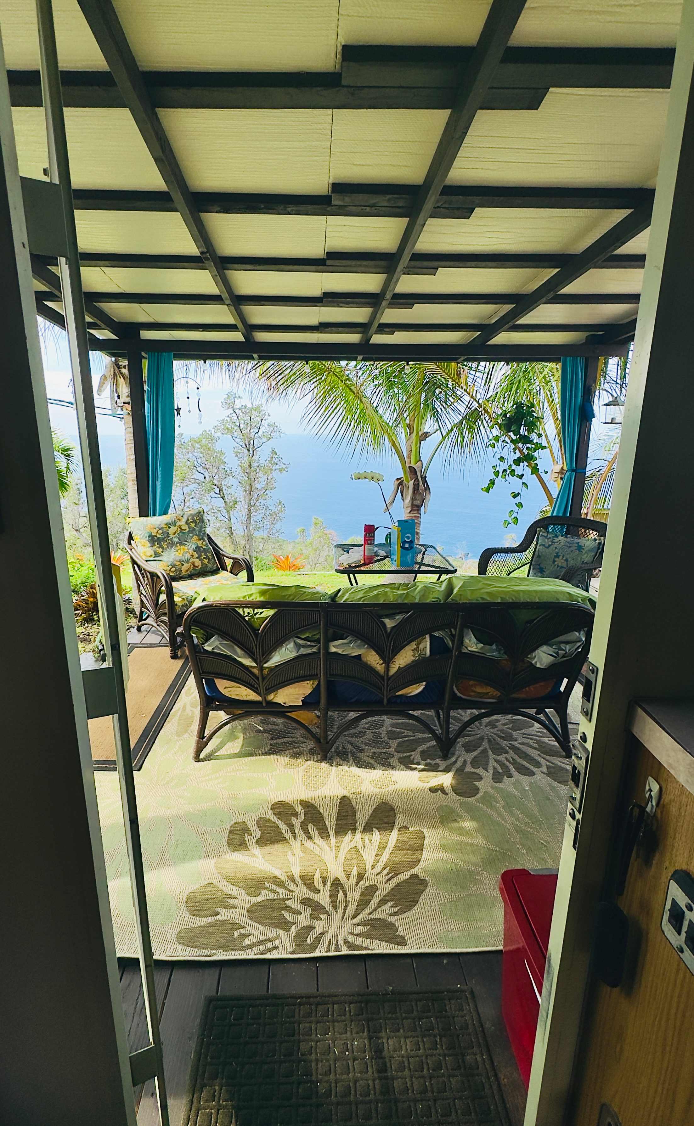 This felt like our antidote to high cost, sterile-looking tourist resorts, but with a resort worthy view, and genuine hospitality. The Comfy RV was exactly our speed, and was a magical experience. This spot is ideal if you don’t mind the quirks and nuances of an older RV and value quiet and the natural beauty of the island. The RV is older, but is well maintained, clean and well stocked with what you need to cook, etc. The lanai has the most gorgeous view and is an excellent spot to sit with a cup of coffee, we saw whales one morning, or to do homework midday as my kids did. The evening sunset is beautiful. Mark and Chris are kind and generous hosts. Getting down the driveway from the main road definitely requires 4WD…, for sure. My only hesitation in recommending this gem is that I don’t want it to be booked up the next time we visit! Part of why we want to come back to Hawaii is to have a chance to stay there again.