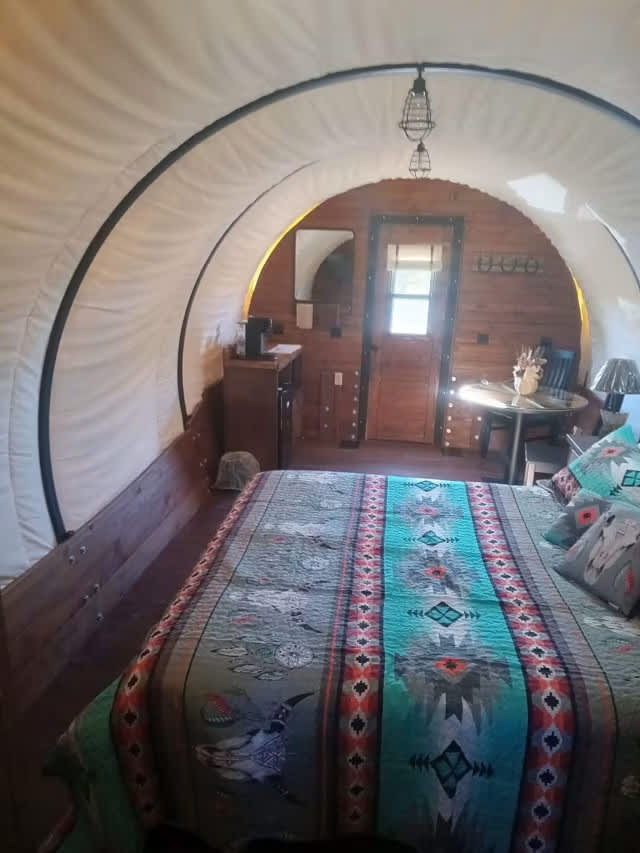 Take a trip back in time by staying in our brand new Covered Wagon. The Covered Wagon includes the following Features and amenities: King bed with a comfortable Pillow top mattress Keurig Coffee Maker with complimentary coffee Refrigerator Microwave Hairdryer Flat screen TV with streaming channels Air conditioning and heat Bathroom complete with full-sized shower Smoke free and pet free