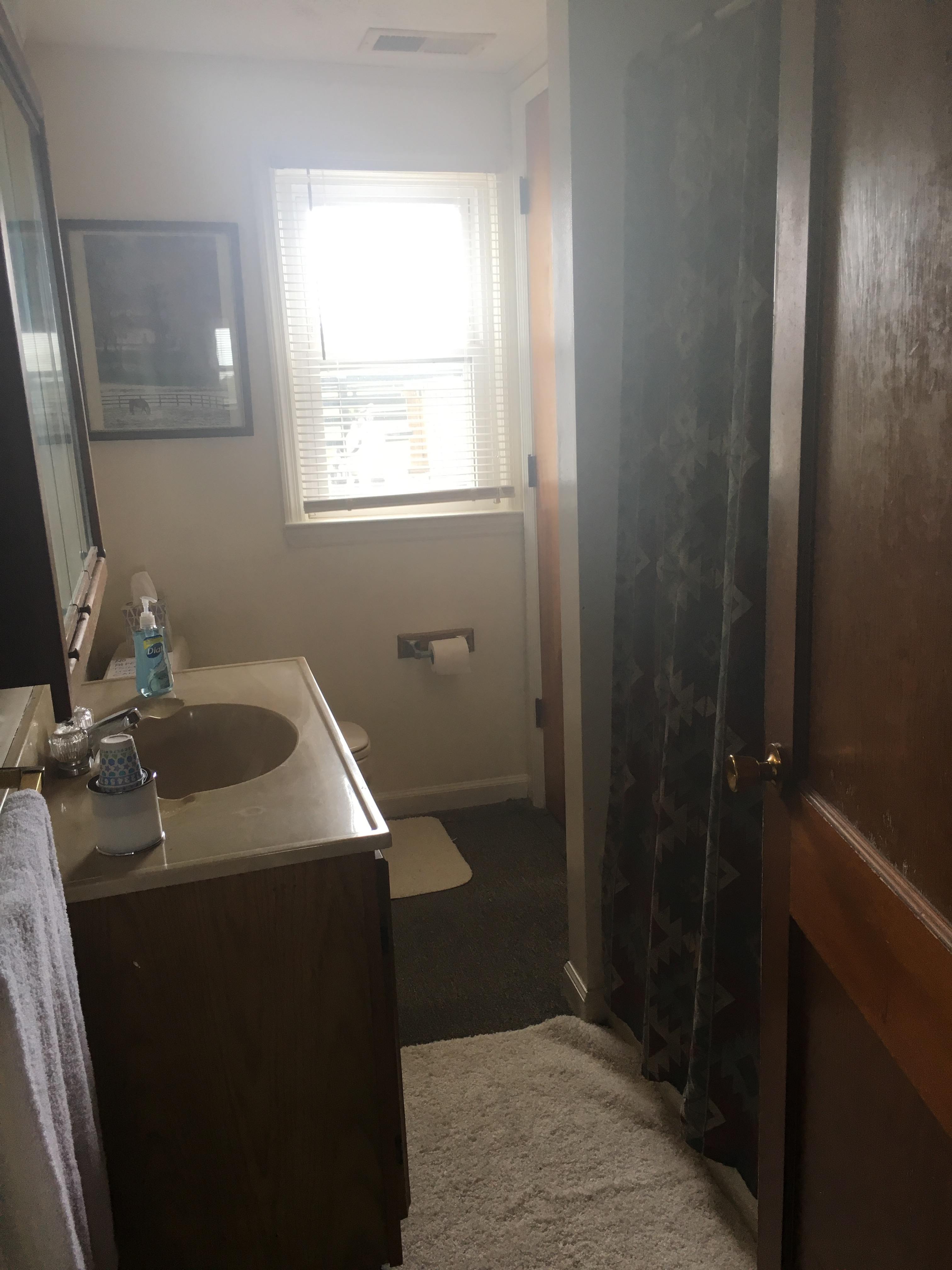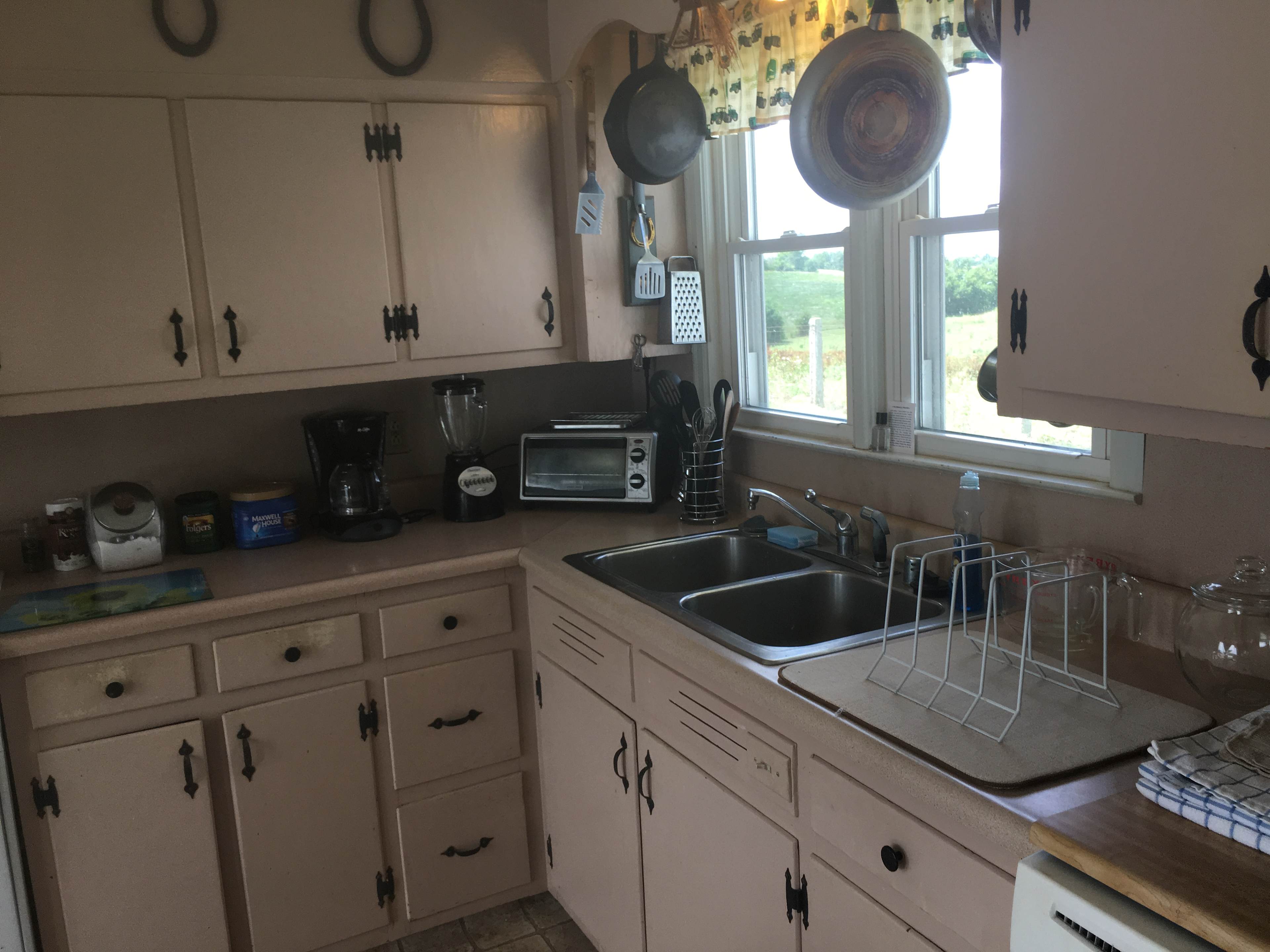 Downstairs we had use of a fully supplied kitchen with microwave, dishwasher, full-sized fridge, electric stove/oven, cookware and dishes. There is also a small dining space that seats four. Nice sized living room. Two bedrooms and a nice sized bathroom with shower and tub. One bedroom had an antique wardrobe, a nice-sized closet, and a full sized bed with quilt and linens. The other bedroom had two twin-sized beds. The décor is country chic. Very clean and neat.