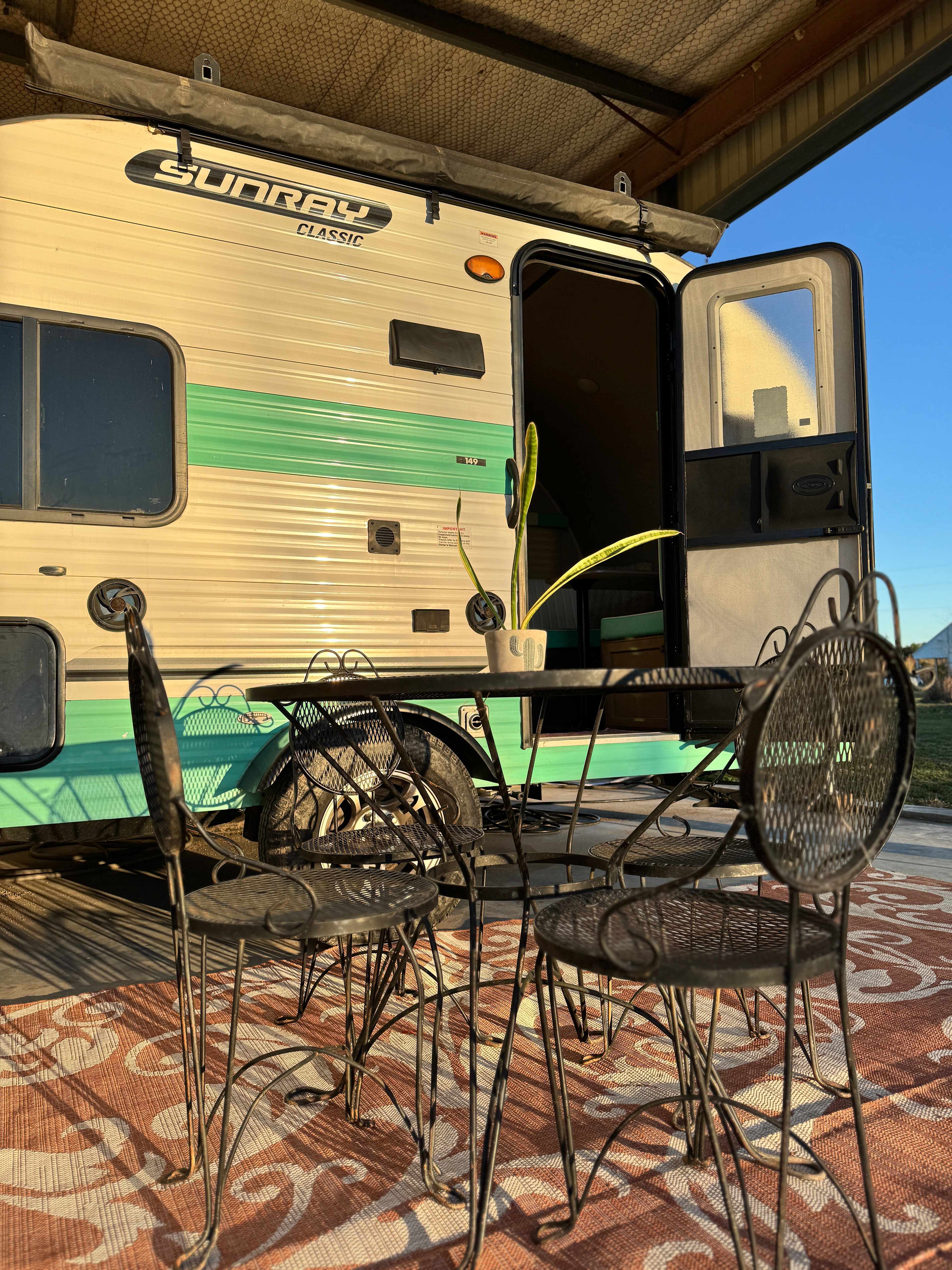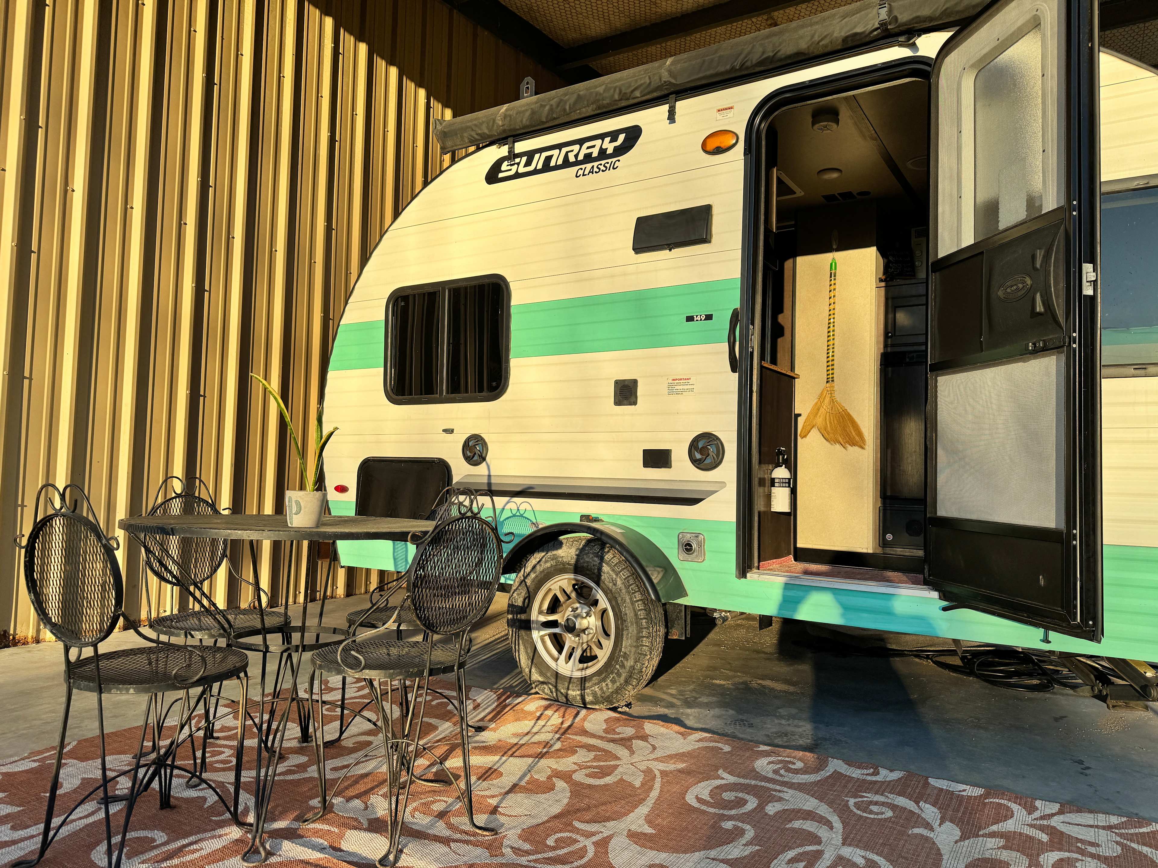 The Sunray camper includes a micro kitchen with a stove and sink, ideal for guests planning simple meals and light cooking. Nestled under a warehouse wing, the camper offers added weather protection while still feeling connected to the land. Outside, enjoy a private firepit overlooking the farm and expansive sunset views, along with an iron dining table for outdoor meals. Optional add-on experiences are available, including s’mores by the fire or a cozy outdoor movie night with popcorn and a projector. Guests may choose a movie to stream from Amazon or Disney+. This stay is designed for ease, comfort, and relaxed country evenings.The SunRay camper includes a micro kitchen with a stove and sink, ideal for guests planning simple meals and light cooking. Nestled under a warehouse wing, the camper offers added weather protection while still feeling open to the land. Outside, enjoy a private firepit overlooking the farm and expansive sunset views, along with an iron dining table for outdoor meals. Optional add-on experiences are available, including s’mores by the fire or a cozy outdoor movie night with popcorn and a projector. Guests may choose a movie to stream from Amazon or Disney. This stay is designed for ease, comfort, and relaxed country evenings.