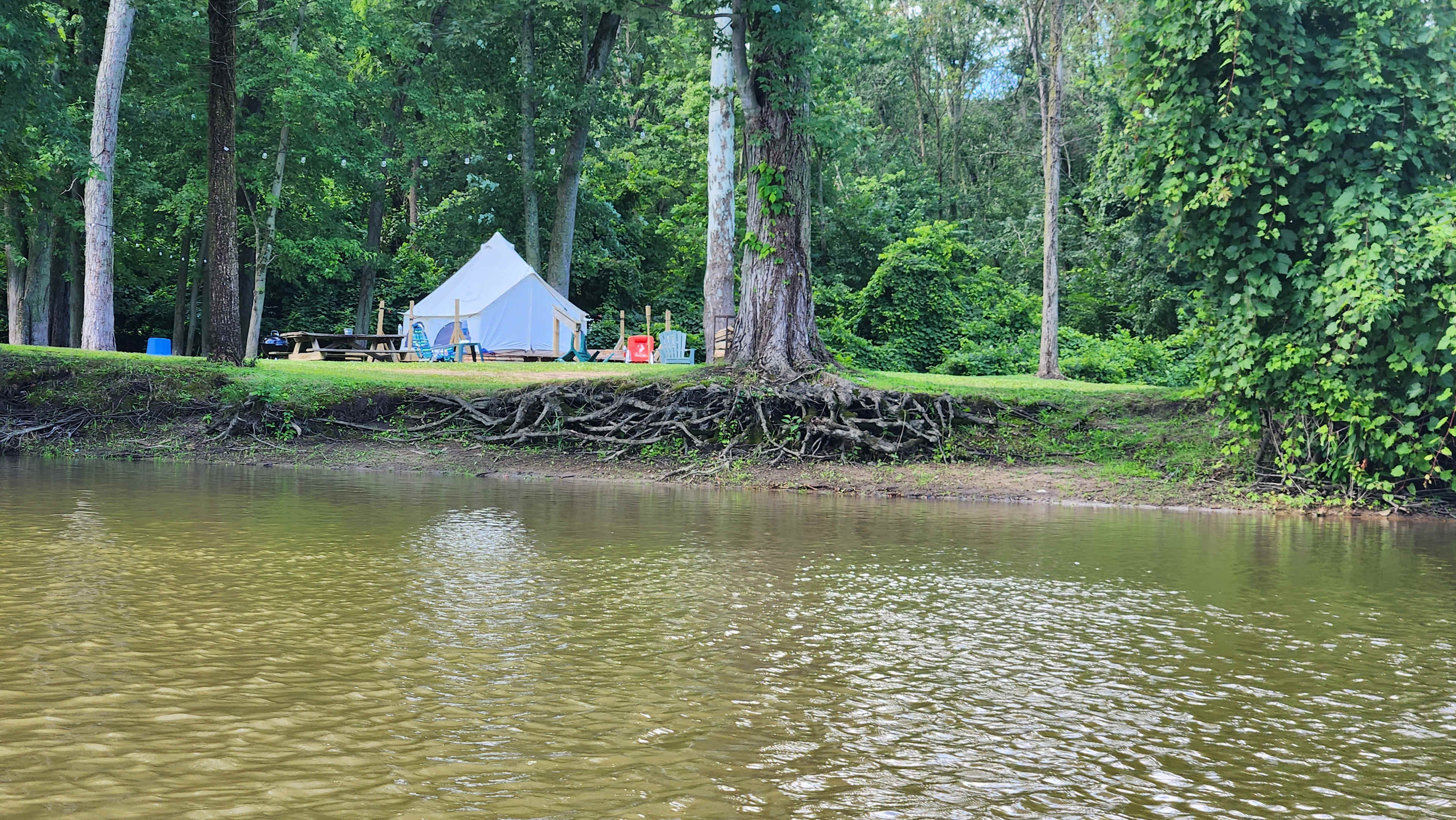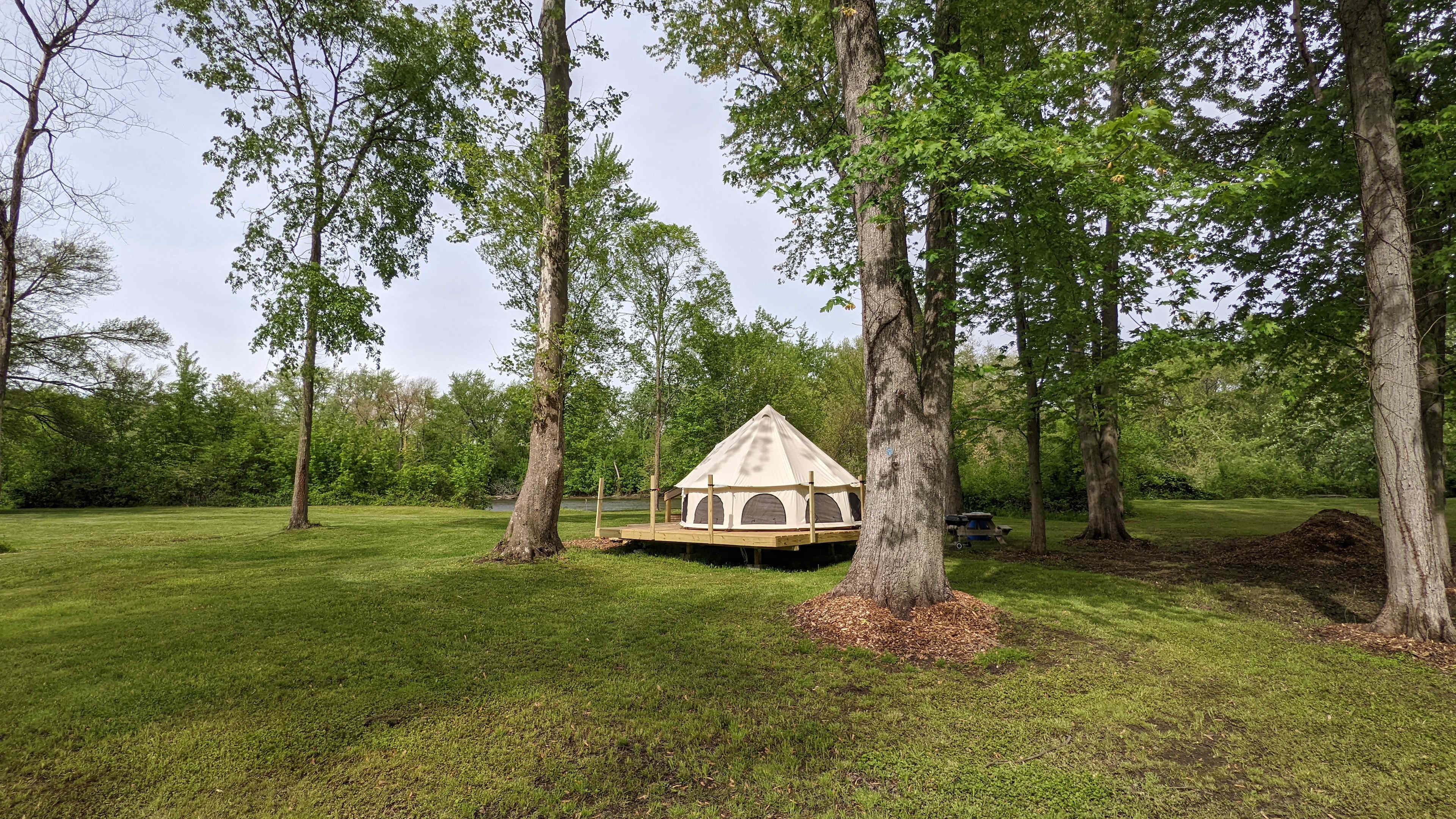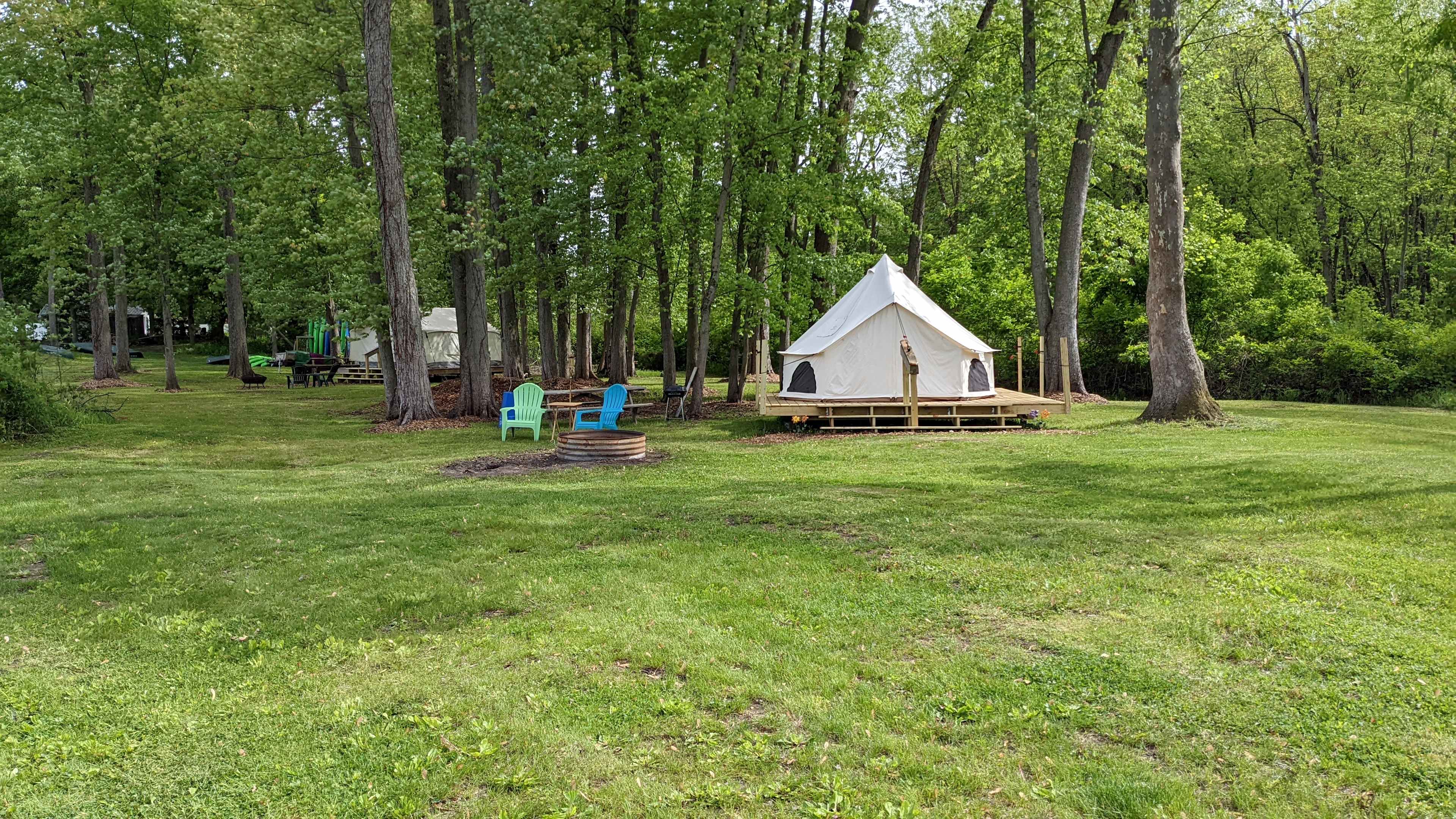 Our 13' diameter Cabana Bell Tent on our private river bank is furnished with 3 air mattresses, linens, throw rugs, picnic table, fire ring and small grill. Firewood is provided and charcoal for the first meal. (bring xtra charcoal). We even supply a 5 gal water jug with hand pump. This is a great spot to retire after a day of fun and excitement touring our natural river or the local wineries. Local to the Saugatuck Lakeshore, we are minutes away from shopping, dining and local nightlife along the waterfront as well as countryside wineries and vineyards. We also offer kayak and canoe rentals onsite.