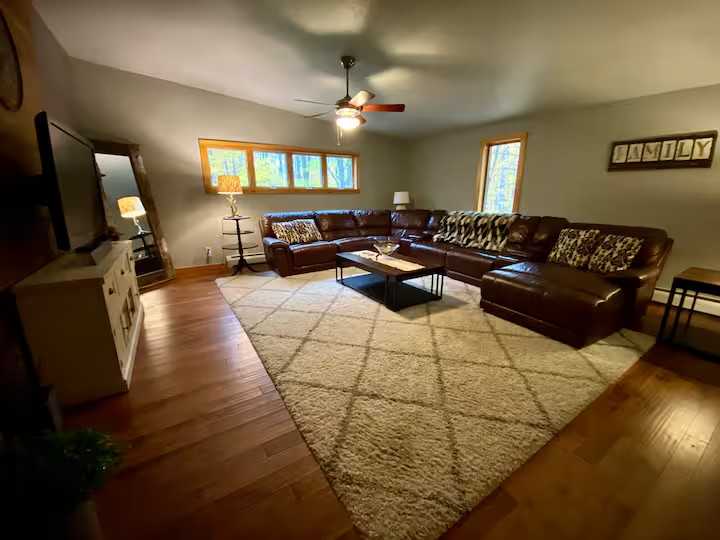 Custom log cabin in the woods just 15 minutes from downtown Marquette. Peaceful area yet close enough to go enjoy shops, restaurants and beaches. Great view of Lake Kawbawgam from the patio (no lake access). 40 minute drive to Pictured Rocks. Fire pit in the backyard and a fireplace in the living room available for use. Lower level has a bar with TV and game room with a ping pong table and dart board. Perfect space for families and great for snowmobilers! The space Cozy log cabin with everything you need! The kitchen, both living rooms, office, 3 bedrooms, and a full bathroom are all on the main level. The upstairs loft bedroom has 1 king bed, a moveable wall divider for some privacy, and a full bathroom. The full bathroom has a large soaking tub, rain head shower, and bidet. The basement has 1 bedroom with a king-size bed, a full bathroom, laundry, a ping-pong table, dart board, bar area with a kitchenette, and a walk out to the firepit. There are so many spaces to gather with friends and family! There is a large patio area, so you can sit outside and enjoy some peace and quiet. Guest access Guests have the entire home to themselves. Other things to note The house sits on 4 acres in the woods. It has a lake view but no lake access from the property.