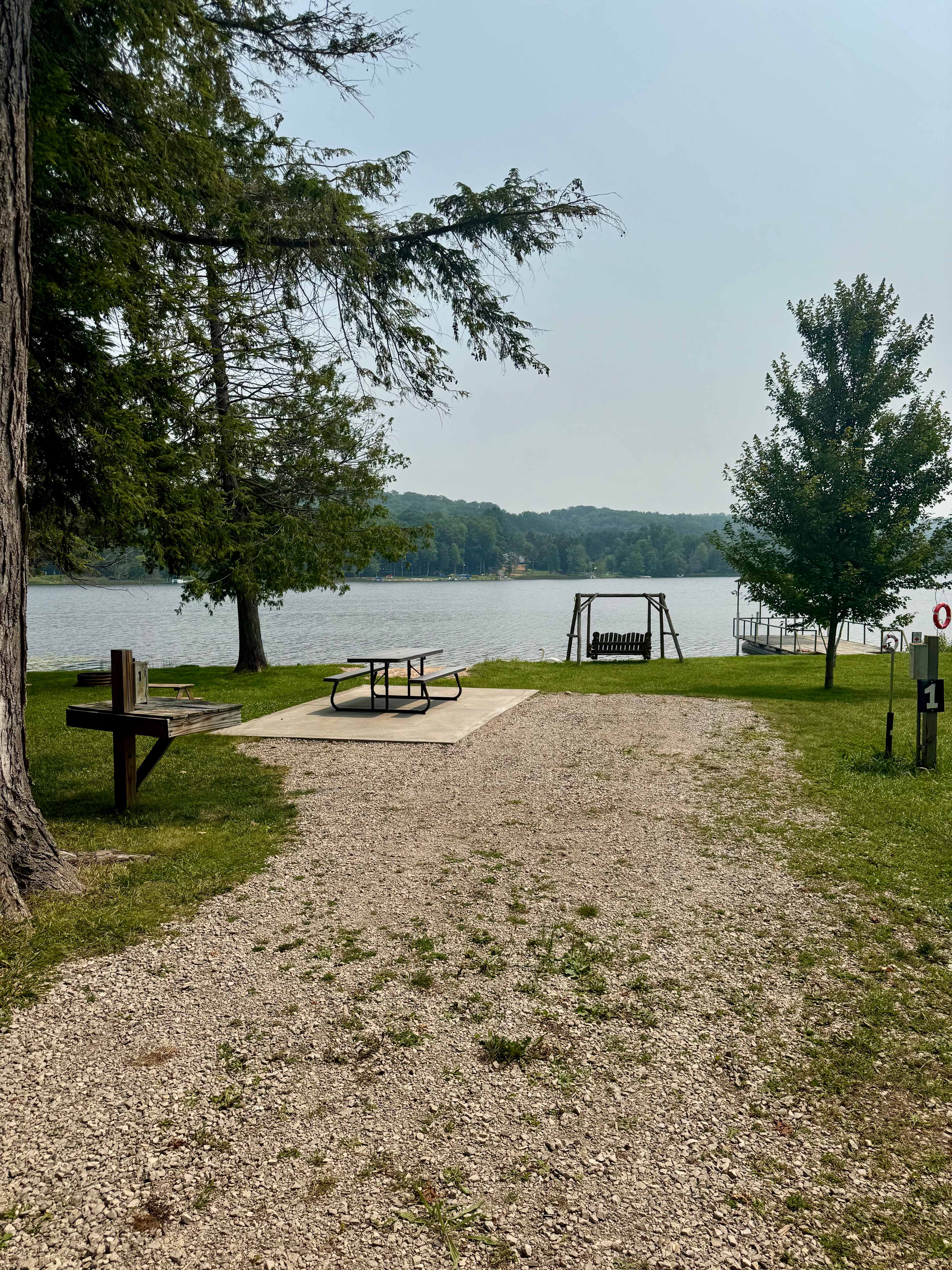 Large grassy waterfront site with cement pad, picnic table and fire ring. Full hookup (water/sewer/electric 20/30 amp). Firewood available for purchase. *No tent camping. There are no bathroom facilities on site.