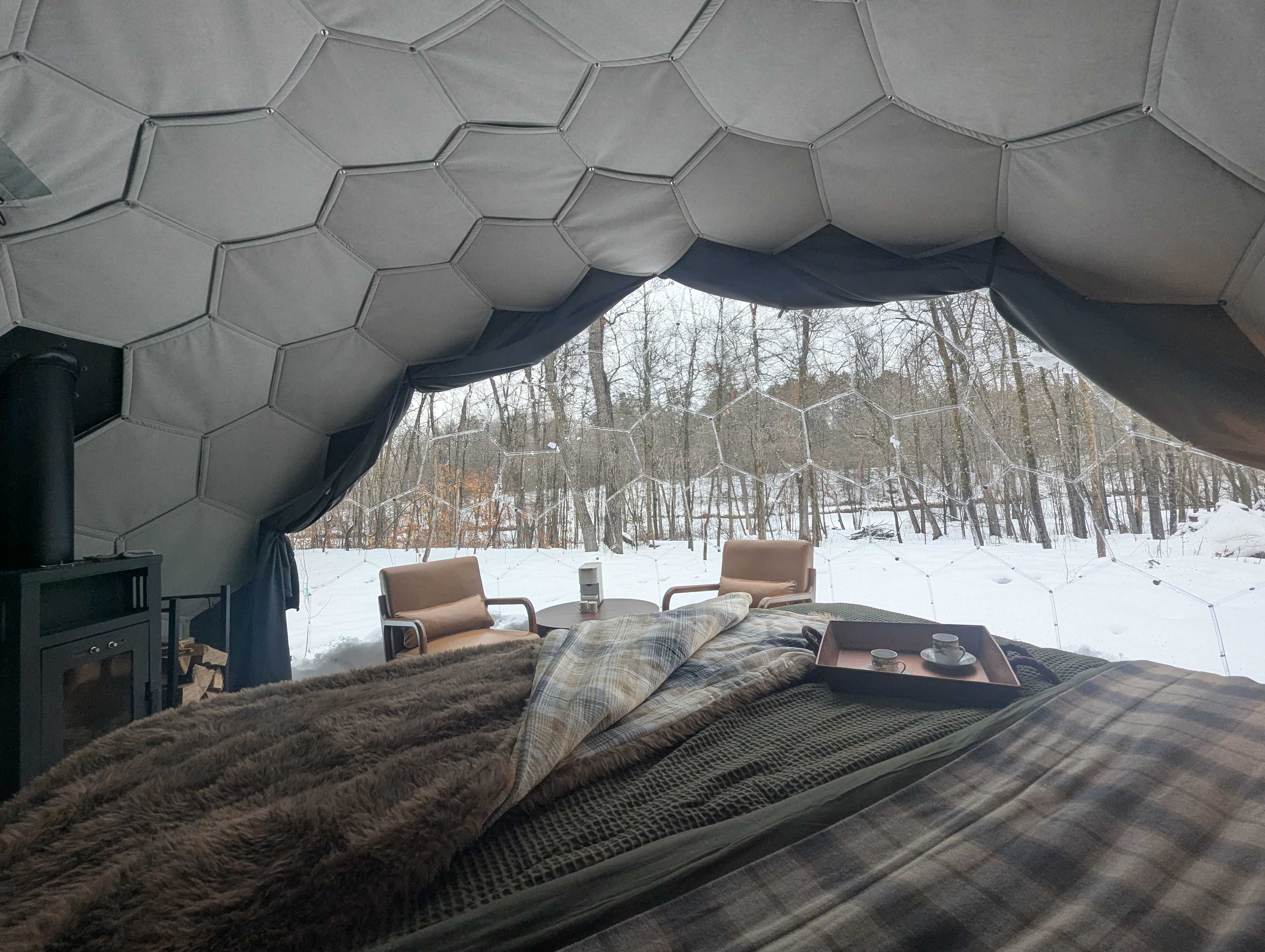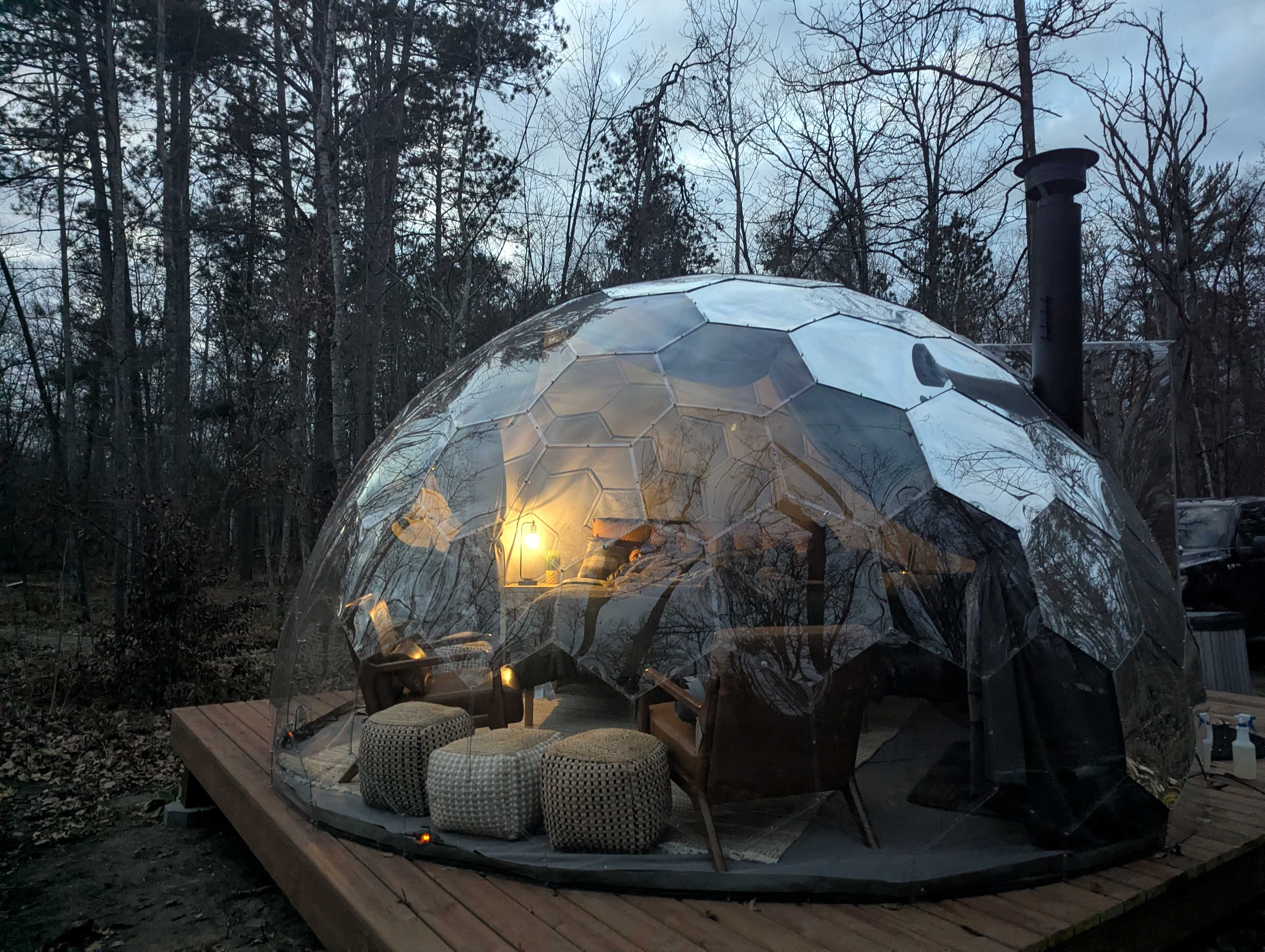 The Mirror Hypedome is a private, insulated geodesic dome designed for quiet, year-round stays along the Mississippi River near the Cuyuna Recreation Area. Featuring a king-size bed and reflective exterior that blends into the surrounding forest, this dome offers thoughtful design and natural immersion in the Northwoods. Each dome includes: A private wood-fired coil hot tub Dedicated riverfront access A private bathroom with shower located in the main building A wood stove for winter heating (firewood provided) Supplemental electric heaters Outdoor seating and fire ring A coffee maker Mini-fridge Lighting and electrical outlets The wood-fired hot tub is filled and heated by guests. Water and firewood are provided, and heating the tub requires time and attention. Many guests enjoy the slower rhythm this creates as part of the experience. During colder months, the wood stove inside the dome serves as the primary heat source. In sub-freezing temperatures, guests should plan to maintain a fire overnight to ensure continued warmth. Instructions are provided upon arrival. (Josh tested it this winter at -27* and survived, but did get cold when his fire went out at 2am!) Designed primarily for couples, the dome comfortably accommodates two adults. Infants and small children who bedshare are welcome. A two-night minimum stay is required to allow guests time to settle in and fully enjoy the river, forest, and outdoor amenities. Mirror Hypedomes offer a peaceful balance of comfort, water, and woods — close to Cuyuna’s trails, yet removed from the noise of town.