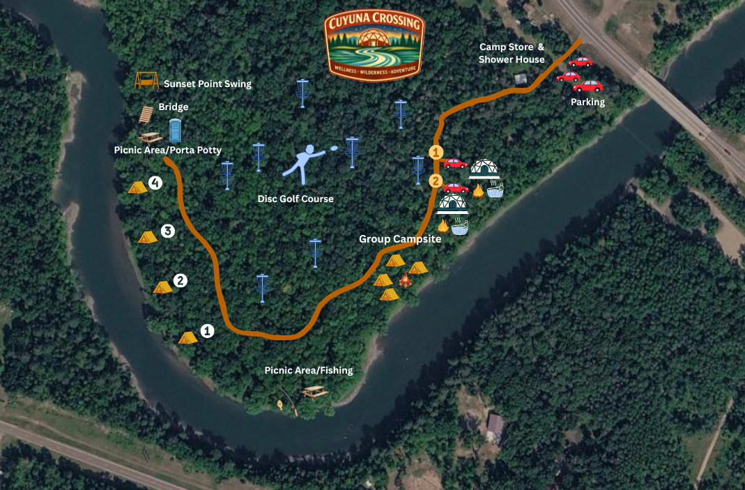 Rustic Riverside Site #4 is a walk-in tent site located along the Mississippi River within the wooded grounds of Cuyuna Crossing. Designed for guests seeking a simple, quiet camping experience, this site offers river proximity and natural shade in a peaceful Northwoods setting. Located near the northern section of the riverfront, closest to the bridge and Sunset Point area. (Previous camper photos may depict the Sunset Point area. That area has been made public for Summer 2026.) Vehicles park in the main lot, and carts are provided to transport gear to the campsite. The short walk helps preserve quiet along the river and minimizes traffic through the woods. Each individual site accommodates one tent and includes: A designated tent area A fire ring River access nearby Wooded surroundings suitable for hammocks Sites are bring-your-own-gear, with no water or electricity at the individual campsite. A conveniently located porta potty serves the campsite area. Optional Add-On: Shower & Bathroom Access Campers may purchase access to a private bathroom and shower located in the main building. This facility is shared among campsite guests who have purchased the add-on and is available on a first-come basis. Availability is limited per night, and a door code will be provided prior to arrival. An 18-hole professionally designed disc golf course (opening Spring 2026) winds through the wooded property and is available exclusively to overnight guests during their stay. Rustic Riverside Site #4 is ideal for solo campers or couples looking to stay close to the river while maintaining privacy and quiet.