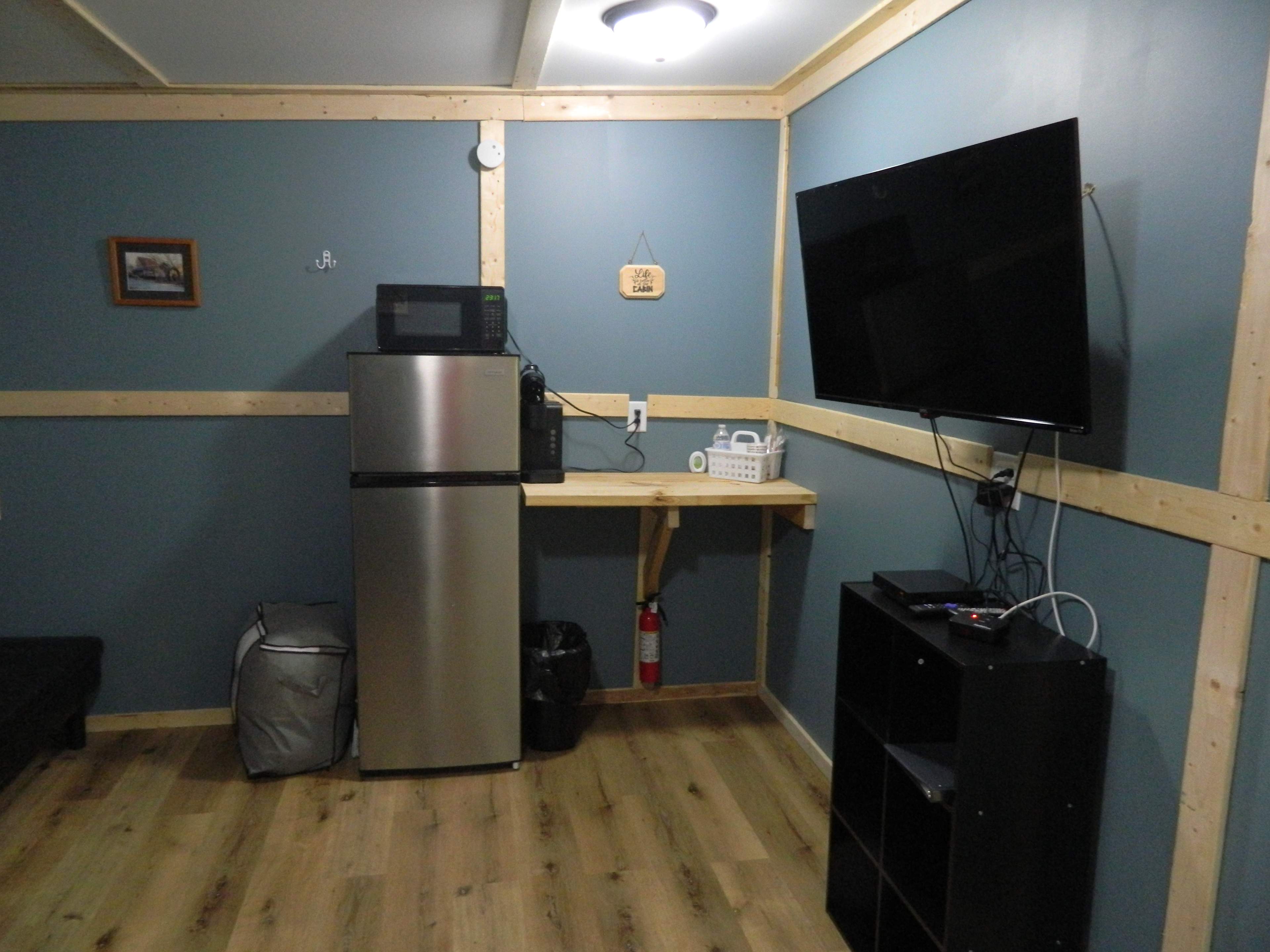 Cabin #4 sleeps 2 people with a queen bed, TV, DVD player, small fridge with freezer, bathroom. Outside is a picnic table, table and chairs, firepit, charcoal grill.