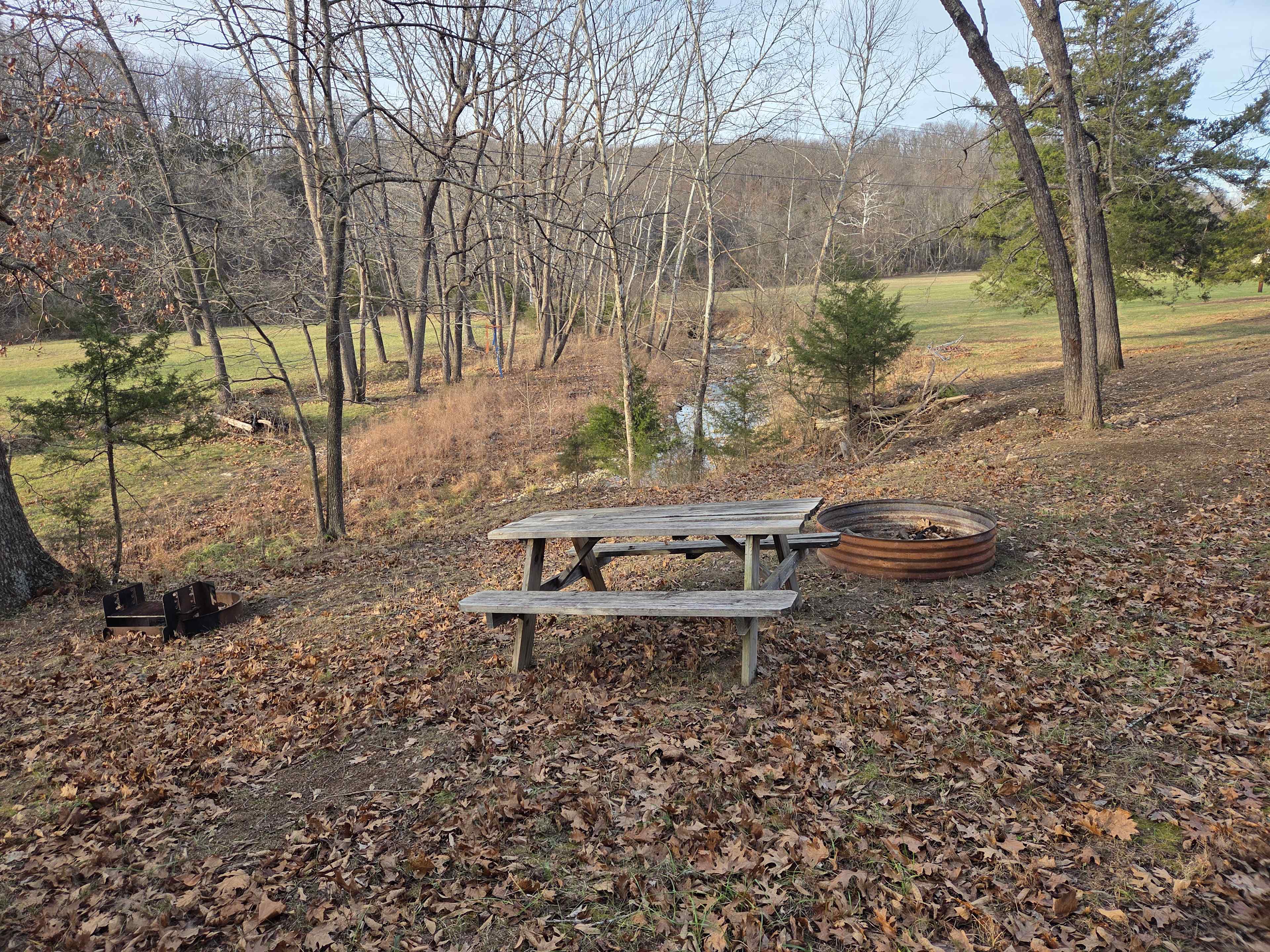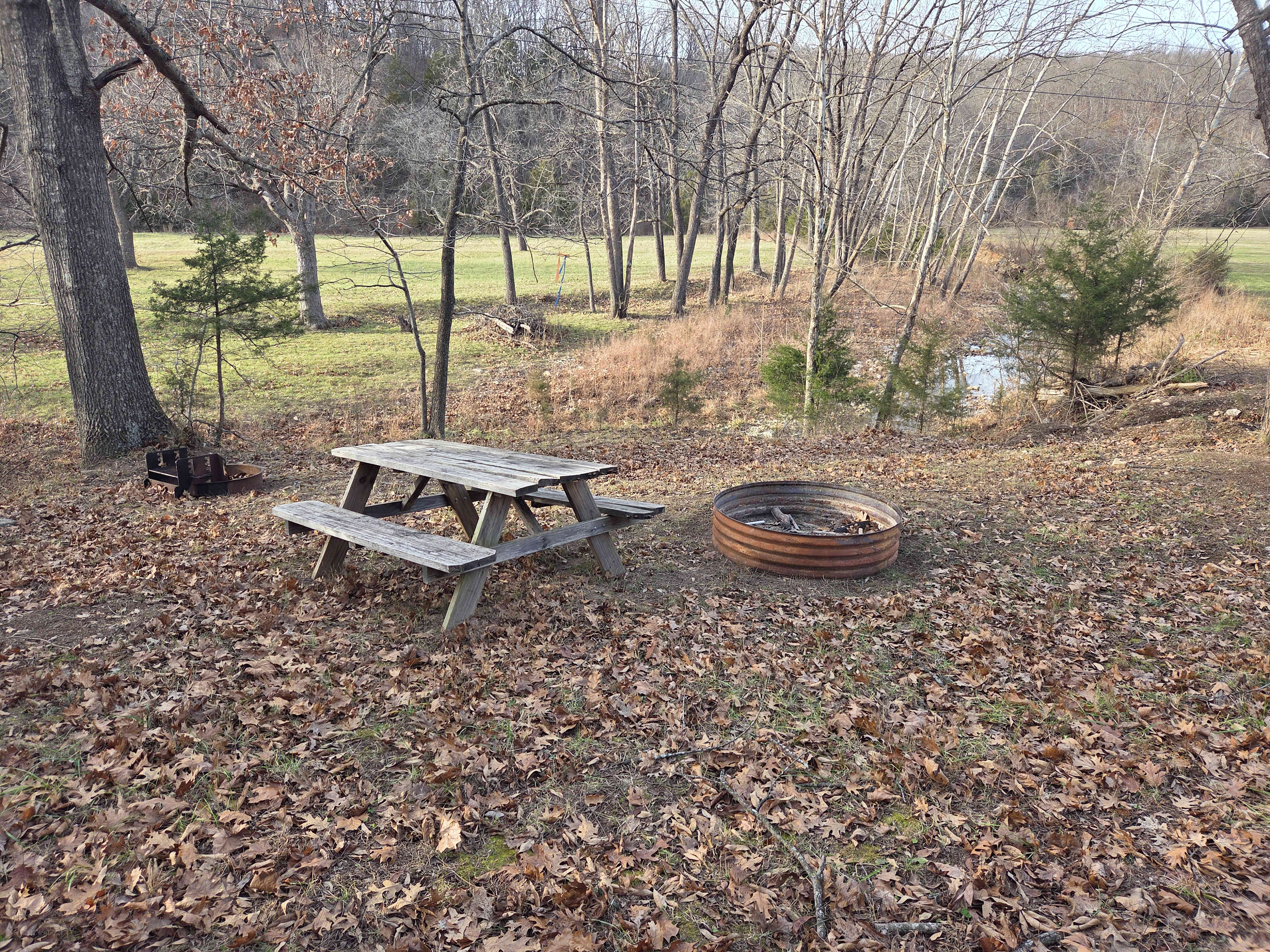 This site has a beautful and creek and field to overlook from where the campfire and picnic table is located. at this time we dont have emenities to offer other than 2 fire pits, 1 for cooking and 1 for warmth, and a picnic table. there is room to park your camper where you like, down in the field is probably more desire for the camper, but a small distance from the fire pit and picnic table. this site is located withing a mile of free access to the lake of the ozarks, multiple restraunts, and a gas station. about 3 miles from the center of camdenton. and about 5 minutes from haha tonka state park. nice room to throw a frisbee, and play in the creek.