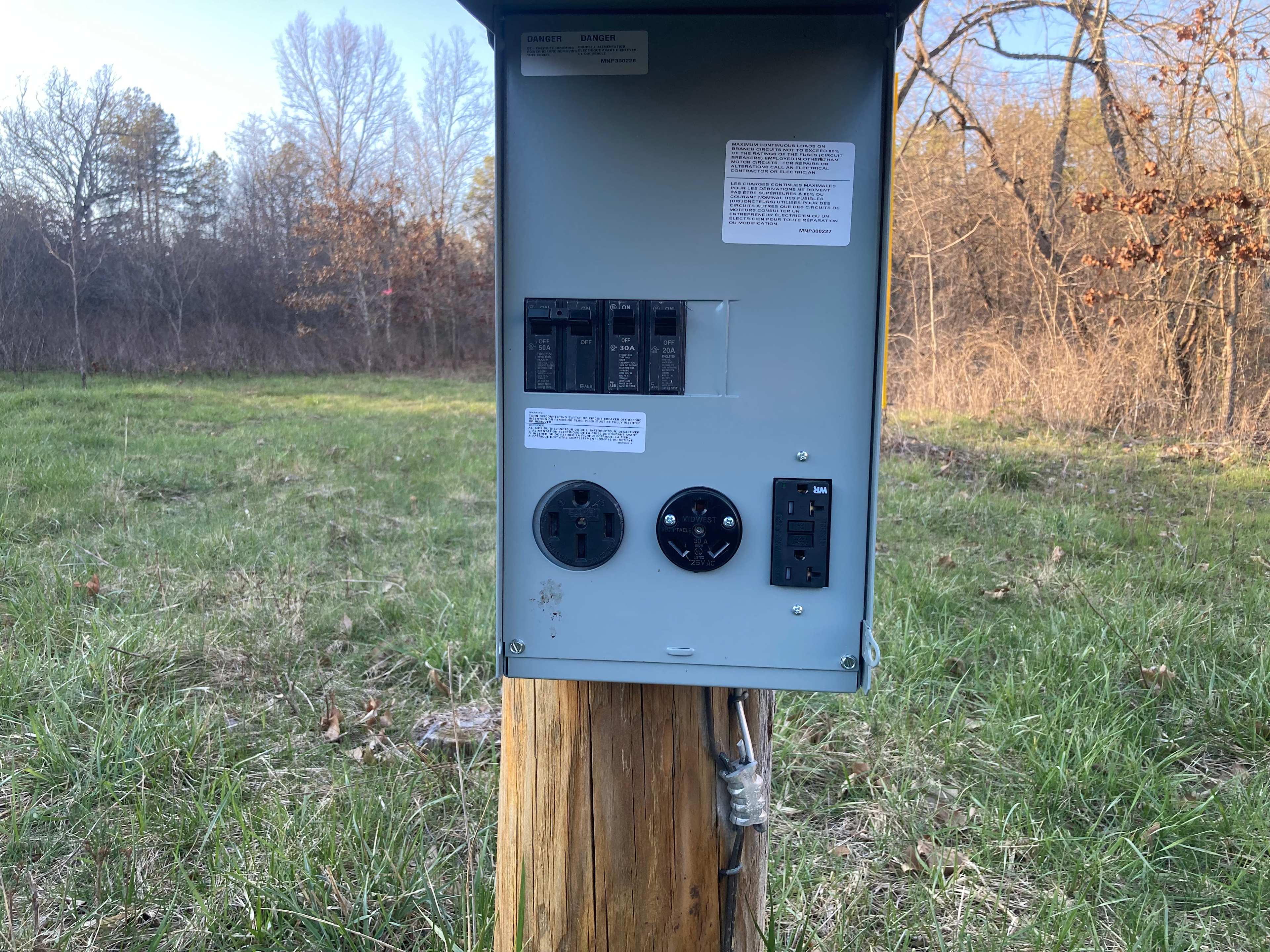 Closest electric campsite to the wonderful Rocky Falls picnic area/swimming hole in the Ozark National Scenic Riverways, where there is also a connection to the Ozark Trail to Mill Mountain Shut-Ins and historic Klepzig Mill. Enjoy the exclusive use of this electric campsite on 80 acres, mostly forest. 50 amp, 30 amp, and two 110-volt outlets. Room for up to 2 large RVs/camper trailers plus tents, so bring your family or small group. Other attractions in the area include the clear spring-fed Jacks Fork River and Current River, Blue Spring, Alley Spring, Peck Ranch Conservation Area, the Rocky Creek wild horse herd and so much more. Enjoy all these areas while camped away from the crowds in your own private campsite with a picnic table and campfire ring. About 1 ft x 4 ft of dry firewood available for $15, or about 2 ft x 4 ft for $30, from on-site wood box. Call or text host for lock combination. Enjoy the fireflies and vast dark night sky with no overhead lights in an area with very little light pollution. Campsite has good cell phone coverage with most carriers.This is the only site on the property. See main description. Plenty of room for a couple RVs and tents. Bring your family or small group (maximum 3 vehicles, 10 people).