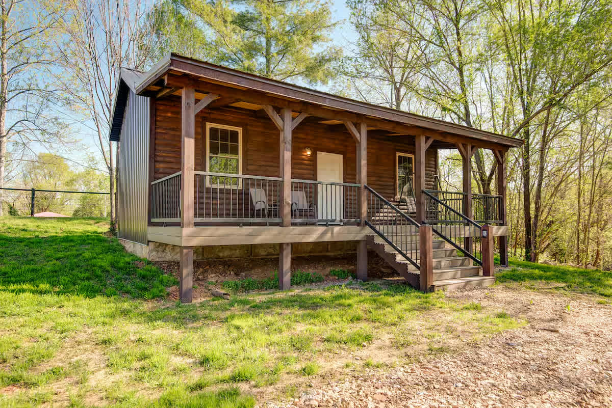 Nestled among the pines overlooking the James River, in Galena, Mo our cozy cabin offers the perfect retreat. Enjoy mornings on the porch with the soothing sounds of the river, then explore the area with a day float trip and come back to unwind by the campfire with a grill-out evening. This cabin is perfect for couples or small family that appreciates a quiet relaxing camping experience. The space This cabin features a roomy private bedroom with queen size bed and pull out sofa bed in living area, 1 full bath and kitchenette with bar style seating. Equipped with all the essentials for a comfortable stay, air conditioning, heating, refrigerator, microwave, hotplate, kcup coffee maker and smart tv it's the ideal spot for relaxation and adventure. * Firewood available close by * Local attractions worth checking out: The Farmer's Daughter Restaurant- great home style cooking with large portions, serving breakfast, lunch and dinner. Located just up the hill - you can even walk there! The Bean Counter Coffee shop- this place is a must see for anyone who enjoys history or architecture! Soak in the craftmanship of days gone by while sipping on a special brew that's sure to make your stay memorable. Just steps up the hill from our entrance James River Canoe Rental- don't want to drive anywhere to enjoy a float trip? Call Dana and she'll come pick you up and float right back to your cabin! James River Mercantile- need last minute fishing gear? Check out this new local business, just up the highway across the river. Guest access If you encounter any problems during your stay, please send me a text. Other things to note *You might hear a train during your stay *For any groups requiring several sites, please contact us for prior approval.