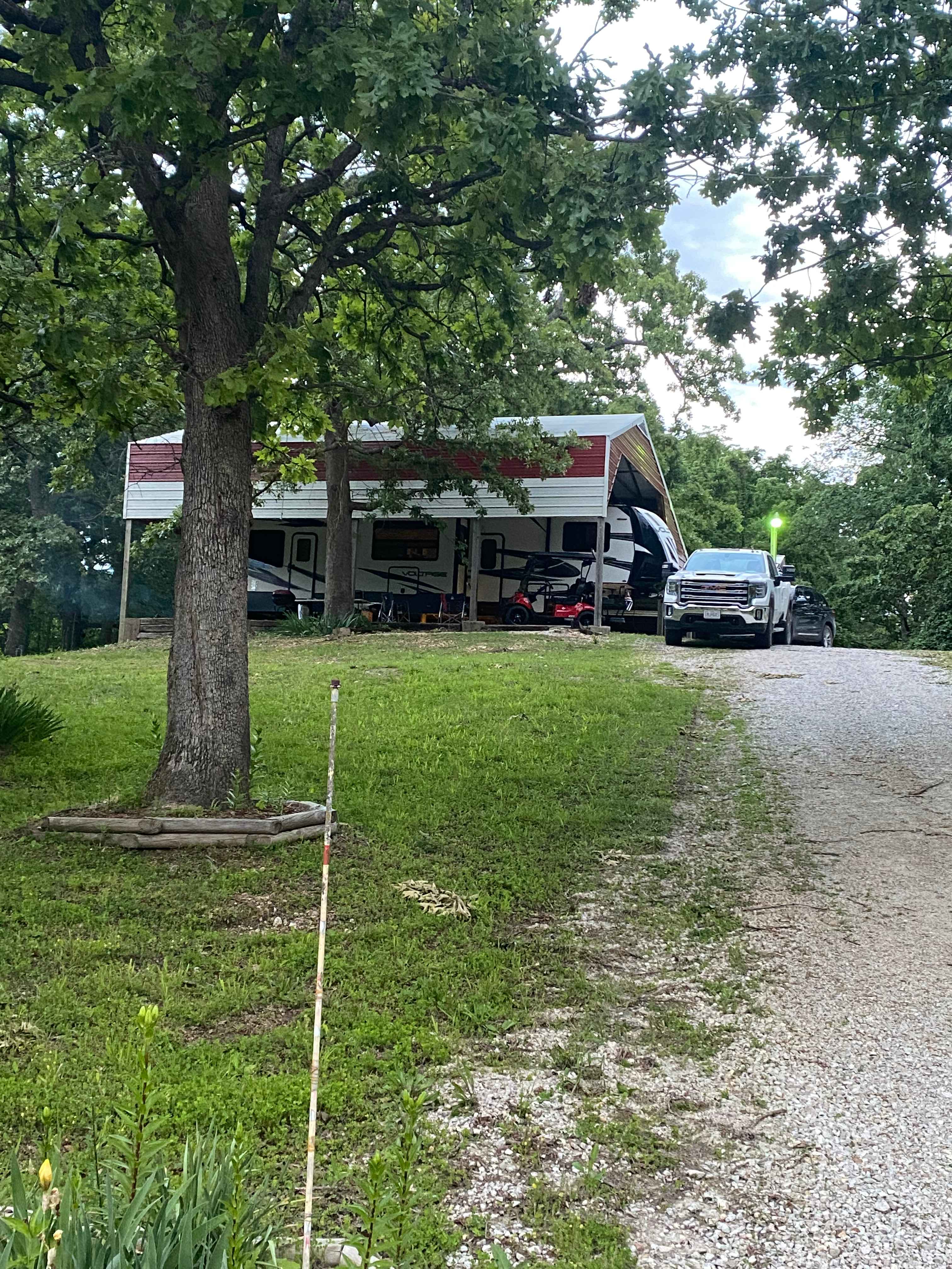 Site 1 has a 40 foot deep awning that covers full hookup abilities. Electrical, sewer and water. Plus, room to park your boat- all under cover. Fire pit, barbecue grill and fish cleaning station available for your use.