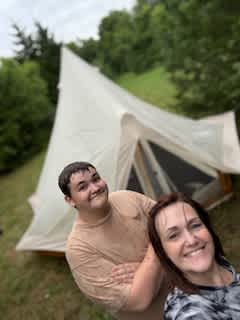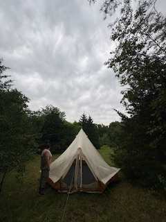 A 16' bell tent welcomes you to a night under the stars. With very few neighbors, and none that can be seen from the property, light pollution is very very low. You can see ALL the stars. It is quiet, little to no traffic on the road to the campsite. Standard ammenities included: LED lights, power bank for phone charging, outdoor shower and toilet, access to camp kitchen, first bundle of firewood included.